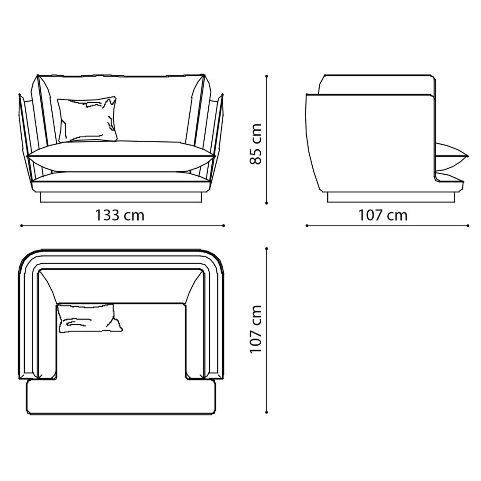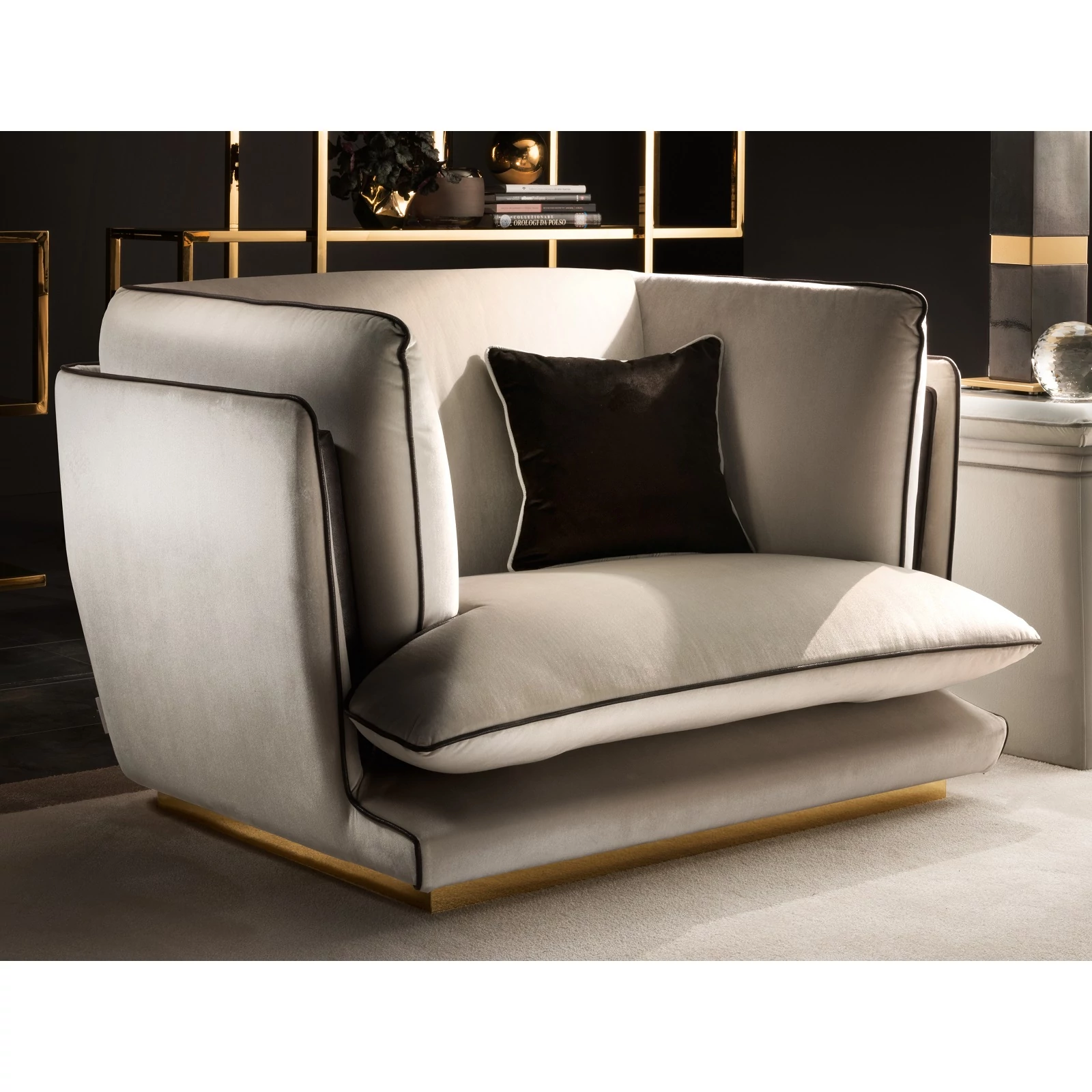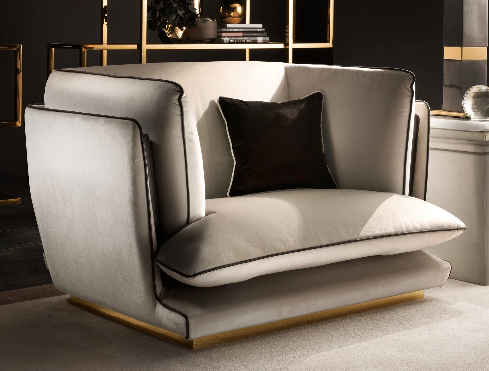 The outer coating of the couches and armchairs completely surrounds the soft inner padding, highlighting the different sizes of the elements and the softness of the materials, as well as the shape and comfort of the seat. The edges are decorated with borders sewn from contrasting fabrics, of which color can be customized by choosing from material samples. Their lower part is bordered by a shiny metal leg-part giving the pieces of furniture a little shine, which attracts everyone’s gaze.