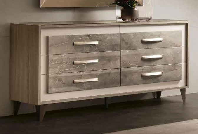 Ambra is the new Collection of the brand Adora, that includes furnishing elements for your living room, dining room and bedroom. Once again, Adora has left its unmistakable hallmark on furniture items that fly the flag for the prestige of Italian style and for the Italian flair for furniture with elegance and an inimitable contemporary flavour. The contrasting textures and the dissimilar volume effects between the different surfaces are sophisticated details that do not remain unnoticed and give character to each single furniture element. The structure of the furniture items in elm-wood finish forms an elegant contrast with the textured, open-pored doors, which are overlaid with marble-finish panels. Furnishing solutions with stylish, elegant silhouettes repeat the same contrasting effect that is enhanced by the satin-finish bronze profiles of the handles and feet. Another feature worth noting is the balance of delicate shades that add their own touch of elegance to each piece, with bright reflections from mirrored glass that, like a jewel, give luminosity to the whole furniture composition.