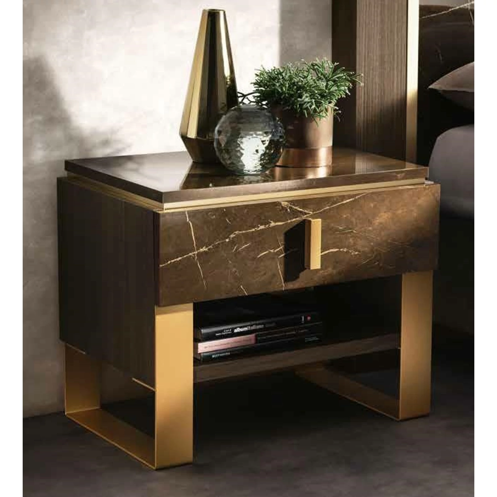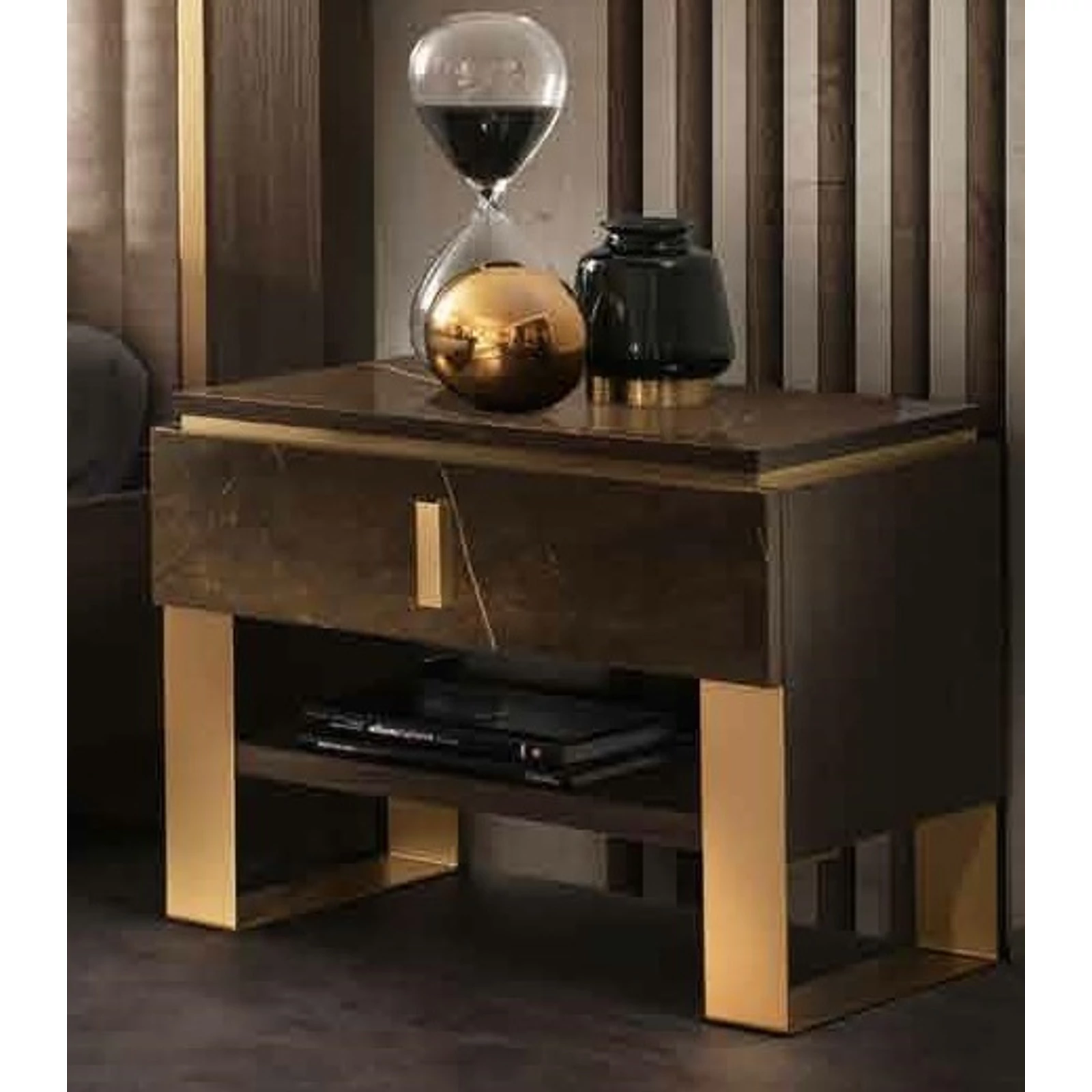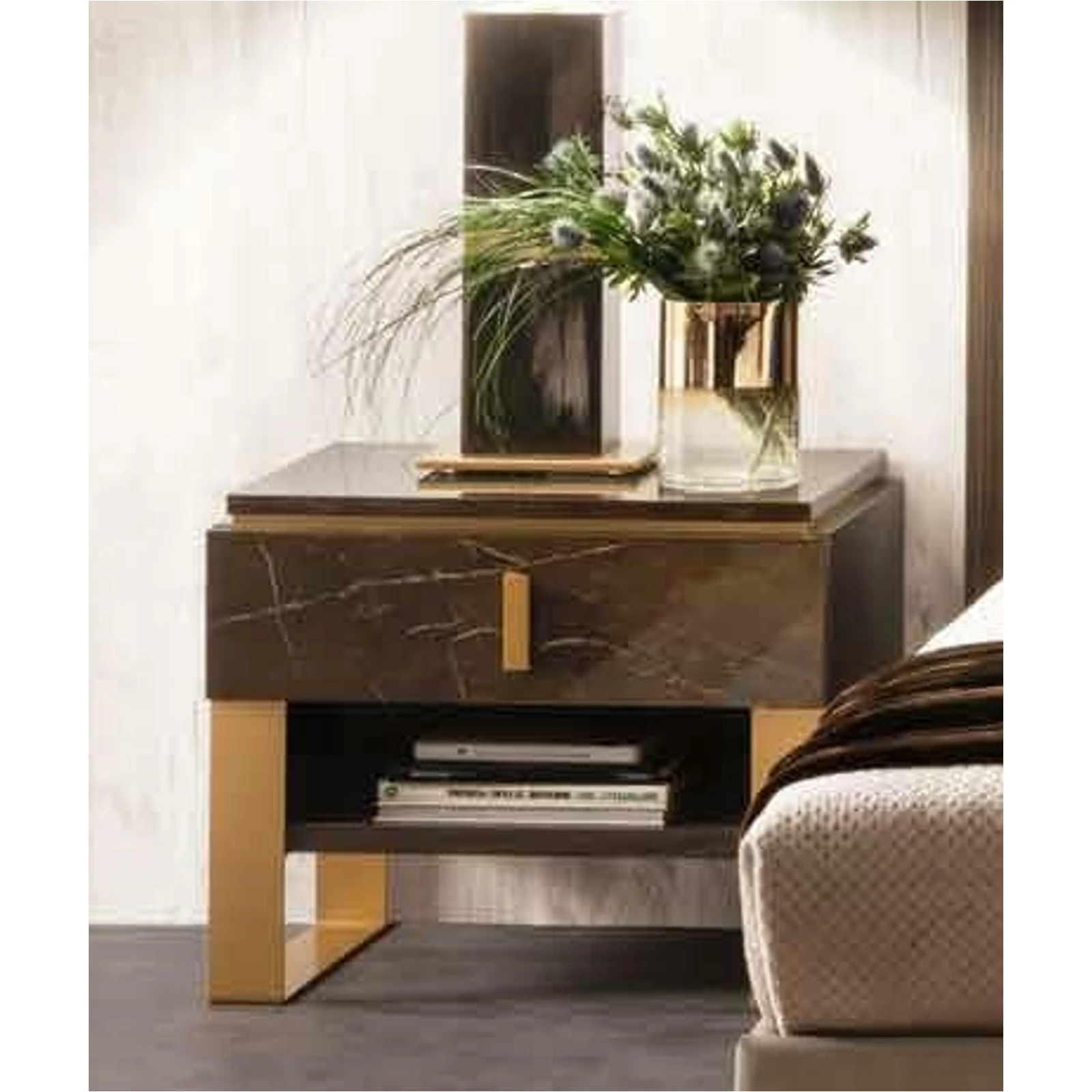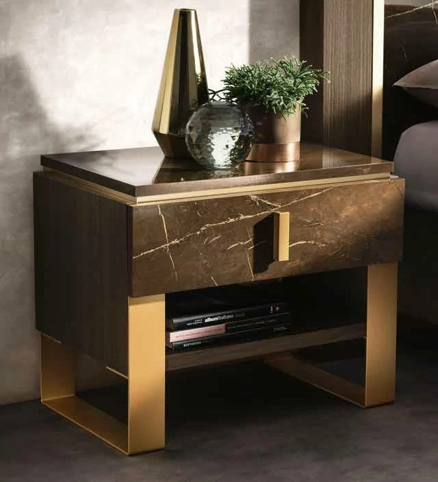 Essenza is the new Collection of the brand Adora, that includes furnishing elements for your living room, dining room and bedroom. This collection embodies contemporary elegance in small details that define the research for aesthetics, accomplished to create every piece of furniture. The concept is inspired by the classic / contemporary dualism, and by the contrasting textures of two precious finishes, embellished by elegant golden details. The contrast between the dark hues of wenge wood and the shining marble finish, with its typical bronze veins, is the leitmotiv behind this collection. The complete collection is enhanced by the satin-finish golden elements used for the metal handles of the nightstands, the frames of the display cabinets, dining room tables and living area furniture.