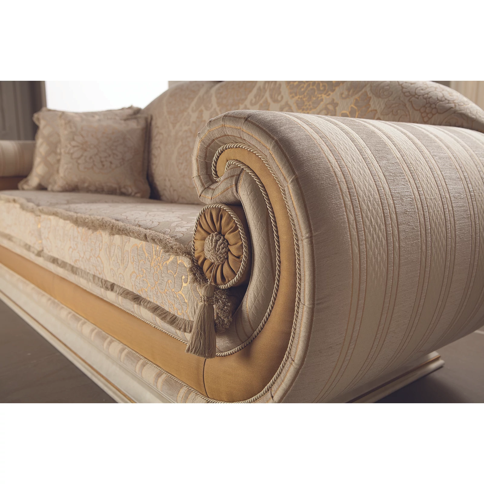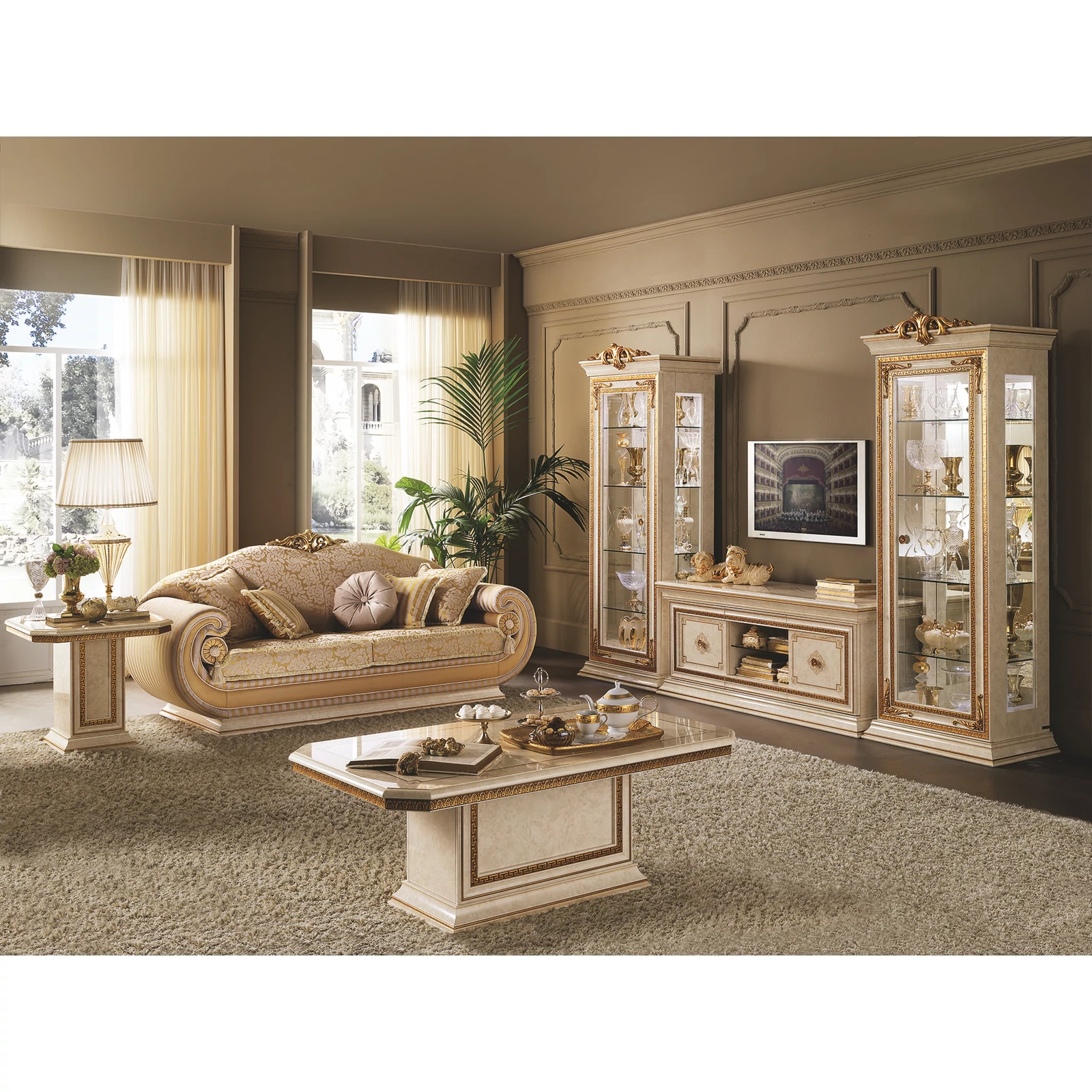 AC-LEO-COM-01TV set with crown (TV commode + 2x 1-door display cabinet)AC-LEO-TAV-05Coffee tableAC-LEO-TAV-06Lamp tableAC-LEO-DV3-01BTriple couch with cylindrical cushions with Cat. B fabricAC-LEO-CUS-01BCushion 40x40 cm with Cat. B fabricAC-LEO-CUS-02BCushion 50x50 cm with Cat. B fabricAC-LEO-CUS-04BRound cushion with Cat. B fabric