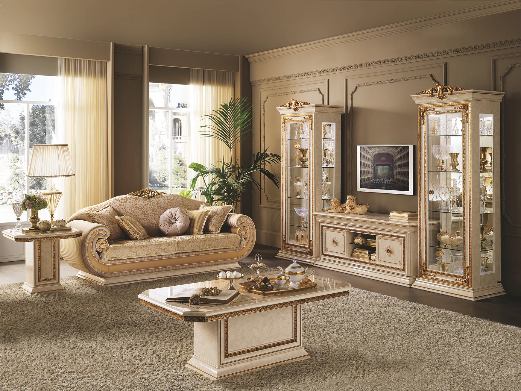 AC-LEO-COM-01TV set with crown (TV commode + 2x 1-door display cabinet)AC-LEO-TAV-05Coffee tableAC-LEO-TAV-06Lamp tableAC-LEO-DV3-01ETriple couch with cylindrical cushions with Cat. Extra fabricAC-LEO-CUS-01ECushion 40x40 cm with Cat. Extra fabricAC-LEO-CUS-02ECushion 50x50 cm with Cat. Extra fabricAC-LEO-CUS-04ERound cushion with Cat. Extra fabric