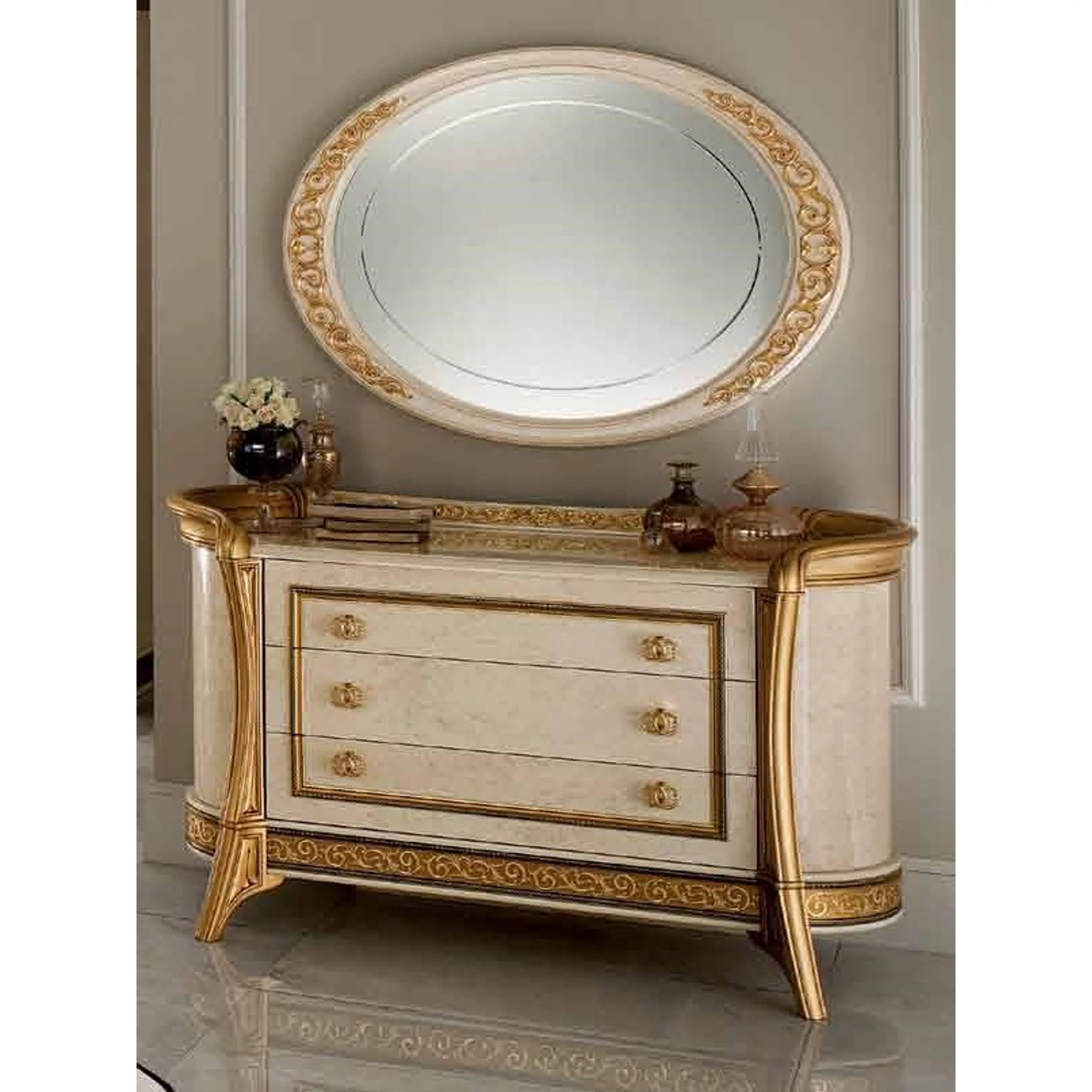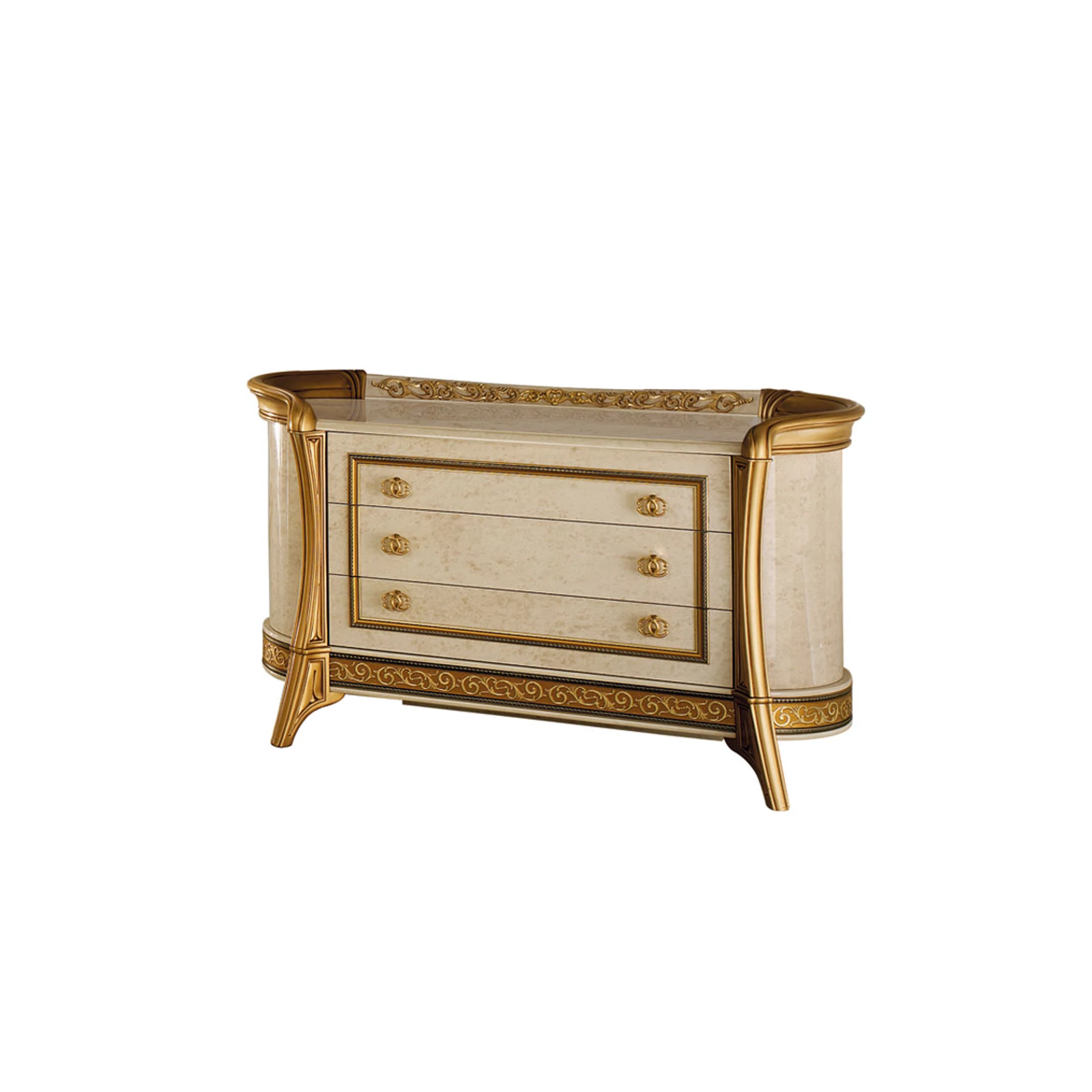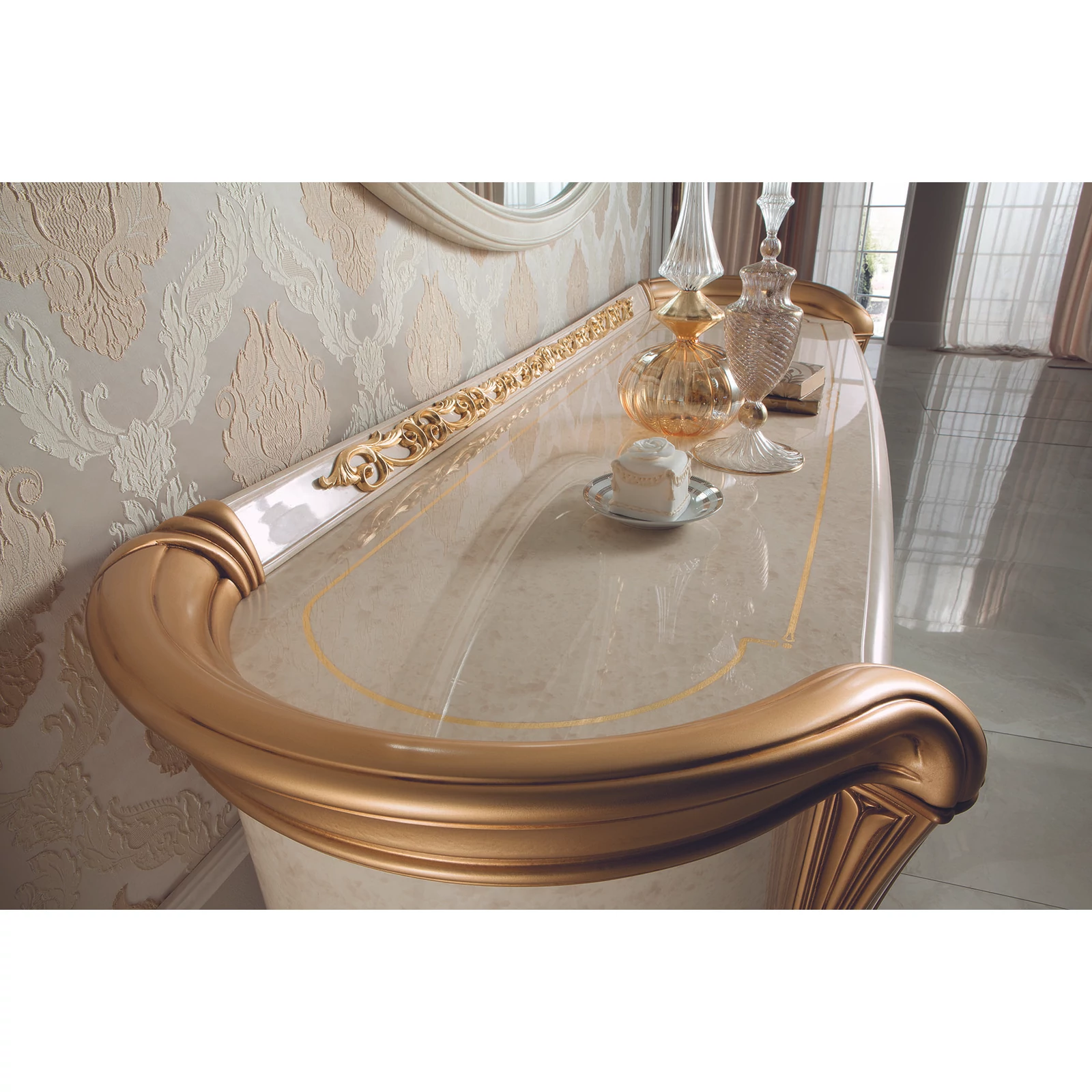 With its Melodia model, ArredoClassic presents an unreleased work composed from the notes of immortal Italian elegance. Italian craftsmen created a new, romantic style with beautiful gold columns, that embrace and emphasize the shapes with soft lines. The delicate and extremely elegant white-melange color reminds us of the prestige of polished marble. Learned and experienced creators have simultaneously created a product range of stunning beauty and at the same time extremely practical.