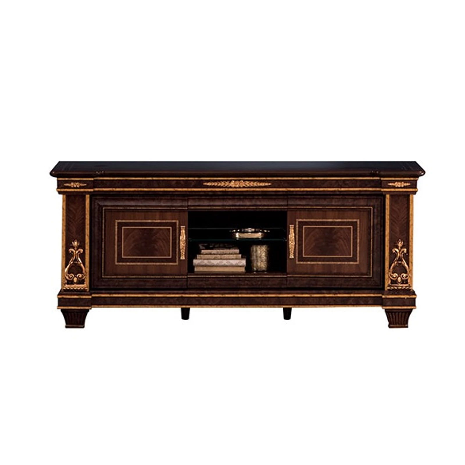 Decorated with precious inlays, the buffet chest of drawers and the majestic appearance of the mirror adorned above it are truly spectacular. The display cabinet’s gorgeous side pillars are adorned with feather-patterned mahogany inserts, and the top and bottom are adorned with handmade gold smoke plate decorations. The harmonizing shape of the armchairs and couches, as well as the simple lines of the wall furniture elements such as the hanging TV wall panel, complement each other perfectly. Hospitable, maximally sophisticated and at the same time practical: the triple couch can also be converted into a magnificent guest bed for visitors. The Modigliani collection is complemented by a desk with a chest of drawers in the study, with an elegant leather-covered office armchair. The gilded side pillars and the crown motifs decorated with the gold smoke plate harmoniously connect each element of the collection. Valuable fabrics, careful elaboration in every detail and high-quality materials symbolize the typical Italian taste.