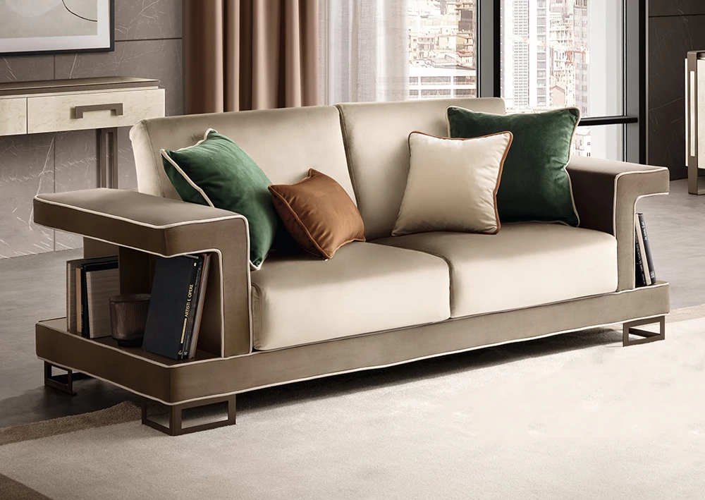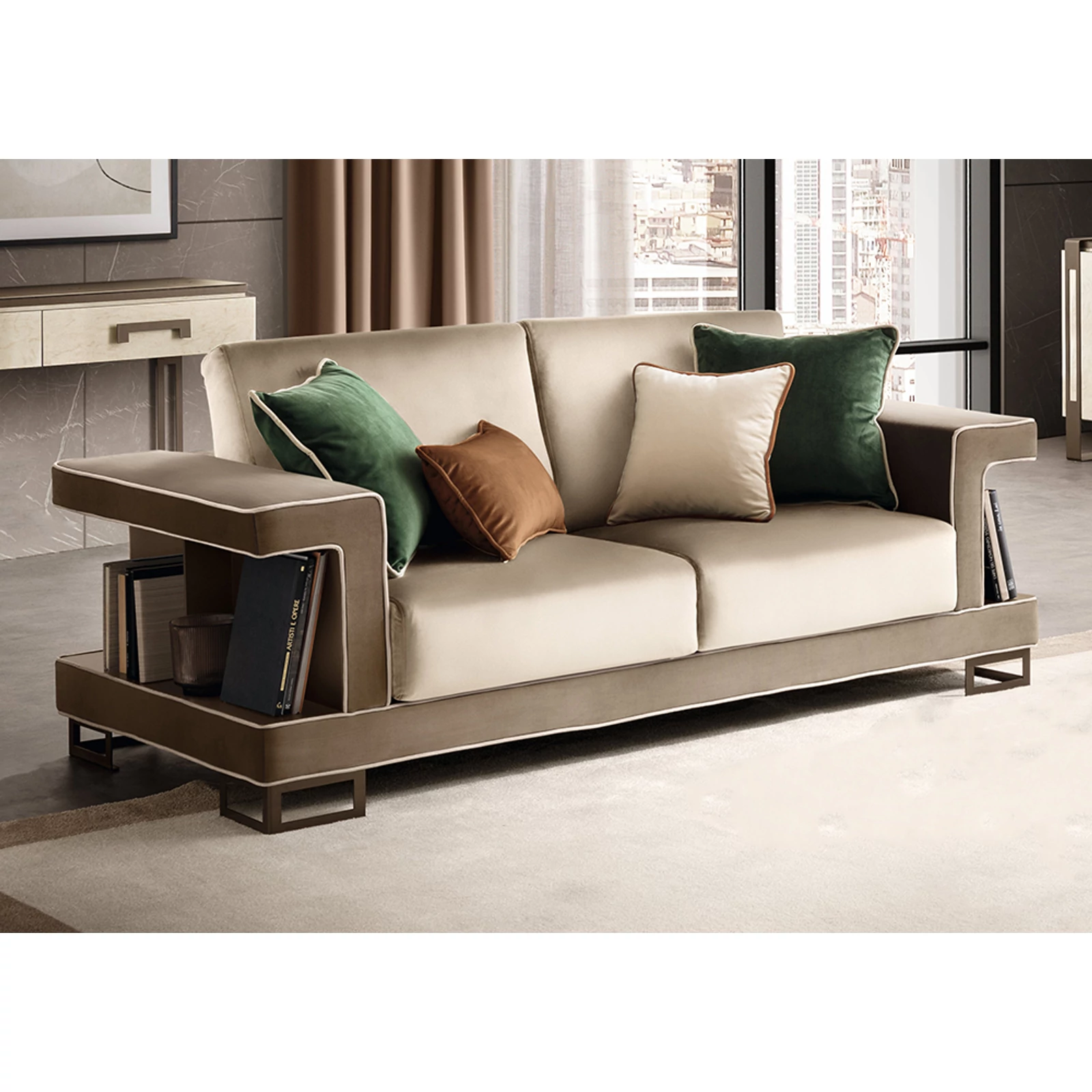 Poesia bears the signature of the Adora brand and is composed of complements designed to furnish the living room, dining room and bedroom. A refined collection in which every piece of furniture is a metaphor for Made-in-Italy beauty and elegance. Minimalist details meet sophisticated materials in a fusion of refined character. With Poesia, contemporary style acquires a new image, thanks to its attractive geometries, special finishes and contrasting materials. Emperador Dark effect screen-printed glass tops, doors in glossy beige marble finish with slight color variations, and metal handles in warm bronze shades are precious details that enrich each element and constitute the leitmotif of the entire collection. The square shapes of the furniture and seats appear linear and graceful, providing a play of volumes and softness that integrate comfort, aesthetics and functionality. Linearity, essentiality and a touch of boldness are Poesia’s stylistic hallmarks. This is where the true poetry of this collection lies: in its ability to convey the value of Italian furniture, by creating cozy and comfortable furnishing scenarios.