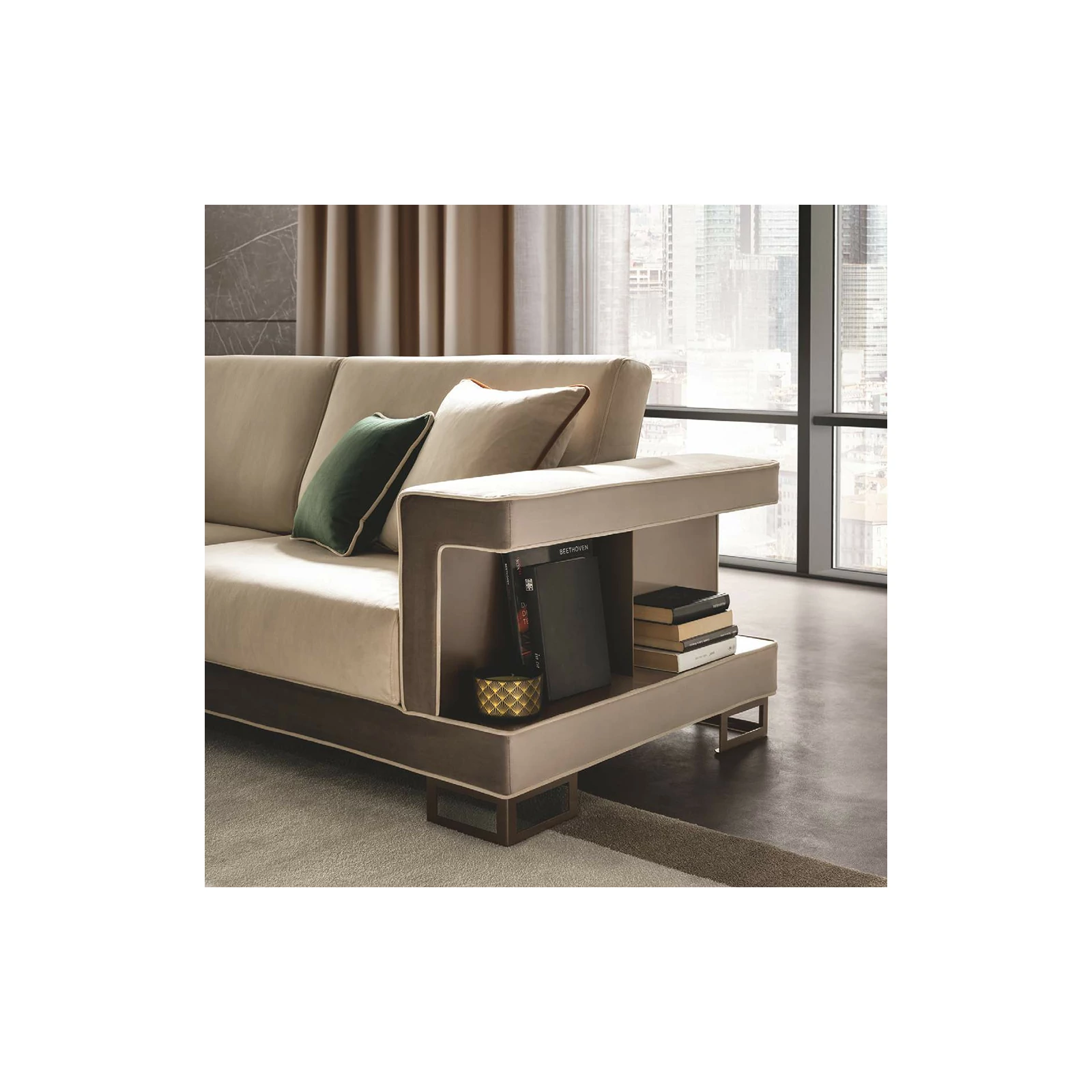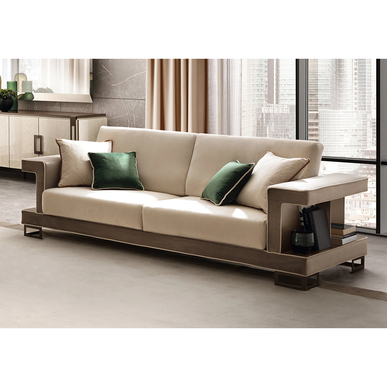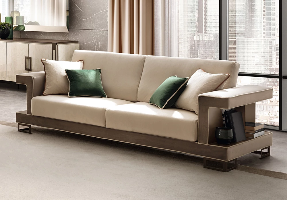 Poesia bears the signature of the Adora brand and is composed of complements designed to furnish the living room, dining room and bedroom. A refined collection in which every piece of furniture is a metaphor for Made-in-Italy beauty and elegance. Minimalist details meet sophisticated materials in a fusion of refined character. With Poesia, contemporary style acquires a new image, thanks to its attractive geometries, special finishes and contrasting materials. Emperador Dark effect screen-printed glass tops, doors in glossy beige marble finish with slight color variations, and metal handles in warm bronze shades are precious details that enrich each element and constitute the leitmotif of the entire collection. The square shapes of the furniture and seats appear linear and graceful, providing a play of volumes and softness that integrate comfort, aesthetics and functionality. Linearity, essentiality and a touch of boldness are Poesia’s stylistic hallmarks. This is where the true poetry of this collection lies: in its ability to convey the value of Italian furniture, by creating cozy and comfortable furnishing scenarios.