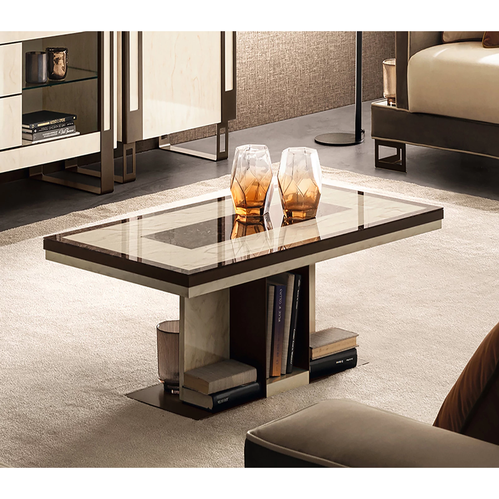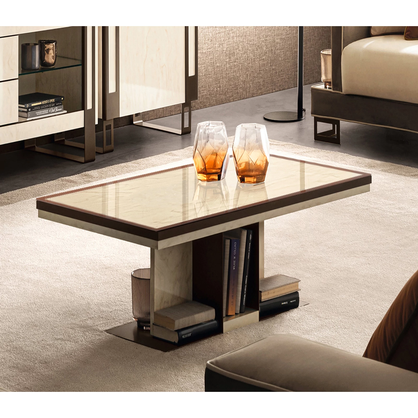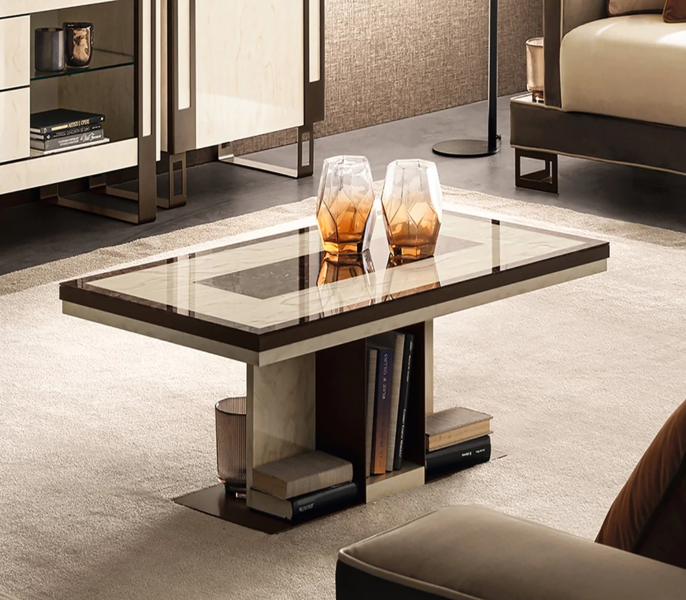 Poesia bears the signature of the Adora brand and is composed of complements designed to furnish the living room, dining room and bedroom. A refined collection in which every piece of furniture is a metaphor for Made-in-Italy beauty and elegance. Minimalist details meet sophisticated materials in a fusion of refined character. With Poesia, contemporary style acquires a new image, thanks to its attractive geometries, special finishes and contrasting materials. Emperador Dark effect screen-printed glass tops, doors in glossy beige marble finish with slight color variations, and metal handles in warm bronze shades are precious details that enrich each element and constitute the leitmotif of the entire collection. The square shapes of the furniture and seats appear linear and graceful, providing a play of volumes and softness that integrate comfort, aesthetics and functionality. Linearity, essentiality and a touch of boldness are Poesia’s stylistic hallmarks. This is where the true poetry of this collection lies: in its ability to convey the value of Italian furniture, by creating cozy and comfortable furnishing scenarios.