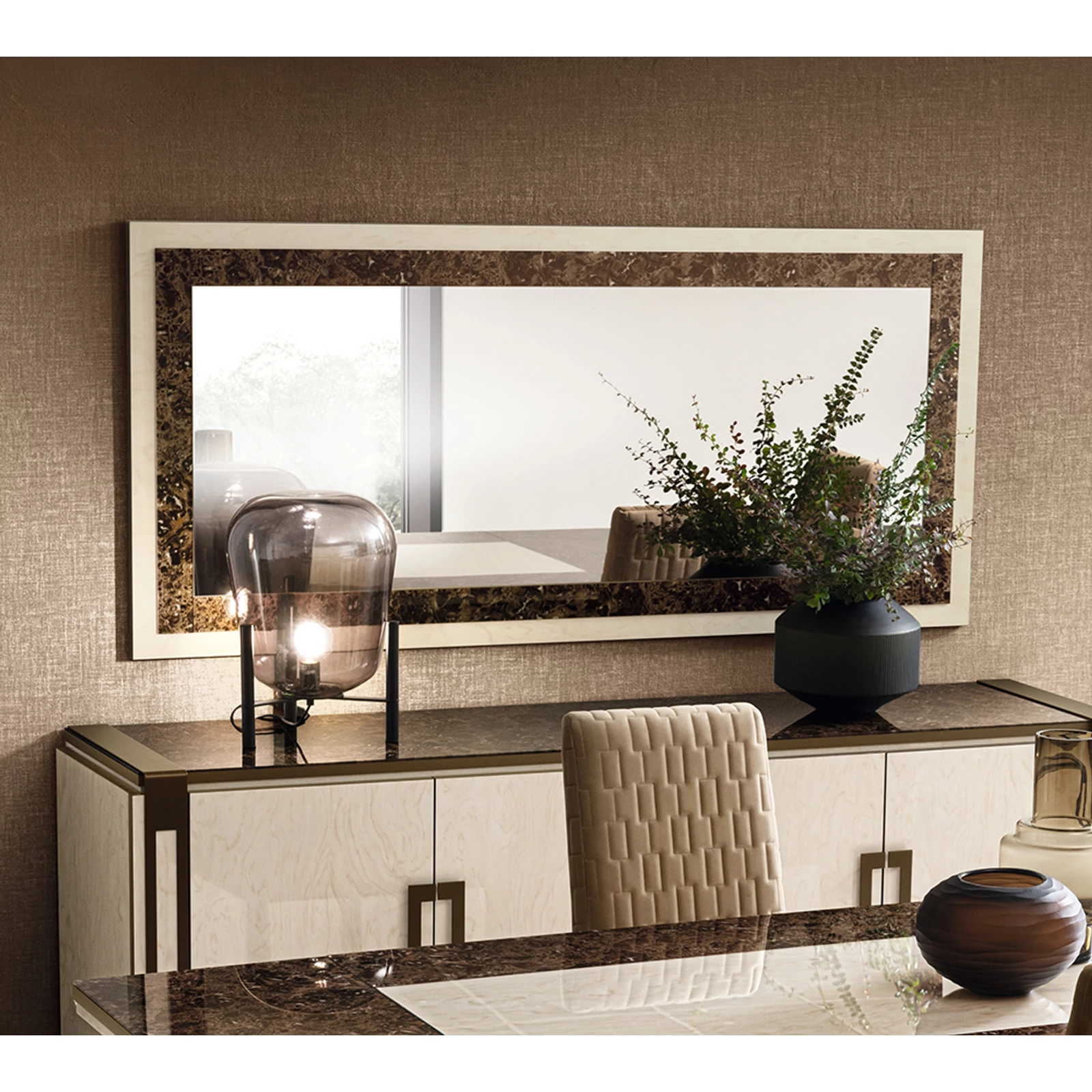 Poesia bears the signature of the Adora brand and is composed of complements designed to furnish the living room, dining room and bedroom. A refined collection in which every piece of furniture is a metaphor for Made-in-Italy beauty and elegance. Minimalist details meet sophisticated materials in a fusion of refined character. With Poesia, contemporary style acquires a new image, thanks to its attractive geometries, special finishes and contrasting materials. Emperador Dark effect screen-printed glass tops, doors in glossy beige marble finish with slight color variations, and metal handles in warm bronze shades are precious details that enrich each element and constitute the leitmotif of the entire collection. The square shapes of the furniture and seats appear linear and graceful, providing a play of volumes and softness that integrate comfort, aesthetics and functionality. Linearity, essentiality and a touch of boldness are Poesia’s stylistic hallmarks. This is where the true poetry of this collection lies: in its ability to convey the value of Italian furniture, by creating cozy and comfortable furnishing scenarios.