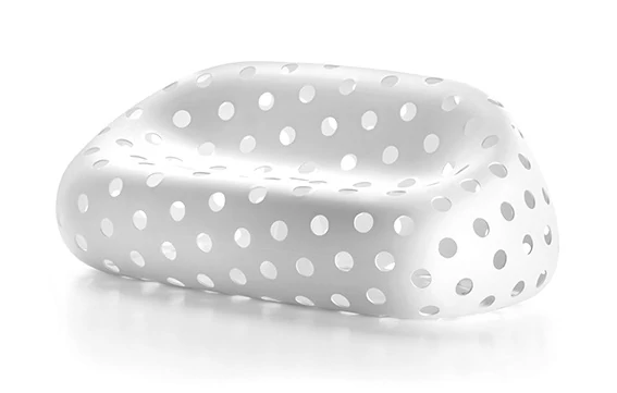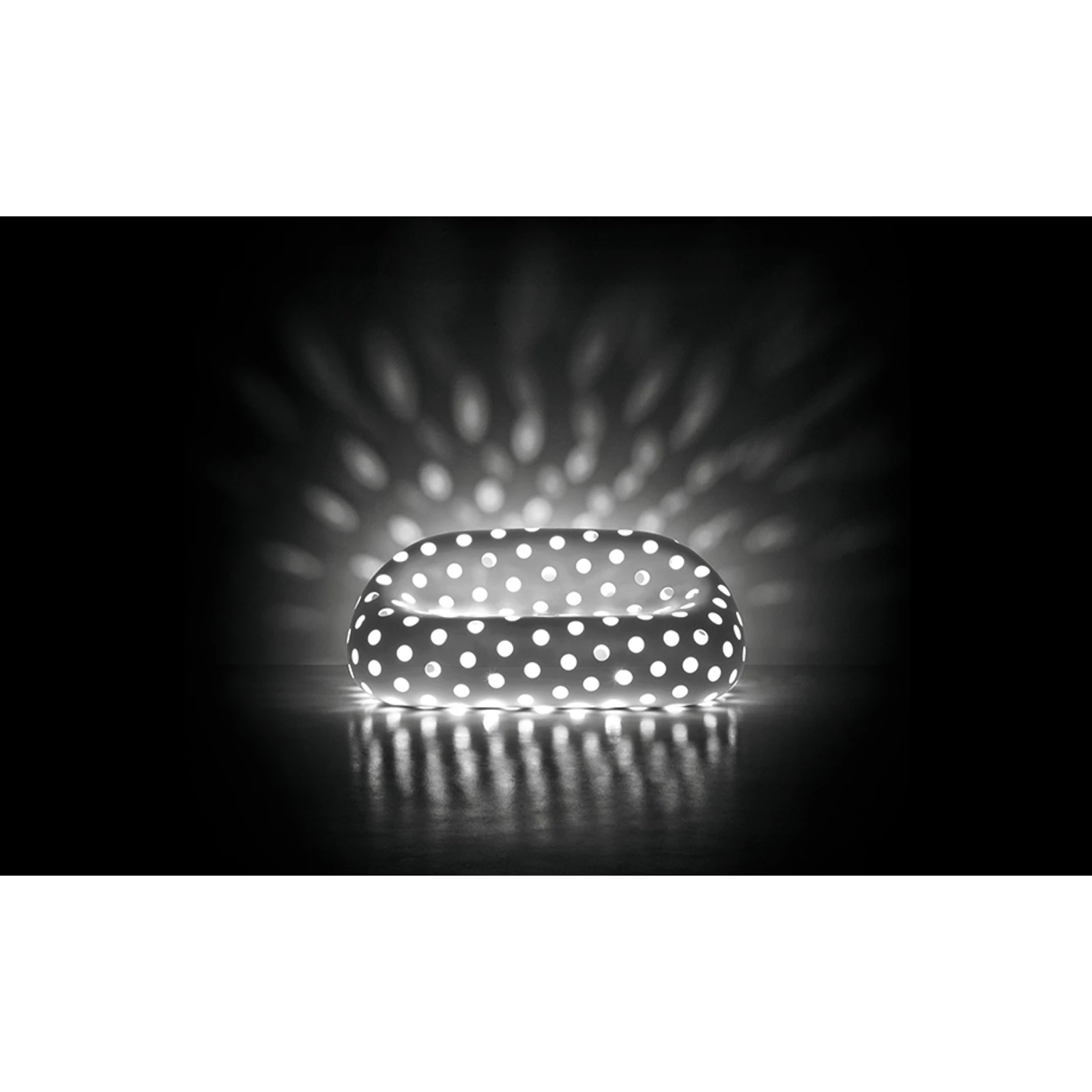 A 2-3-seater sofa deriving from the "Gumball" family has great impact and are suitable for rooms that require solutions with great character, is paired with the armchair, it creates an eye-catching relaxation area. The openings on the opaque surface give unrivalled lightness for this kind of furniture. It can be equipped with two RGB lighting kit, which, thanks to their vast range of colours, creates light effects of strong emotional impact.