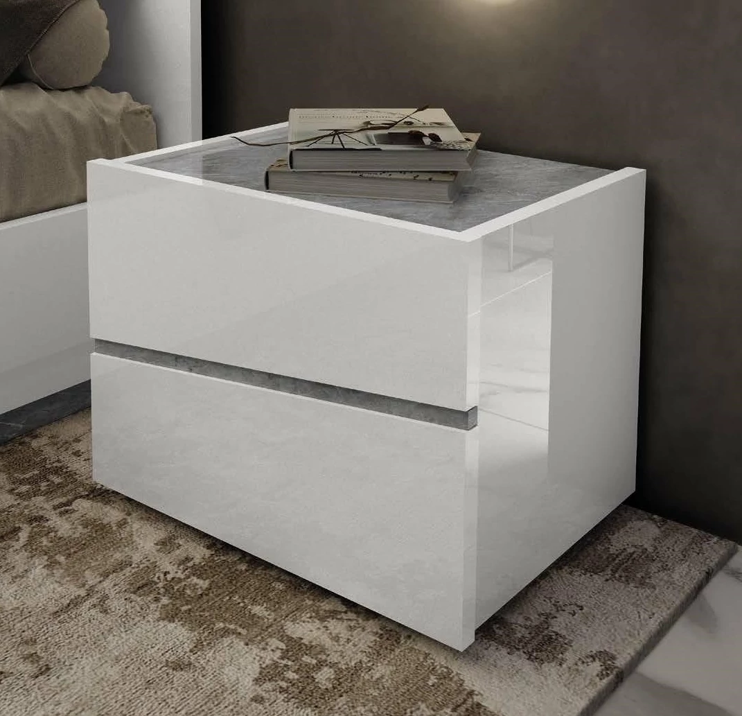 The youthful bedroom that lights up your space with the elegant tones of Carrara marble. Geometric, clean lines are enhanced by the oblique cuts, making model Alba a great choice for both minimalistic and sophisticated interiors. The luminous white and Carrara marble finish of the tops and the inserts between the drawer fronts are smartly coupled together. The natural LED diffused lighting (4000°K) with dimmer touch sensor is standard and the switches are located on the sides of the headboard.