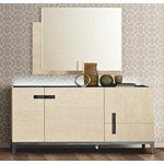 Wood particle panels veneered with metallized sand colour birch melamine. High-gloss polyester lacquer coating with anti yellowing treatment and uv (ultra violet) drying.