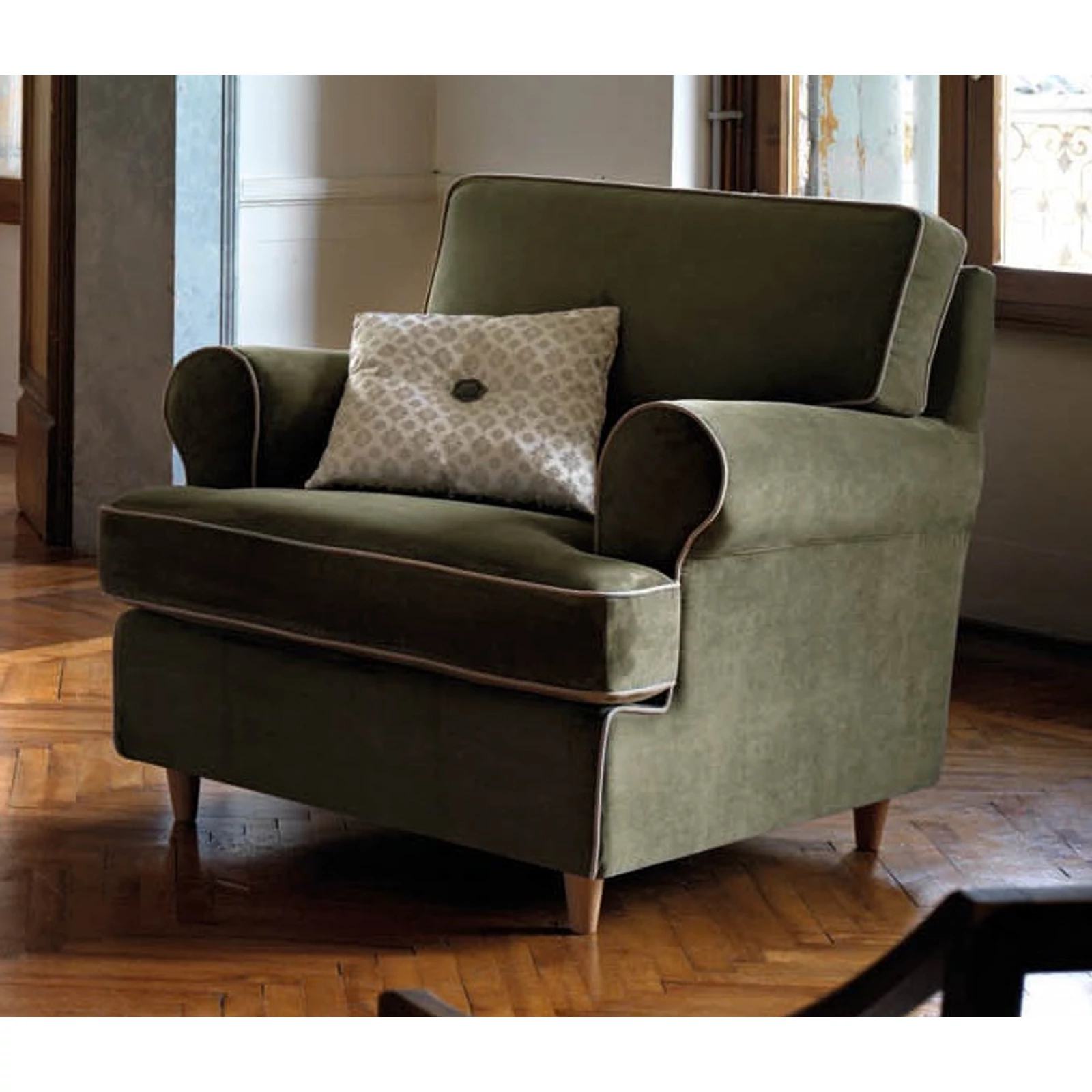 The soothing shapes of the Atena armchair, with kindness and charm, fill the very idea of design. The perfect harmony of forms and the heightened attention to detail captivate every gaze. The rounded armrests and timeless lines are perfectly highlighted by the defined piping. A model belonging to the Samoa Classic collection.