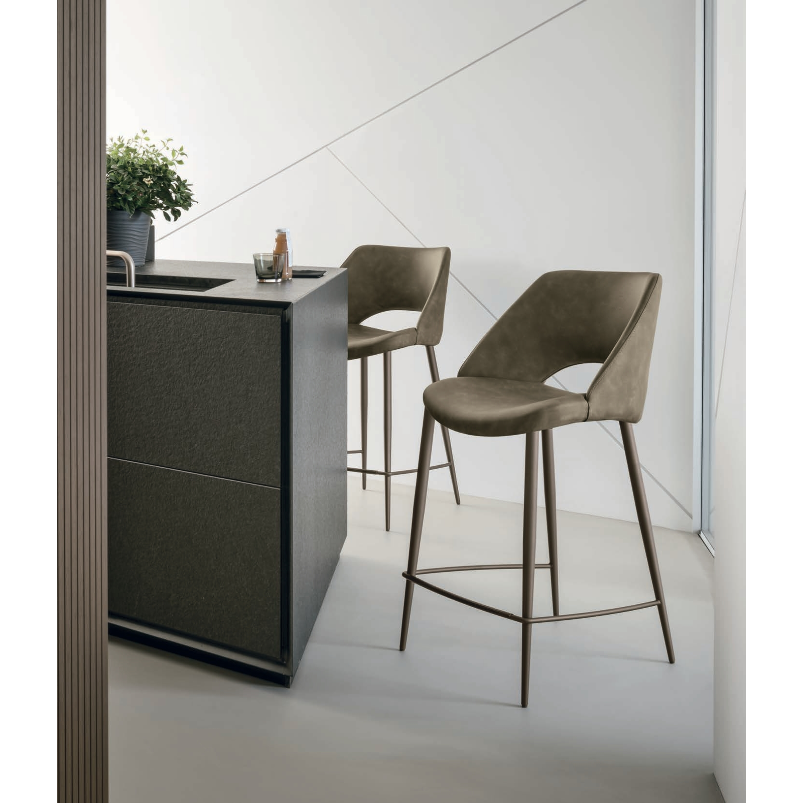The Arisa bar stool retains the collection’s bold, recognizable shapes and enveloping comfort. The uniquely cut backrest pairs elegantly with tapered legs, whose height lends a slender, airy silhouette to this modern, high-quality Italian stool. Customize it to your personal taste with the huge selection of fabrics.