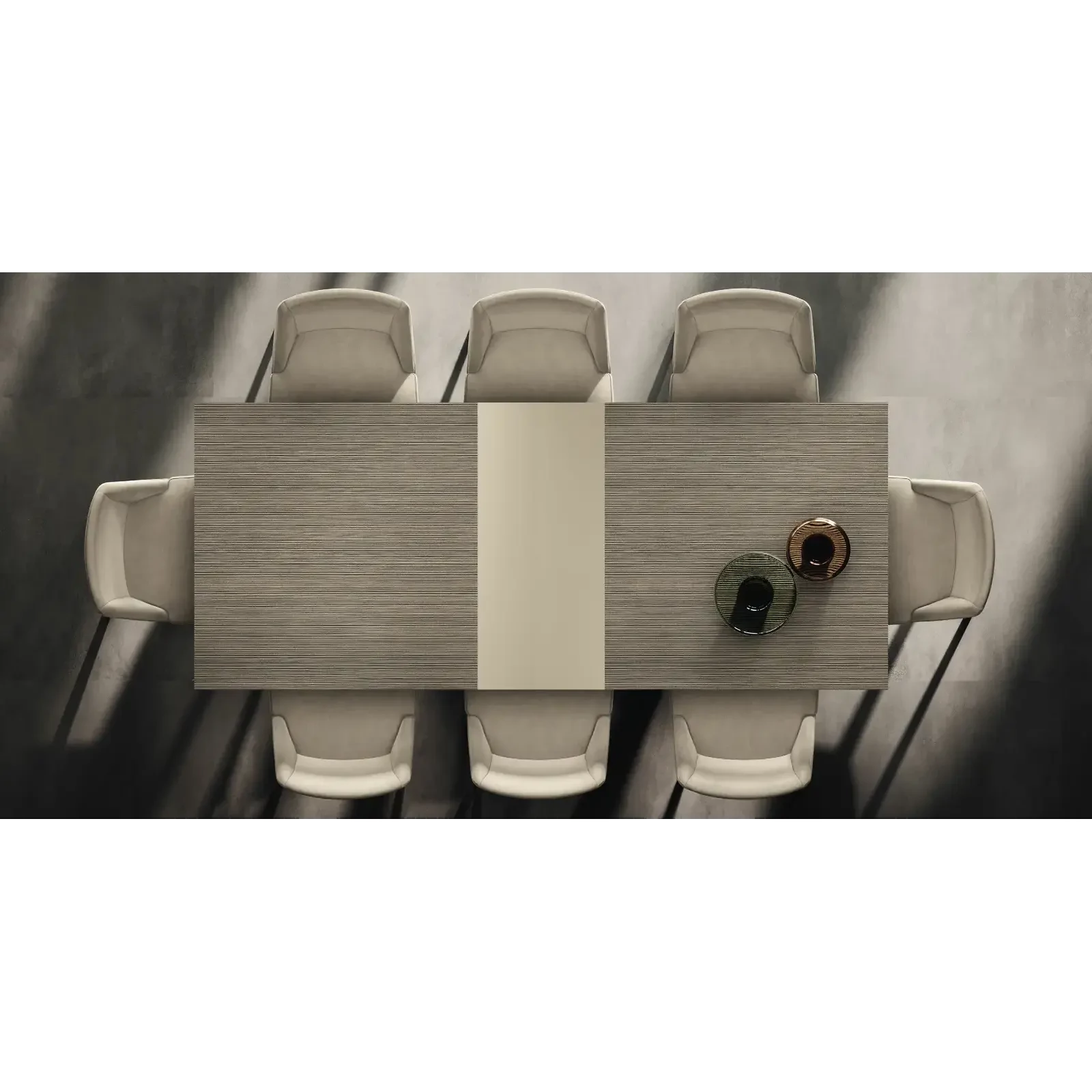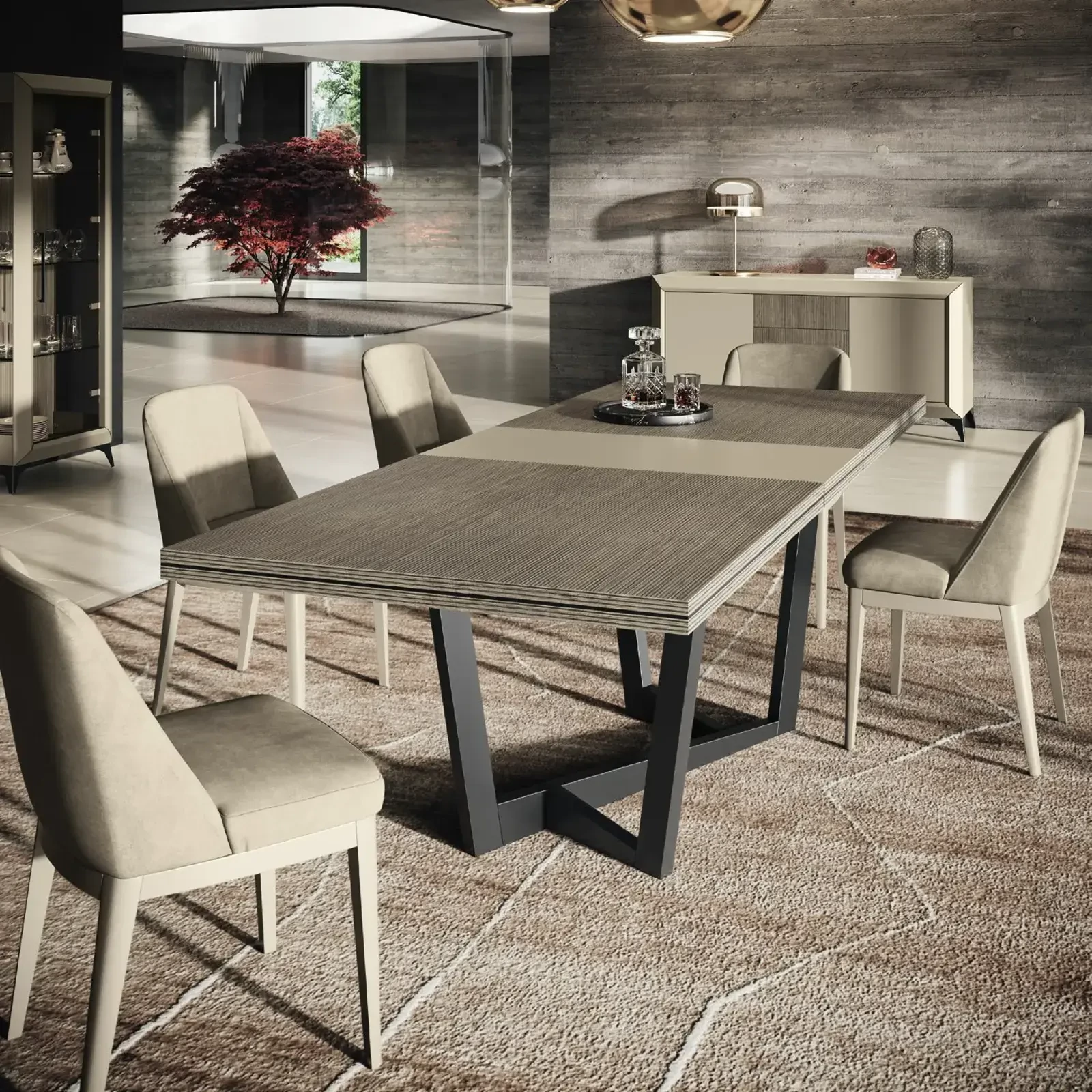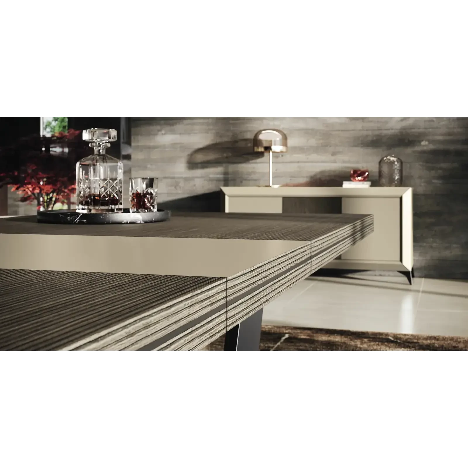 The Prestige Day collection embodies the essence of modern Italian elegance, where refined details and premium materials meet in perfect harmony. Every element of the collection – from dining tables to display cabinets, sideboards, TV units, and coffee tables – represents the union of luxury and functionality. The contrast between the rich Tobacco Canetè surfaces and the velvety Urban Velvet details creates a warm, distinctive atmosphere where clean lines and glossy finishes coexist beautifully.