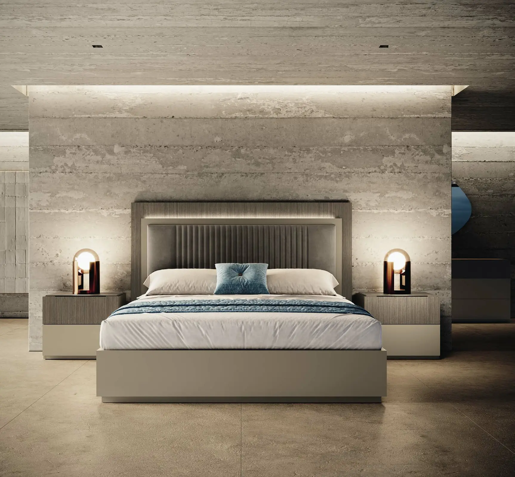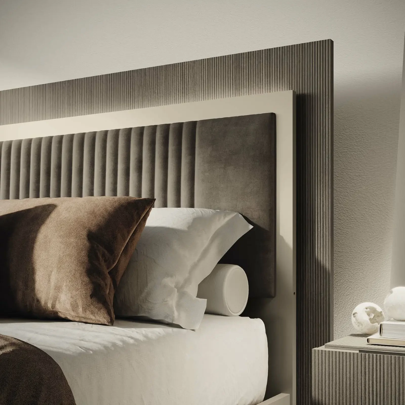 Silky textures, rhythmic surfaces, and clean shapes – in Essenza, both visual and tactile experiences play a role. A collection that invites and inspires, turning your bedroom into a true island of tranquility and beauty.