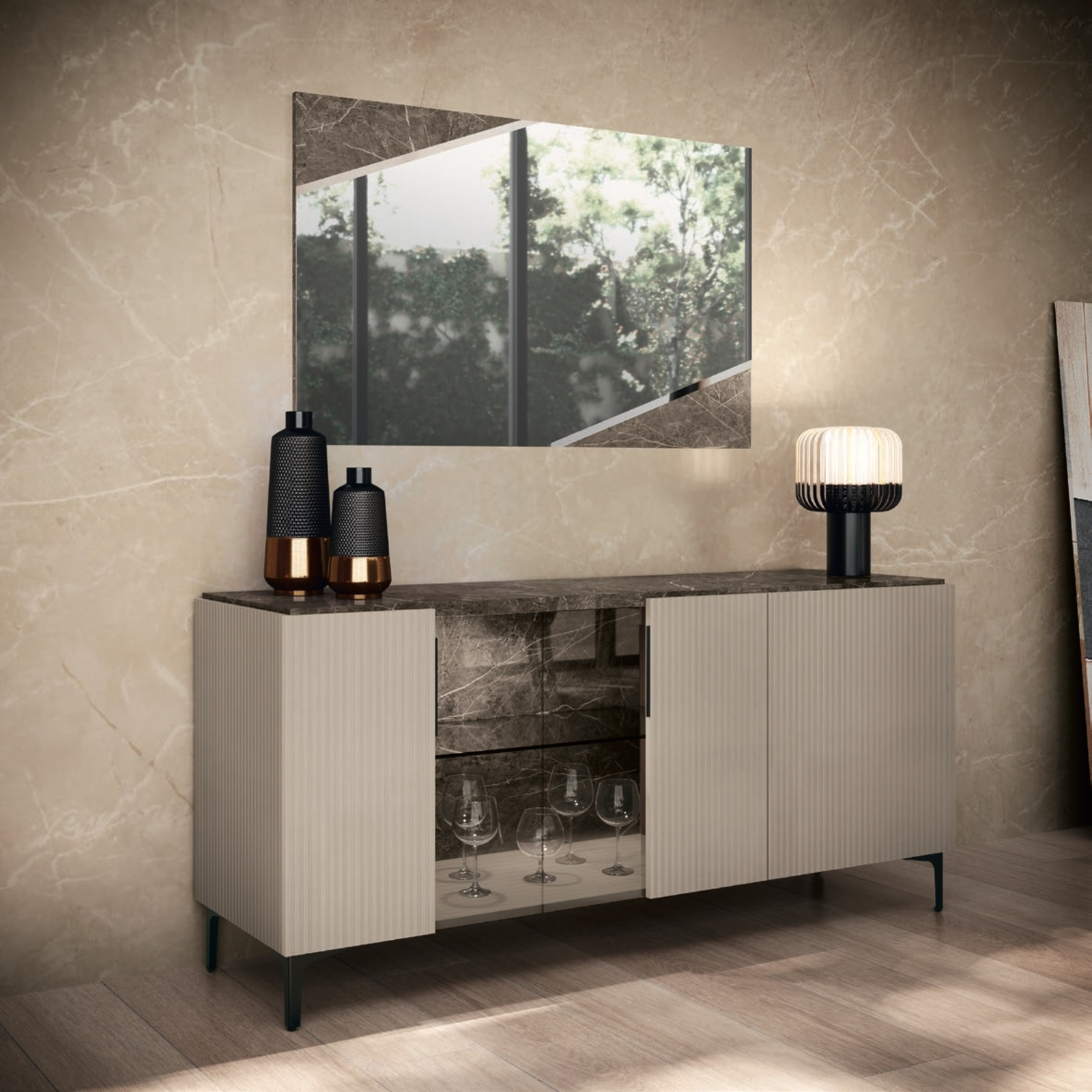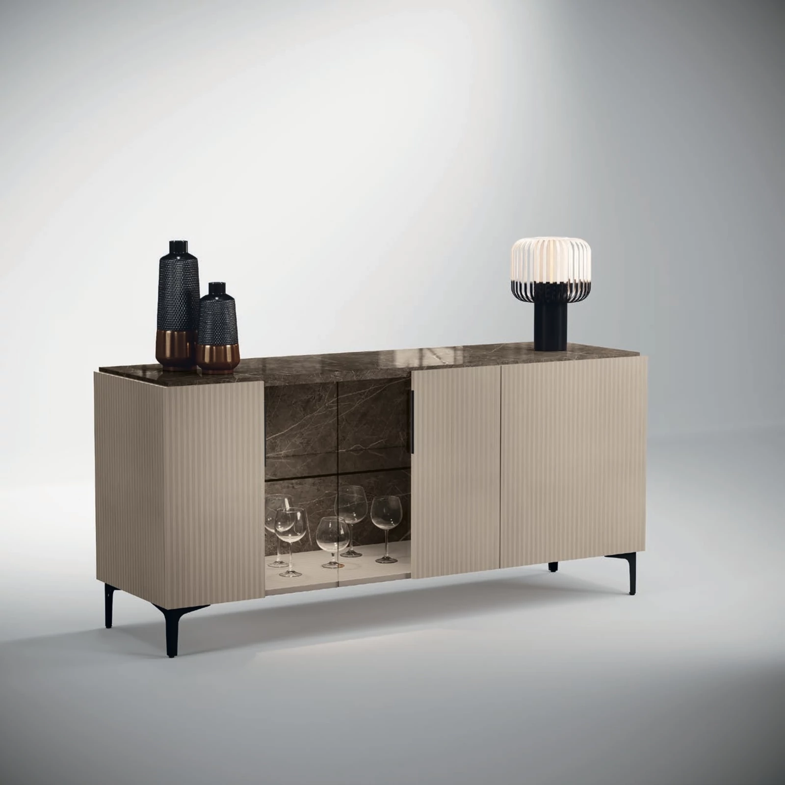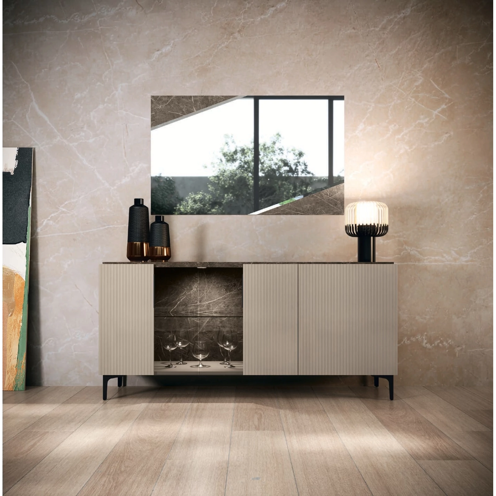CA Lusso Day Modern Beige-Marble Buffet Chest with LED Light, 3-Doors