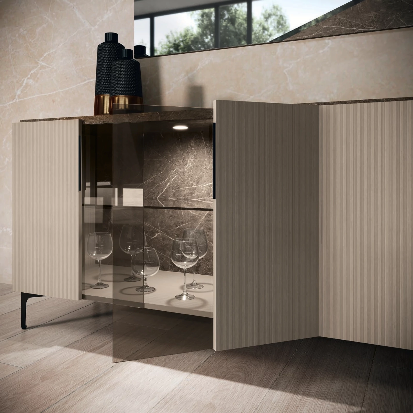 The Lusso sideboard combines Italian design with high-quality craftsmanship, featuring a glass-door compartment with dimmable LED lighting. This modern and stylish piece adds functional storage and an ambient glow, perfect for dining or living spaces.