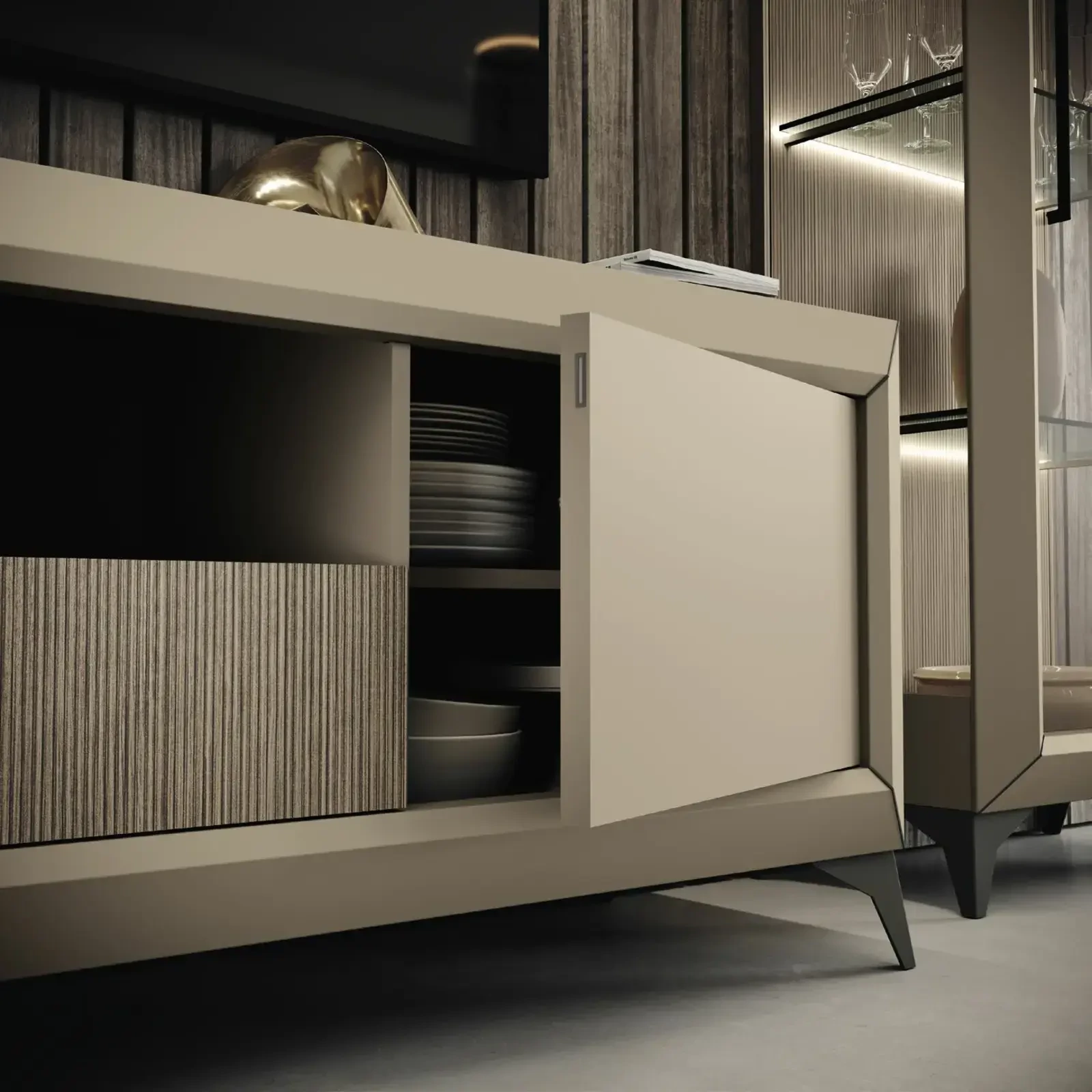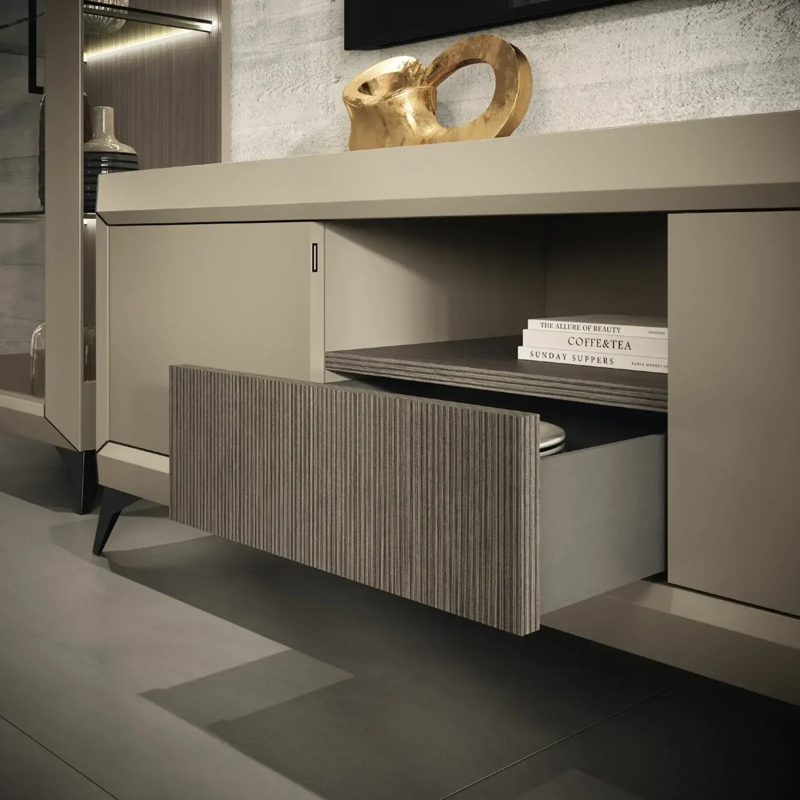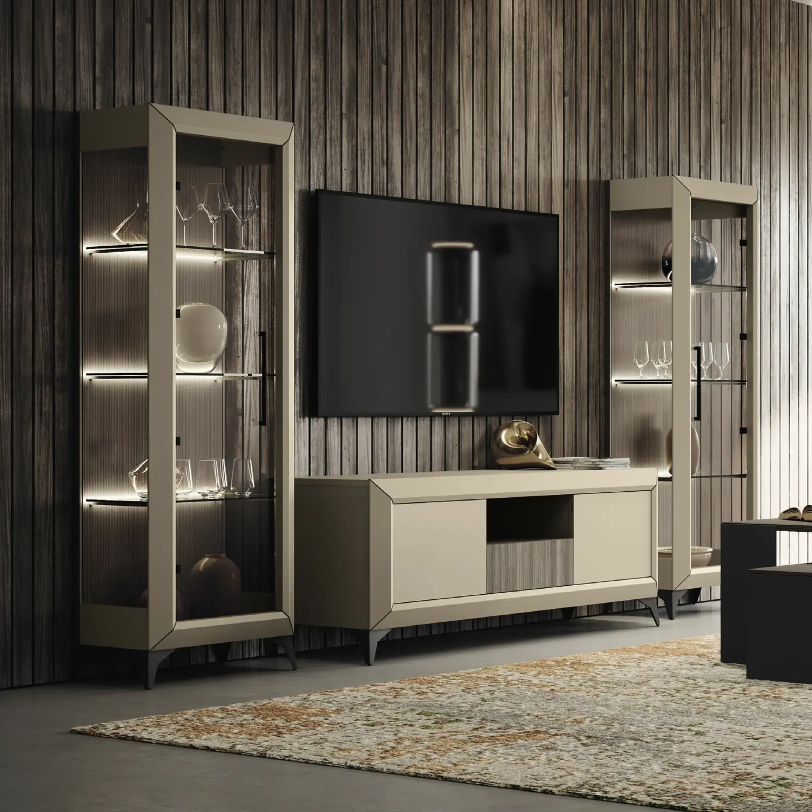 The Prestige Day TV cabinet set embodies modern Italian design and a harmonious living space. The set includes a spacious TV cabinet and two single-door display cabinets, forming an elegant yet functional composition. The warm-toned surfaces, finely ribbed textures, and integrated LED lighting create a refined atmosphere that feels both welcoming and sophisticated.