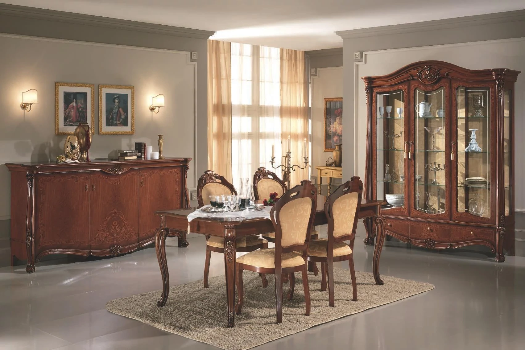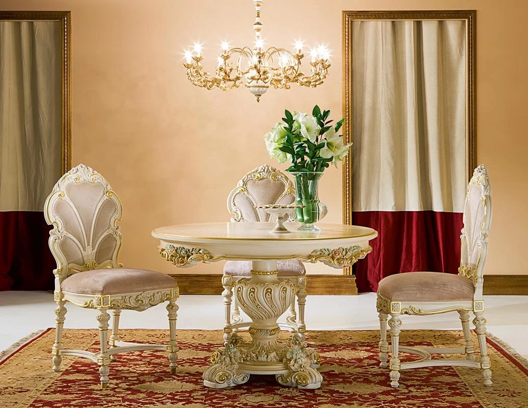 The production of castle furniture involves the use of exquisite materials such as solid oak, beech, tanganyika, or premium fiberboards that are EU-compliant and emission-free. Surfaces are often adorned with hand gilding, painted ornamentation, silk-gloss lacquers, or polished veneers. Thus, Baroque furniture is not only visually stunning but also exceptionally durable. The essence of Italian craftsmanship reveals itself in every detail — from a hand-carved leg to an ornate molding or gilded handle. These timeless pieces never go out of fashion; instead, they are cherished and passed down through generations as valuable heirlooms.