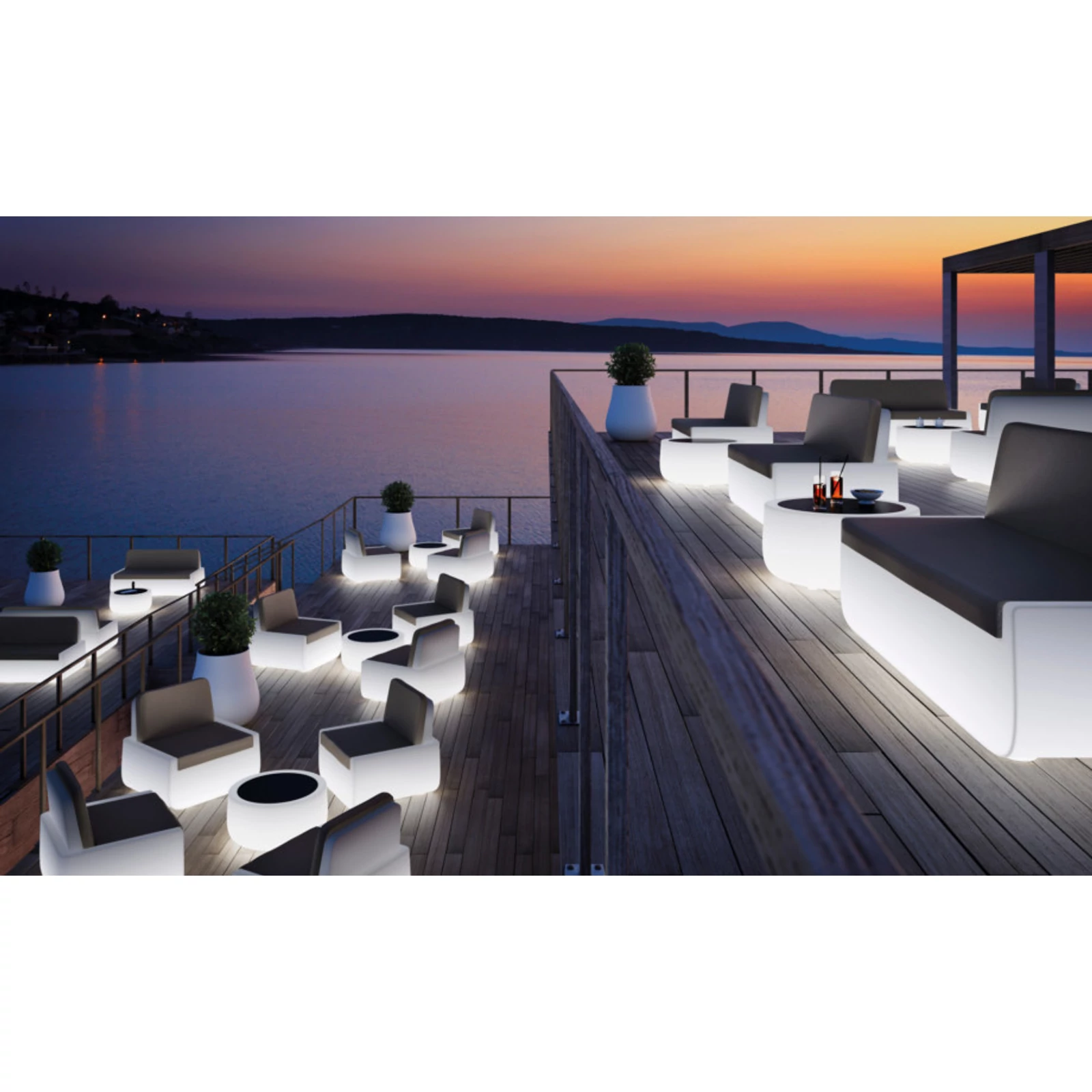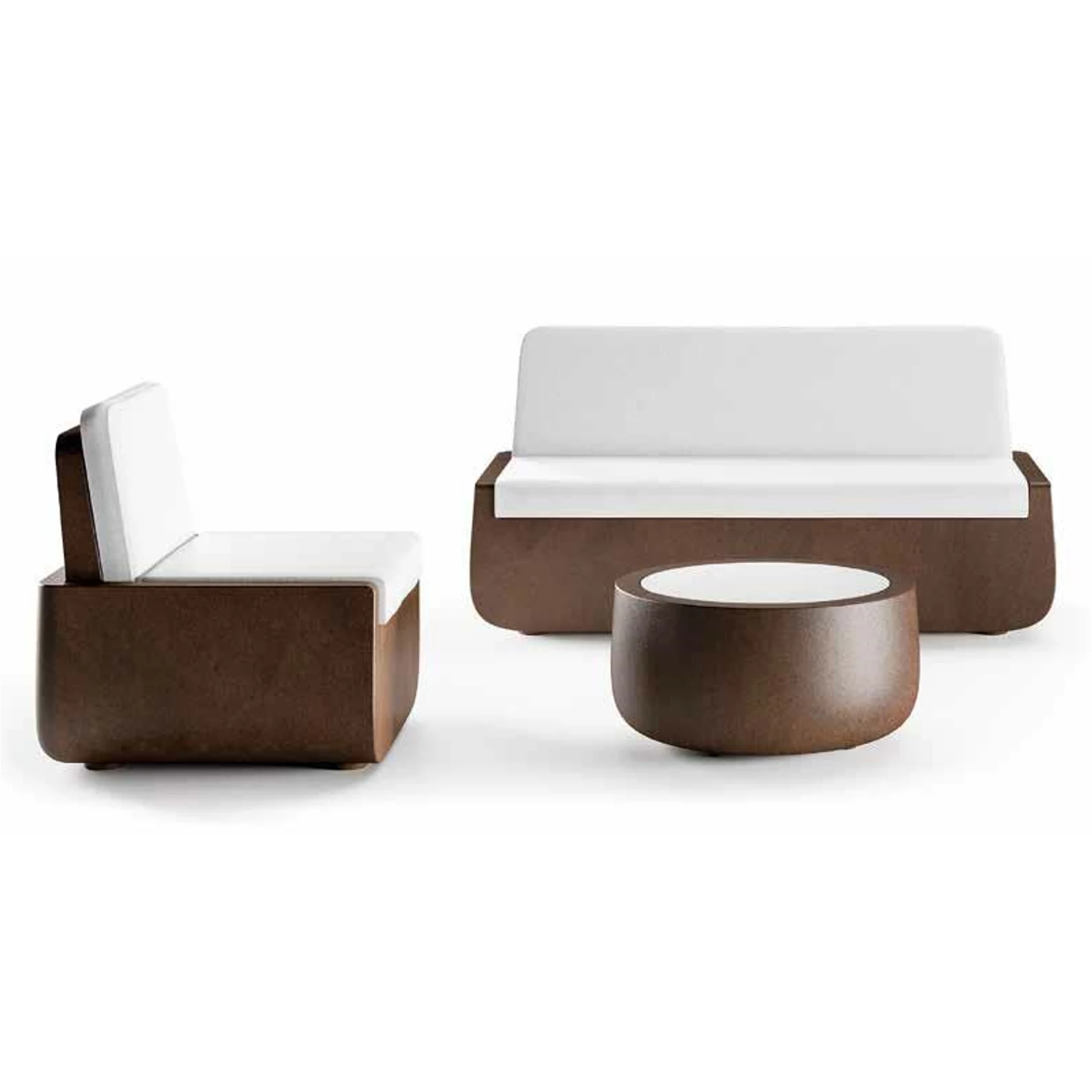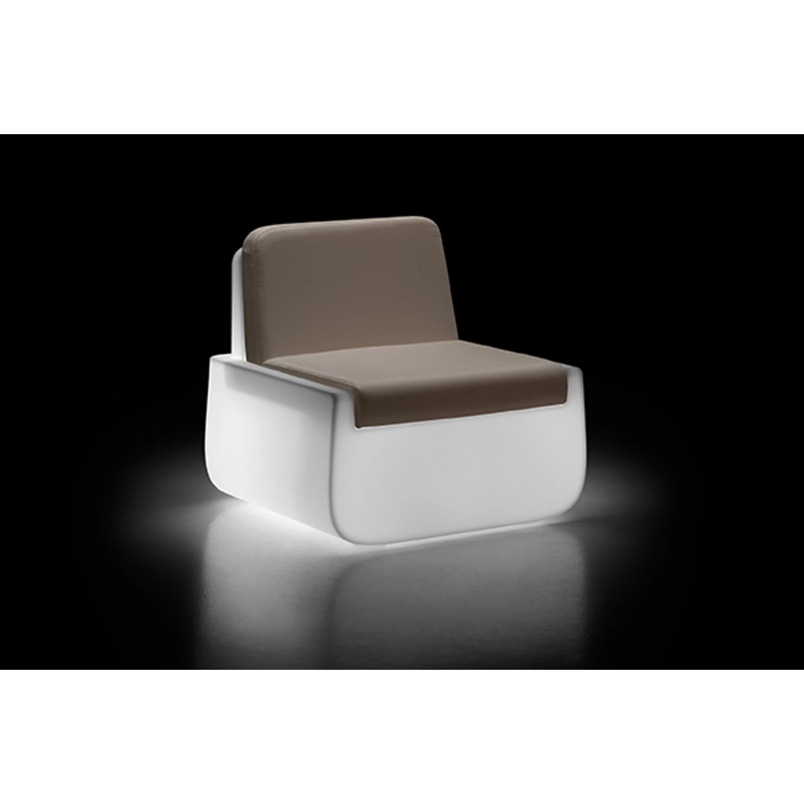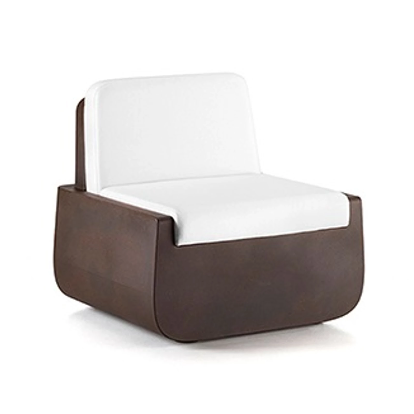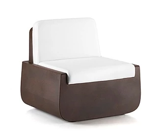 Armchair with broad and deep seat, completed with a system of cushions that makes them comfortable and cosy. The cushions are available in three colours and their manufacture, with DryFeel upholstery and Sunbrella fabric lining, make these items ideal for use both indoors and out. Light version of armchair and sofa creates a system of seats characterized by curved lines enhanced by soft lighting that creates a welcoming atmosphere which is ideal for indoor lounge areas.