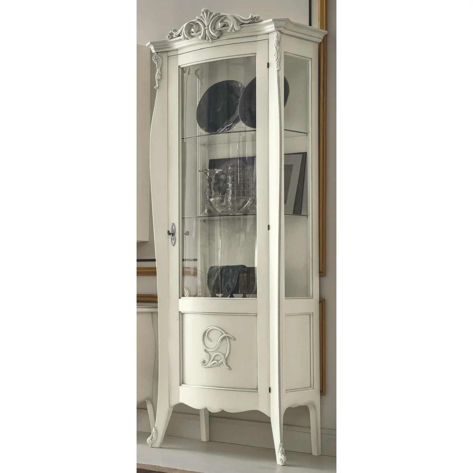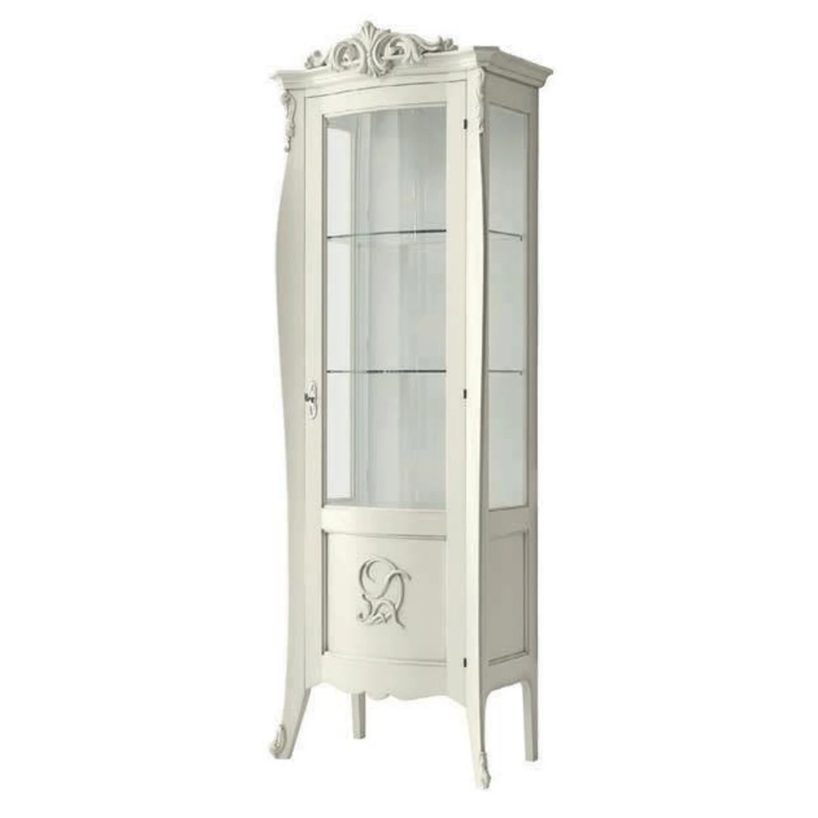 Materials used: the plinth, pedestal, frame, drawer fronts and table tops of the product are all made of solid linden wood. The top, sides, panel and shelves of the cabinets are made of veneered tanganika wood, and the frame of the curved doors and drawers are made with multilayer veneer. Cabinets and drawers work with soft-closing mechanism.