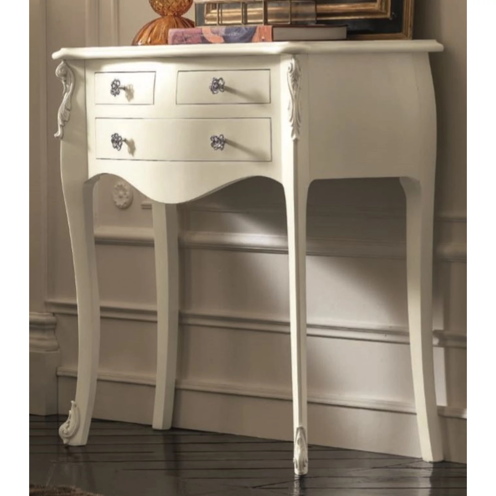 Materials used: the plinth, pedestal, frame, drawer fronts and table tops of the product are all made of solid linden wood. The top, sides, panel and shelves of the cabinets are made of veneered tanganika wood, and the frame of the curved doors and drawers are made with multilayer veneer. Cabinets and drawers work with soft-closing mechanism.