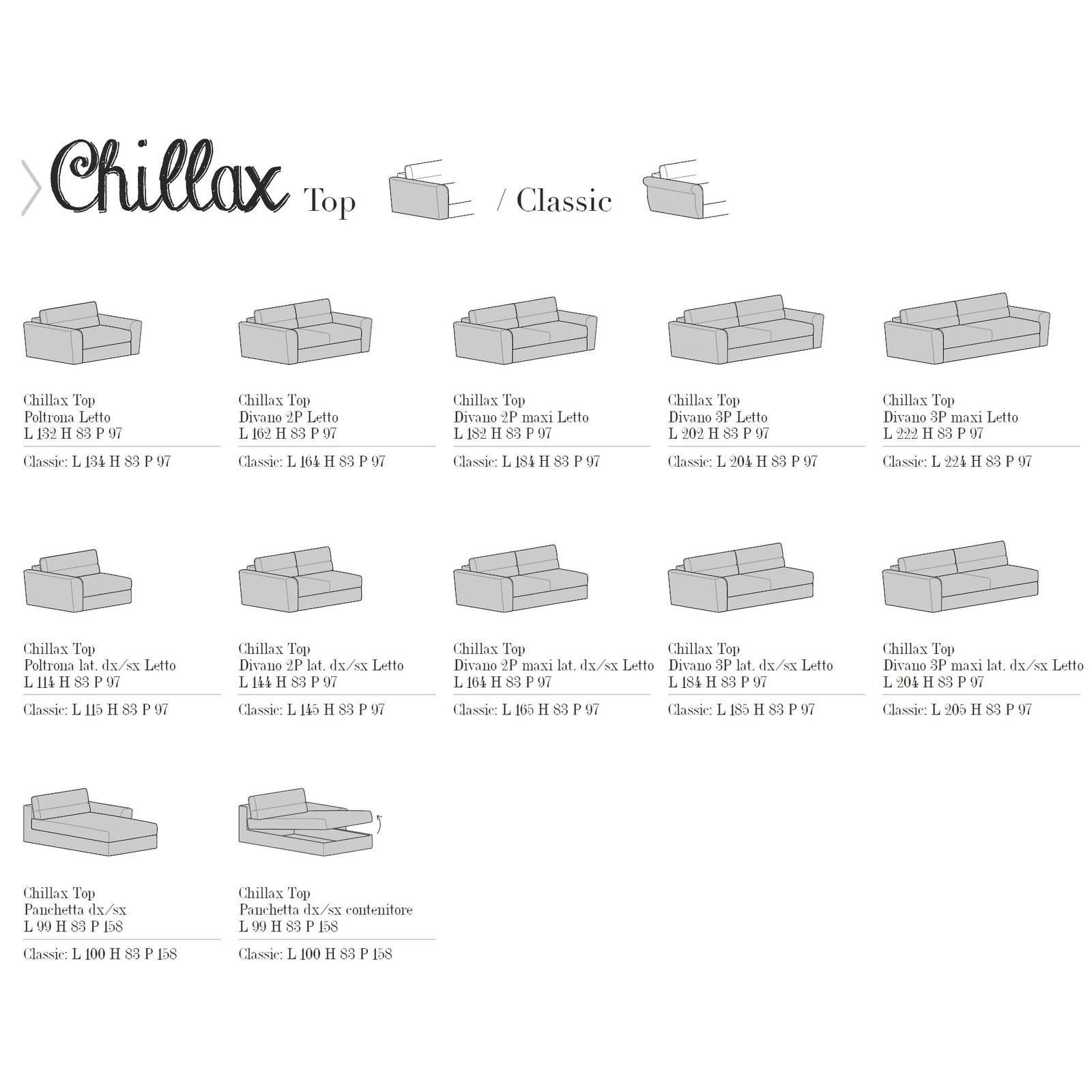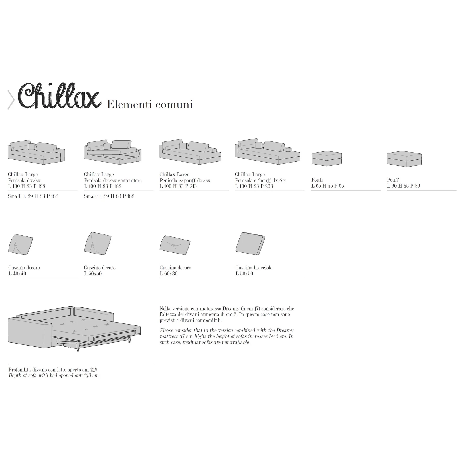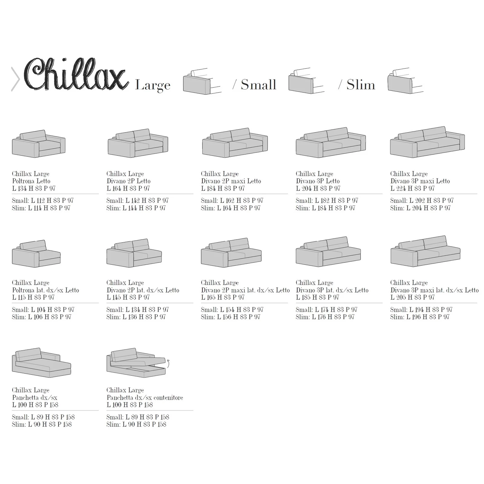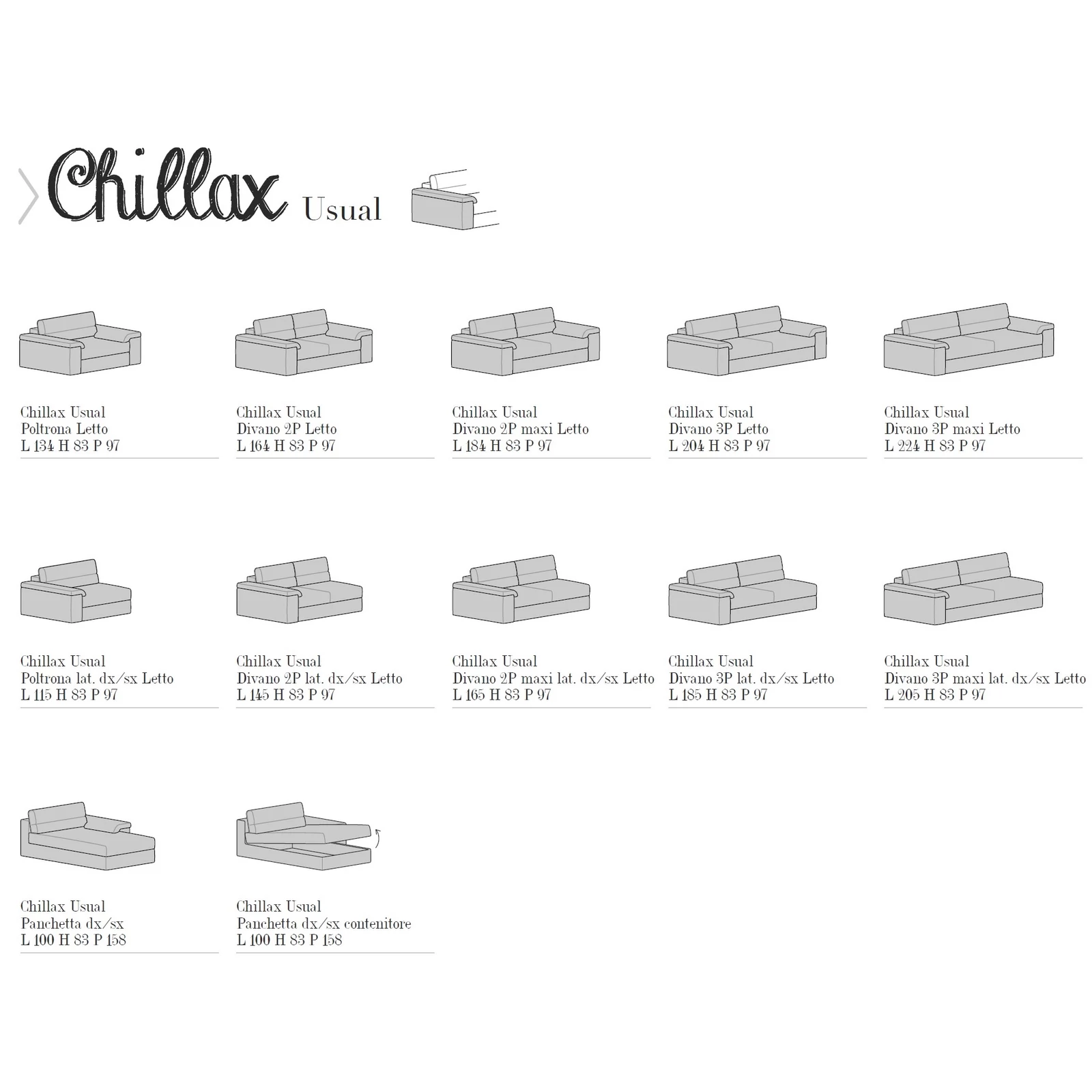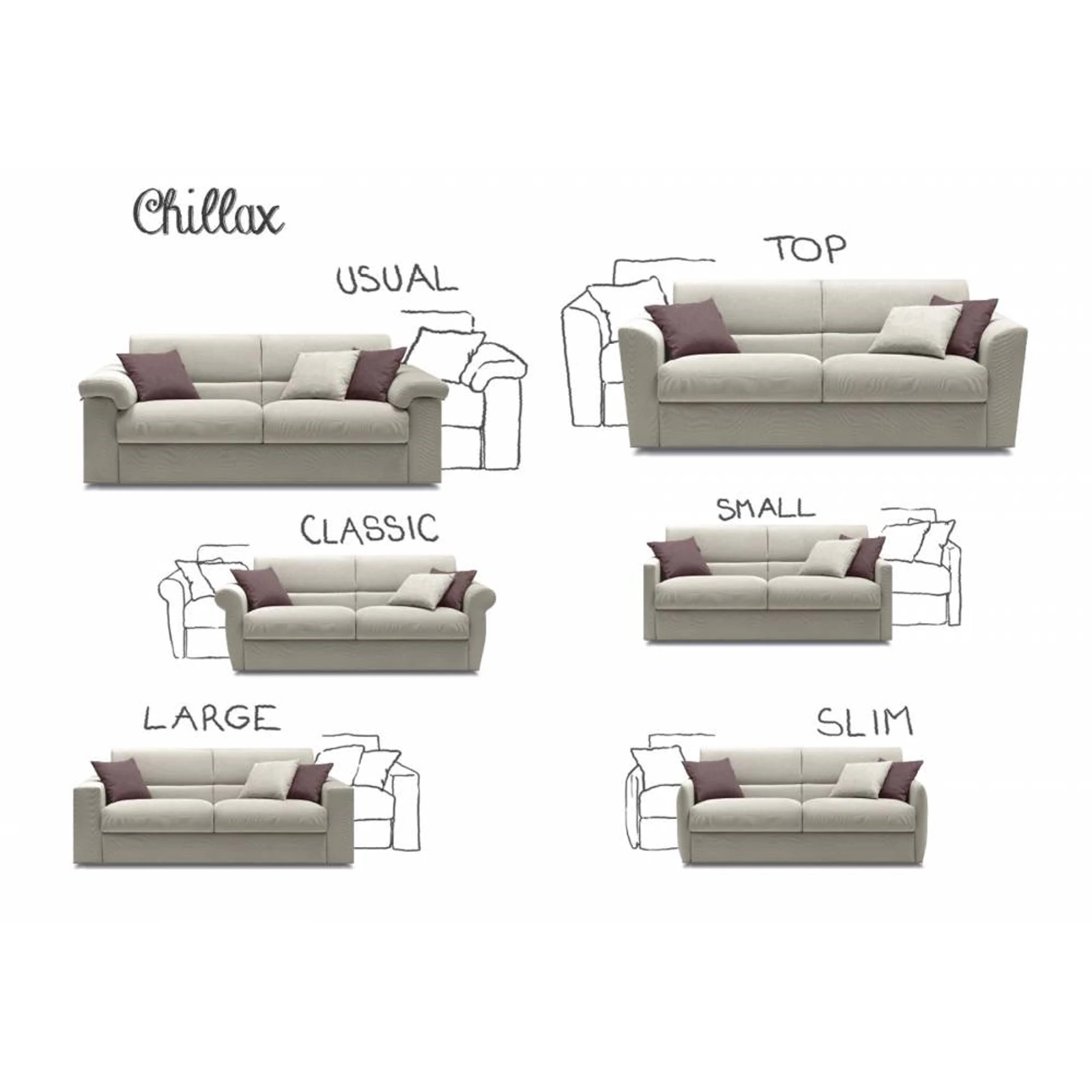 The Chillax sofa is fully customizable: choose from multiple sizes and designs, and from awide selection of fabrics and leathers; it can also be ordered as a sofa bed, with a bedding compartment, and as a complete living‑room set – so the most suitable piece is guaranteed! Matching armchair, ottoman, and decorative cushions are available on request. For details and exact prices, the team is happy to help via the listed contacts.
