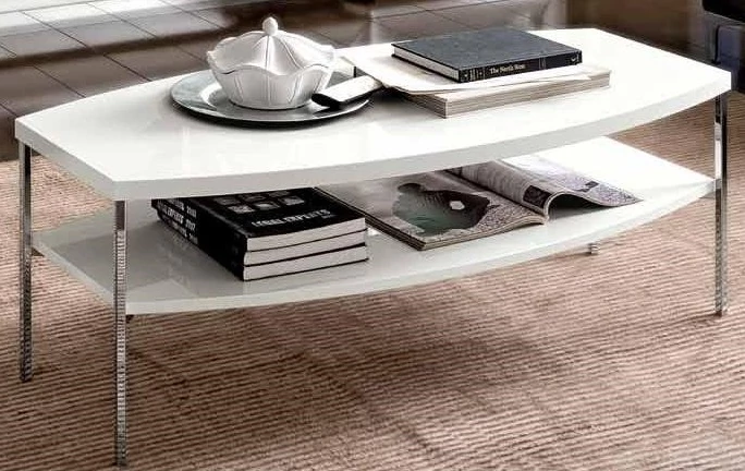 15mm thick chromed steel legs. Table top in 30mm thick poplar wood particle panels and 18mm thick lower shelf, coated with glossy white melamine. Shiny polyester painting in white, with UV (ultra-violet) drying.