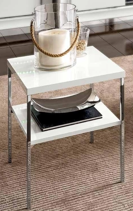 15mm thick chromed steel legs. Table top in 30mm thick poplar wood particle panels and 18mm thick lower shelf, coated with glossy white melamine. Shiny polyester painting in white, with UV (ultra-violet) drying.