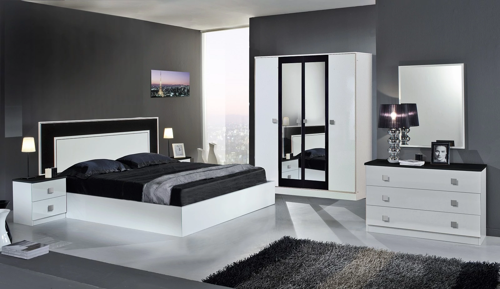 DI Amal bedroom - white-black with 160x200 cm bed, with 4-doors cabinet