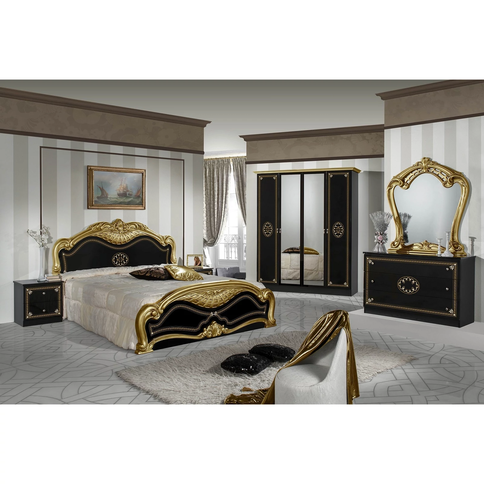 DI-LUC-LET-16-NODouble bedstead - 160 cm, black-goldDI-LUC-CMN-NONight table - black-goldDI-LUC-CMD-NOChest of drawers - black-goldDI-LUC-SPE-ORDecorated mirror - goldDI-LUC-AR6-NO6-doors cabinet, with 2 mirrored doors - black-gold