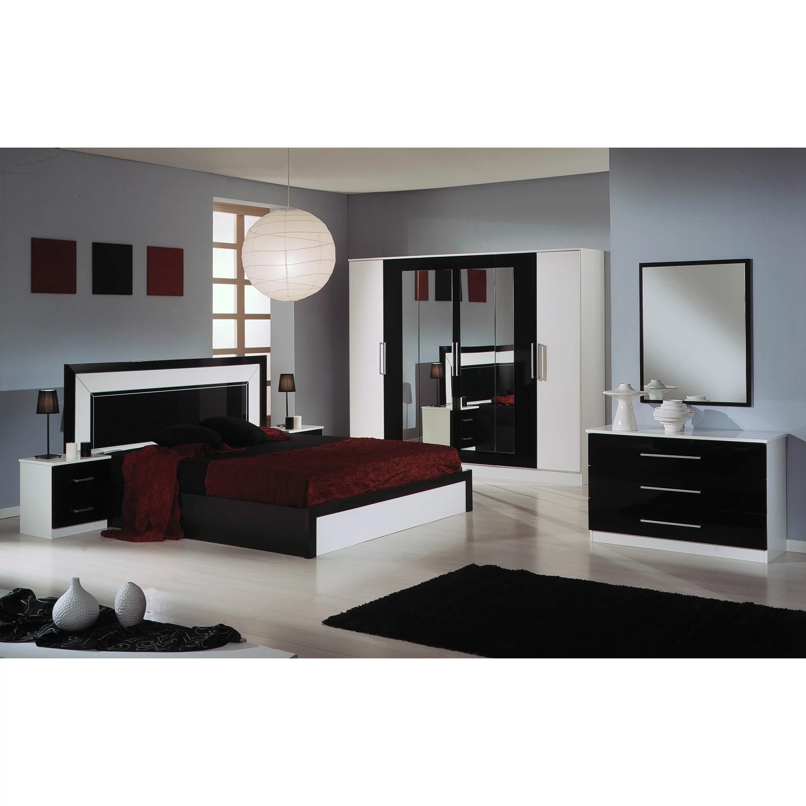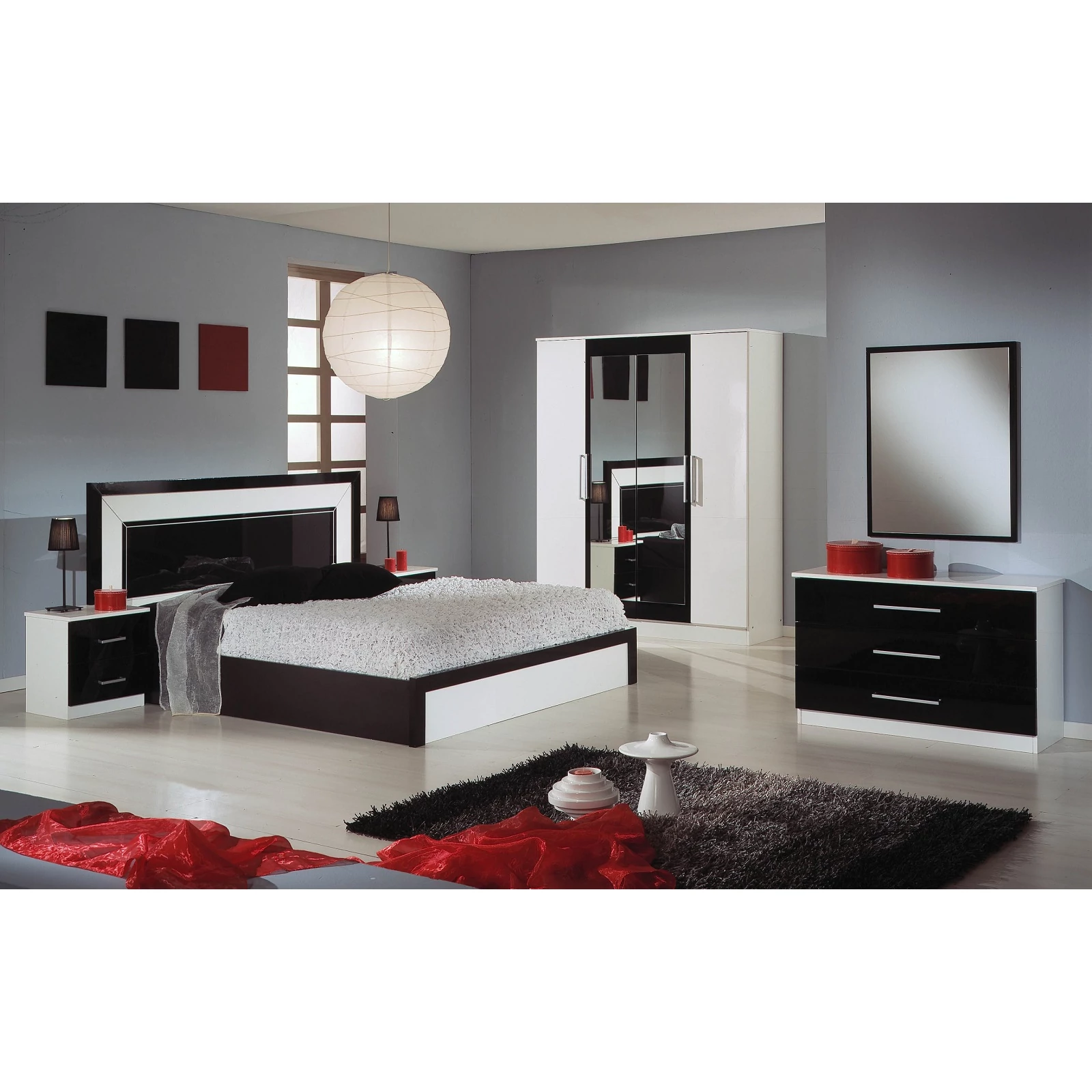 DI-MIA-LET-18-NBDI Miami Double bedstead - 180 cm, black-whiteDI-MIA-CMN-BNNight table - white-blackDI-MIA-CMD-BNChest of drawers - white-blackDI-MIA-SPE-NEMirror - blackDI-MIA-AR4-BN4-doors cabinet, with 2 mirrored doors - white-black