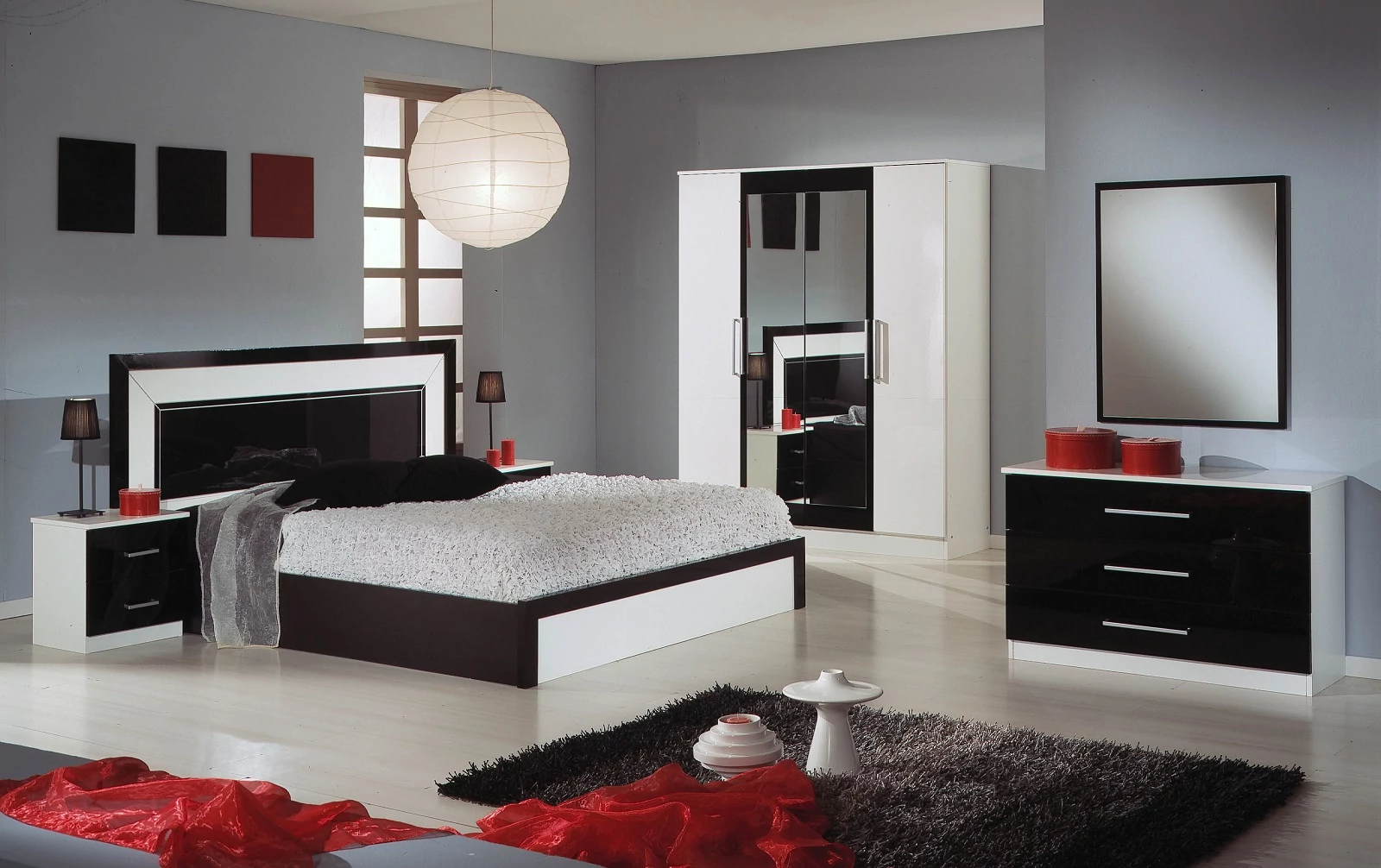 DI Miami bedroom - white-black with 160x200 cm bed, with 4-doors cabinet