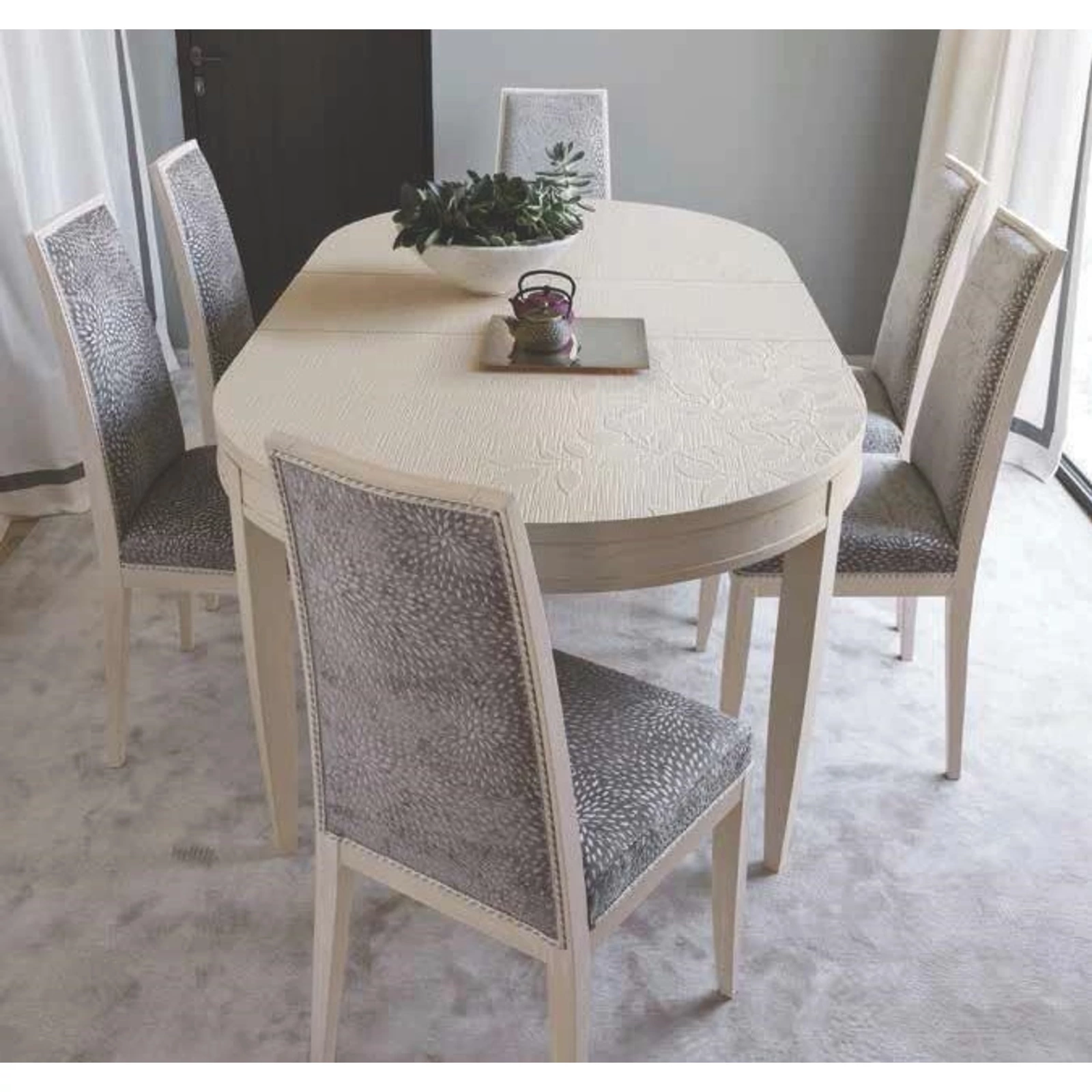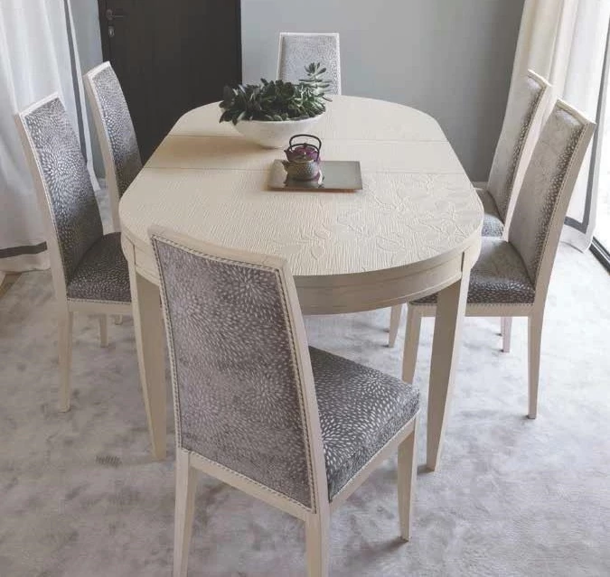 In the dining room the main role is obviously of the table, with its elegance and decorations. The round dining table and the chairs with stitched backrest create a serious and comfortable dining room. The small table is elegance itself. It is not a simple small table, but a piece of furniture which has all the elegance of classic style.