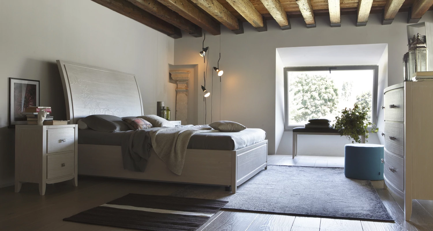Elegant shapes and practicality: the bedding container makes the storage spaces of the bedroom larger, and offers new solutions. This style adapts to the needs of modern life, and practicality reveals its elegant side to us. The compilation of the chest of drawers can be changed, but it remains invariably beautiful. With or without decoration, it can be a really sensual element of our room, and in addition it can be used for storage as well. With its classic lines and soft colors, the night tables and the bed give a restrained, natural effect to the bedroom. Comfortable, spacious, tidy: these are the essential features of an ideal wardrobe closet. With the smaller, decorated wardrobe closet we can enjoy style combined with practicality even in narrower spaces.