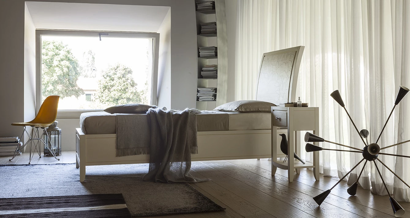 Elegant shapes and practicality: the bedding container makes the storage spaces of the bedroom larger, and offers new solutions. This style adapts to the needs of modern life, and practicality reveals its elegant side to us. The compilation of the chest of drawers can be changed, but it remains invariably beautiful. With or without decoration, it can be a really sensual element of our room, and in addition it can be used for storage as well. With its classic lines and soft colors, the night tables and the bed give a restrained, natural effect to the bedroom. Comfortable, spacious, tidy: these are the essential features of an ideal wardrobe closet. With the smaller, decorated wardrobe closet we can enjoy style combined with practicality even in narrower spaces.