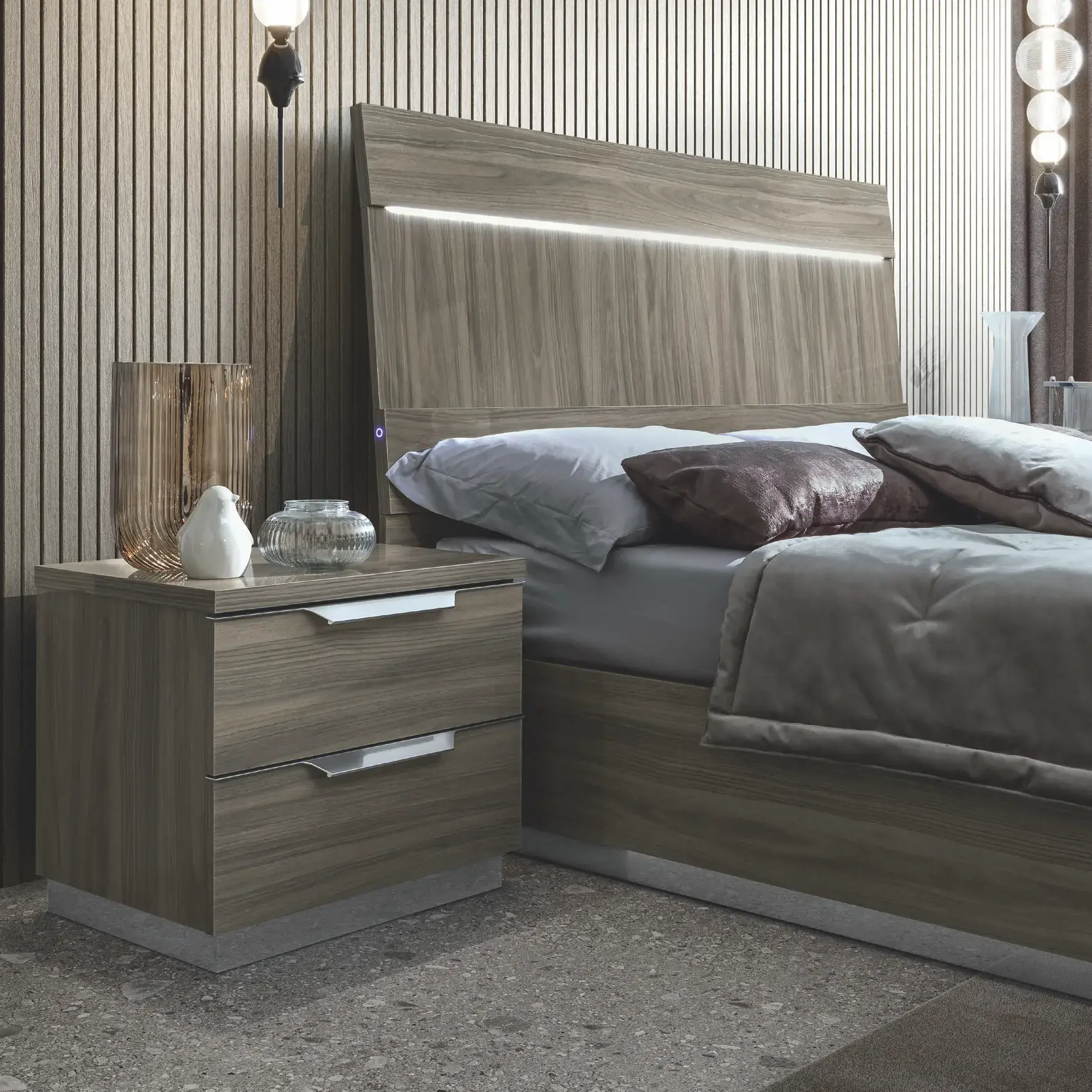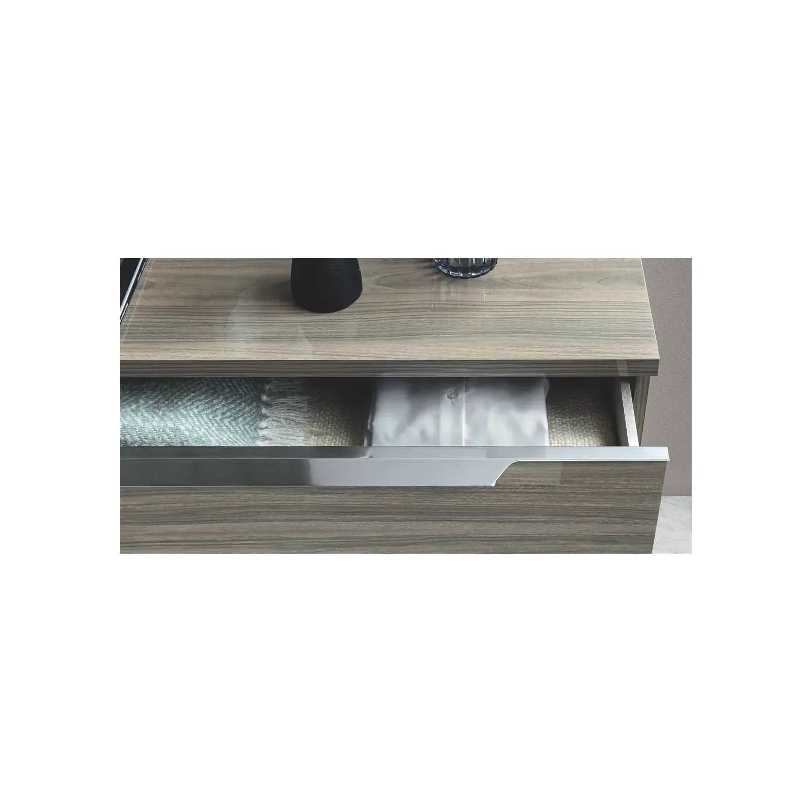 The Italian Kroma bedroom collection, designed by experts at CamelGroup, lends modern elegance to any bedroom with its exclusive colors. Featuring trapezium-shaped, brushed aluminum handles that create a striking contrast, the collection is available in two exclusive finishes – Venetian Grey and Silver Birch. The headboard’s simple yet refined design highlights horizontal and vertical patterns with varying panel thicknesses, enhanced by an adjustable LED light strip for added ambiance. The modular wardrobes offer a wide range of customization with optional accessories for a tailored storage experience. Night tables and dressers are crafted with 30mm thick tops and soft, smooth edges, while anti-scratch interiors ensure long-lasting quality.