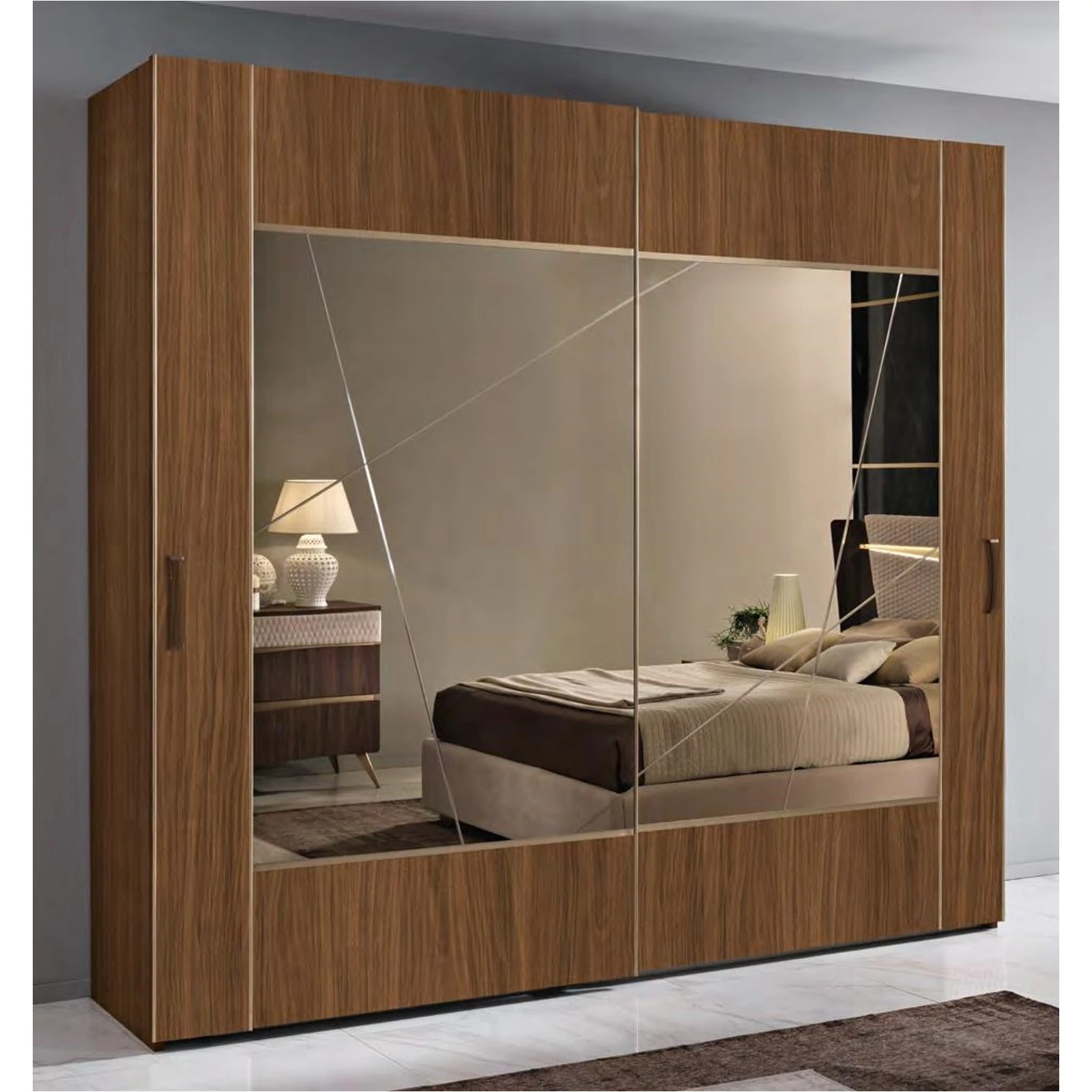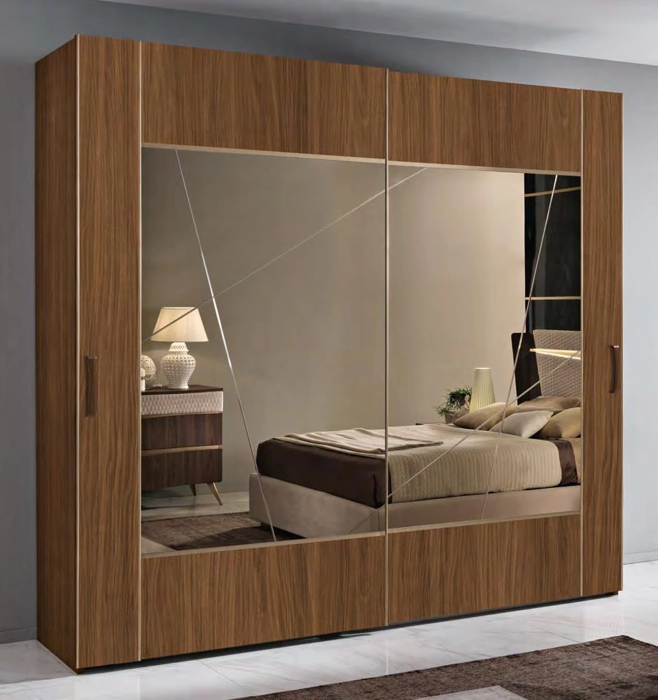 The structure and the front of the cabinet are all in honeycomb, 25 mm thick. in wood-colored decorative. On the doors are inserted n. 2 adjustable stabilizing tie rods, externally bronze-plated aluminum profiles are inserted. The upholstered bands are in washable eco-leather, on request it is possible to vary the color of the eco-leather. Bronzed mirrors 4 mm thick engraved. Backs in 8 mm thick particle board panels, combined with the structure of the wardrobe. The sliding rails of the cabinets are equipped with shock absorbers. Cabinet interior equipment: chest 4 drawers, 2 shelves 30 mm thick adjustable in different positions, n. 4 clothes hanger rods.