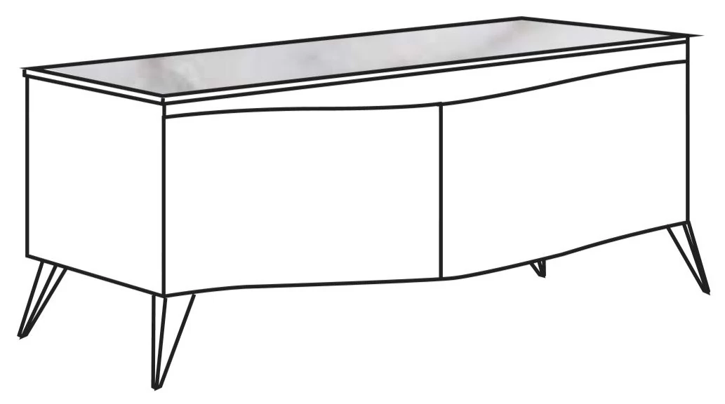 Structure and fronts in 20 mm thick particle board panels in wood-like decorative finish. The drawers are equipped with cushioned guides, the sides 12 mm thick have 4 sides in natural beech-colored decor. The handles of the drawers and doors are obtained by shaping the edge. The feet are in painted iron color matched to the edges in decorative bronzed aluminum. Drawers also with eco-leather upholstery, color can be changed on request.