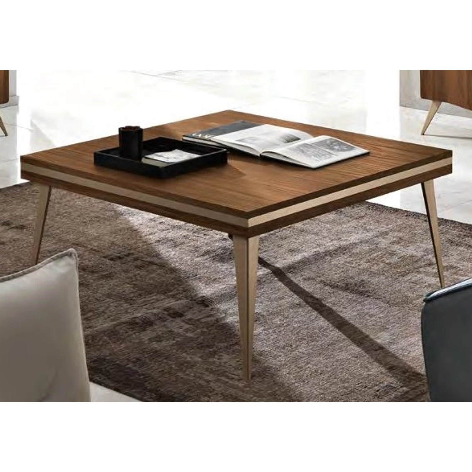 The top and the sides are in wood particle board panels 20 mm thick in decorative wood color, with bronzed aluminum inserts on the strips. The wooden base is made of wood particle board panels 40 mm thick with wood-colored and bronzed aluminum edges. The legs are in painted iron combined with the color of the edges in bronzed aluminum.