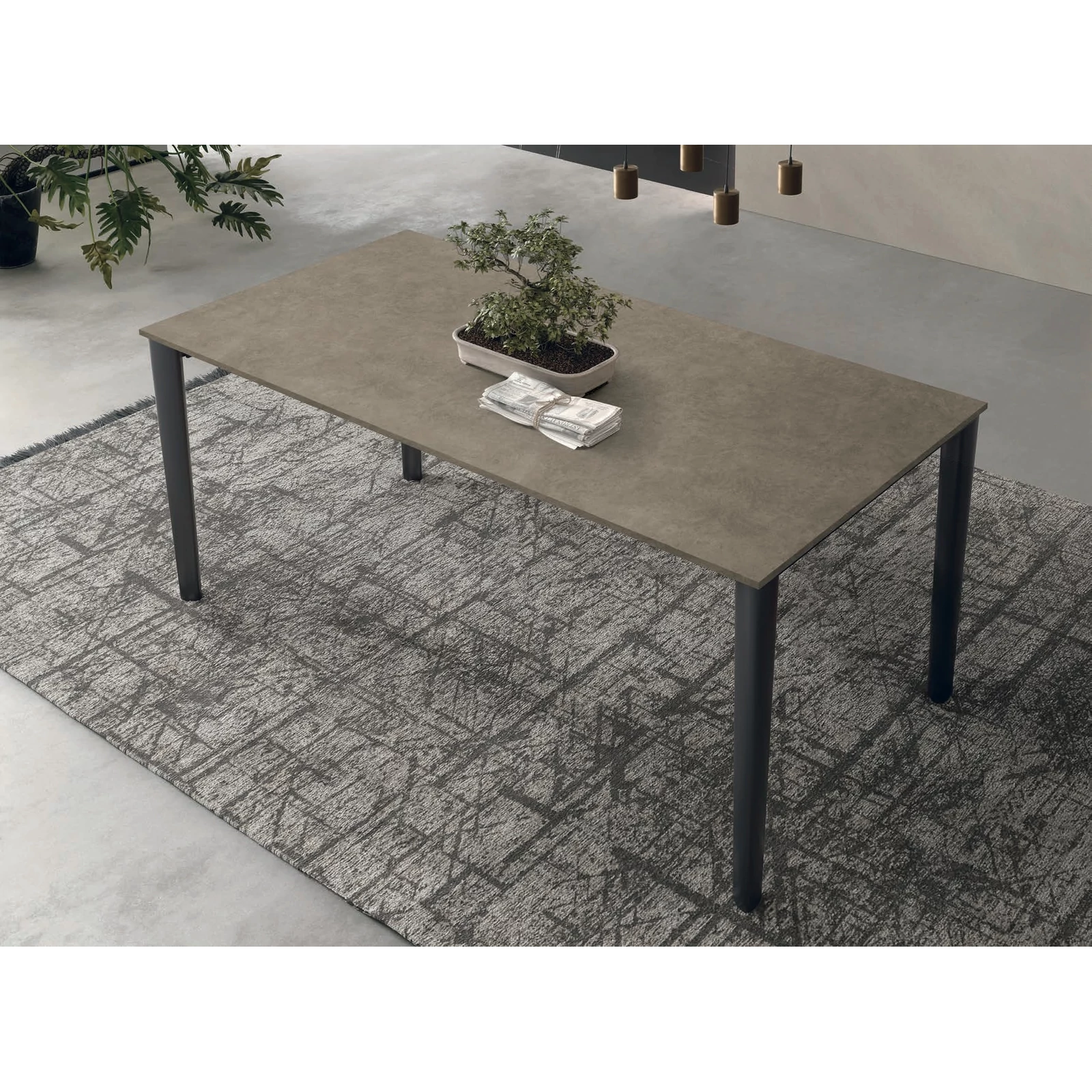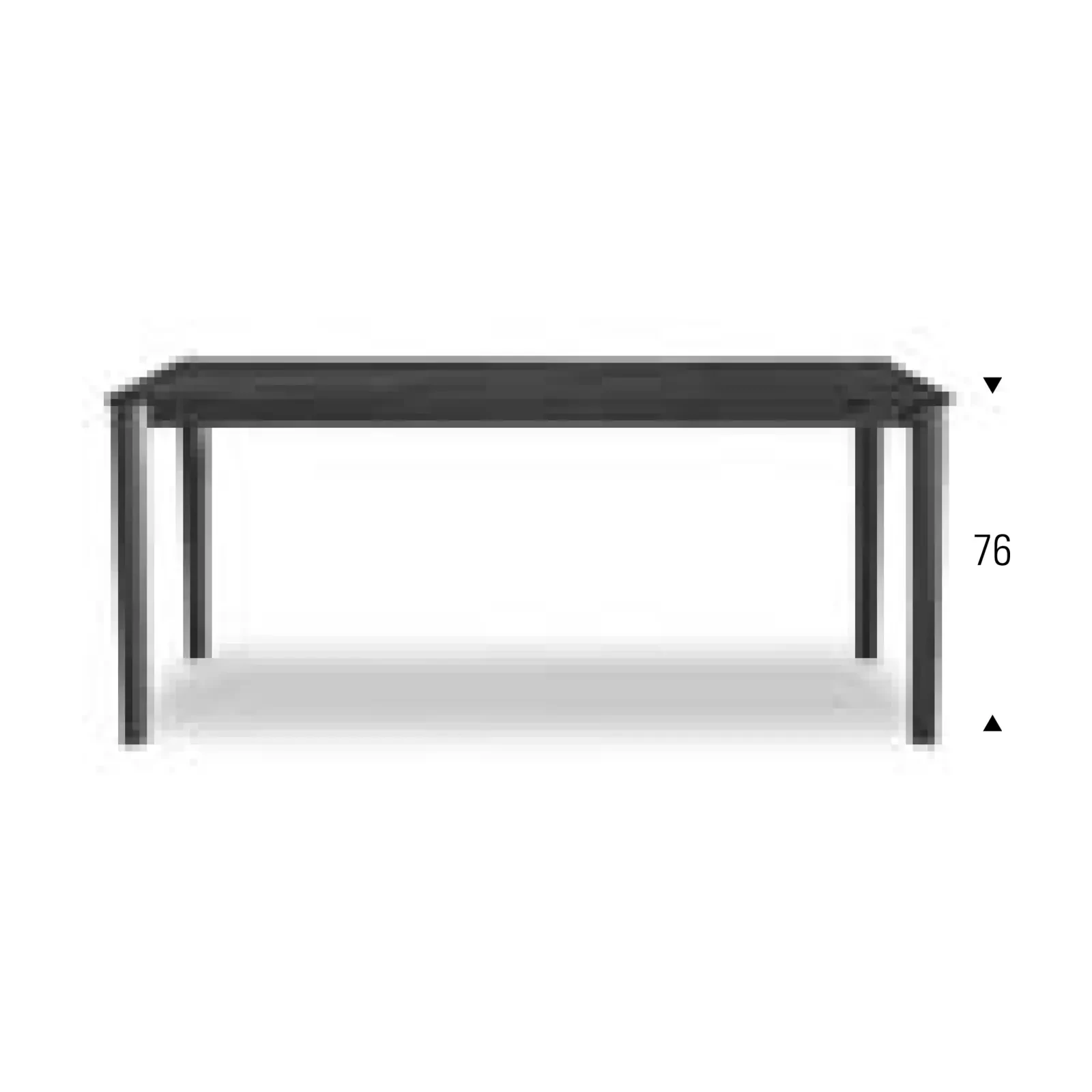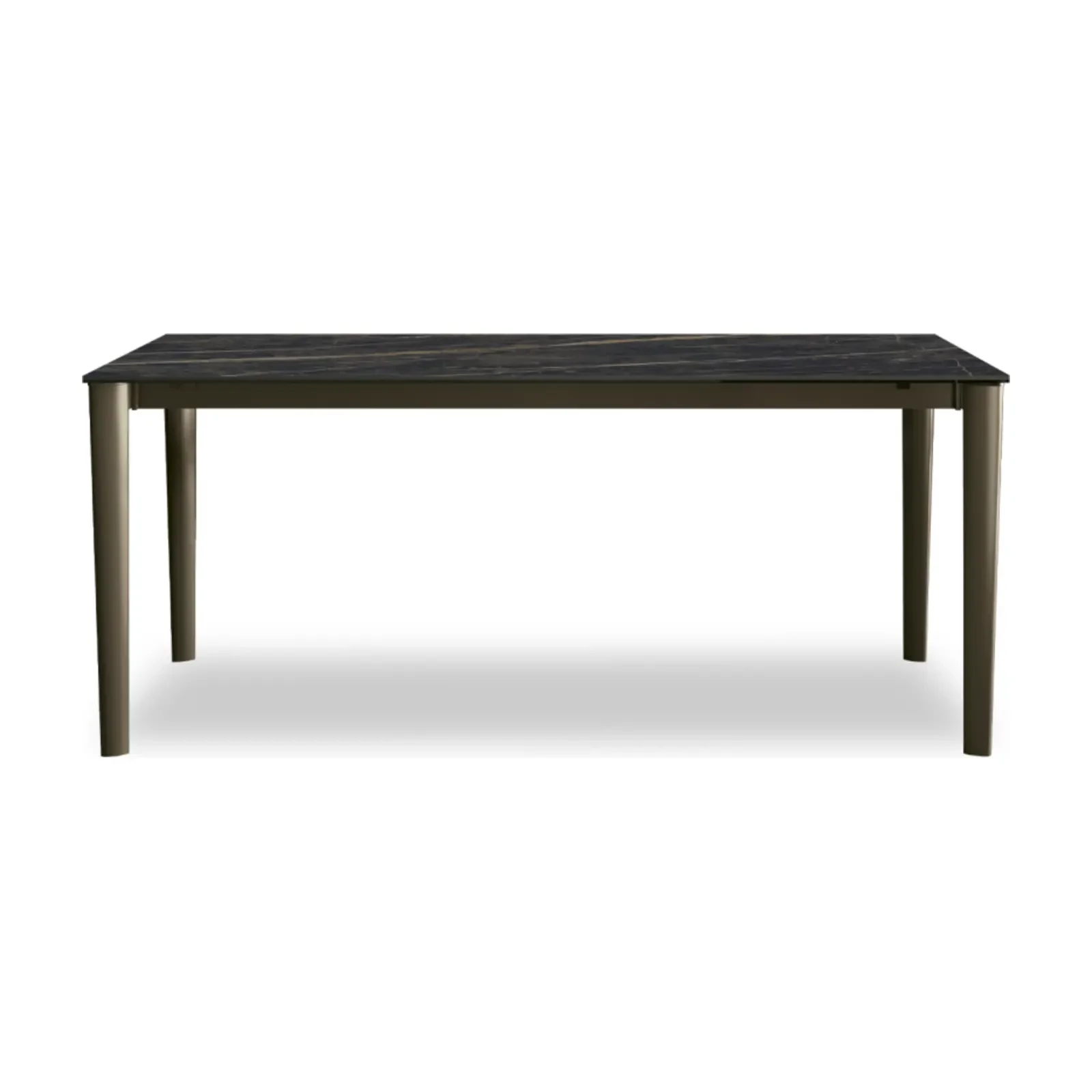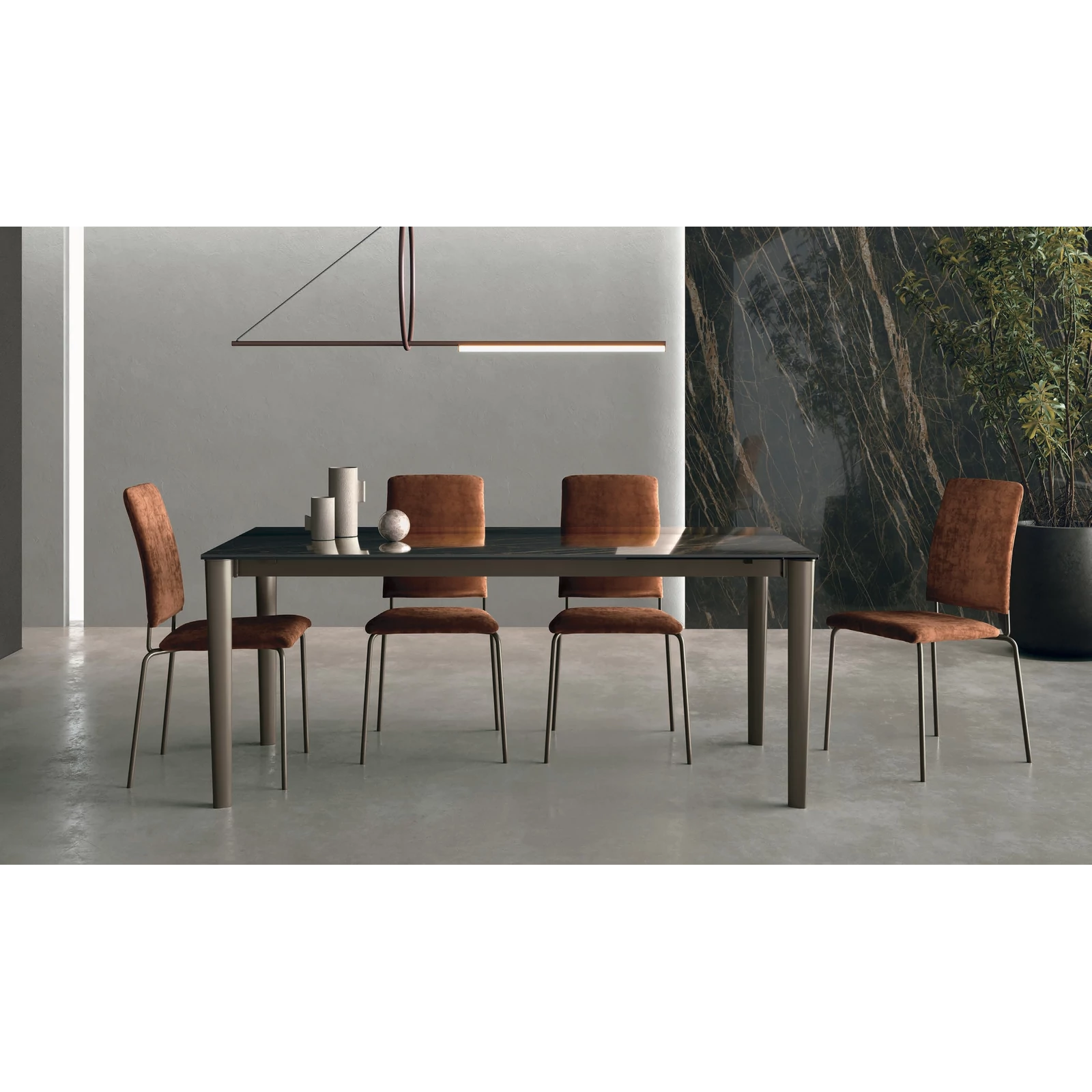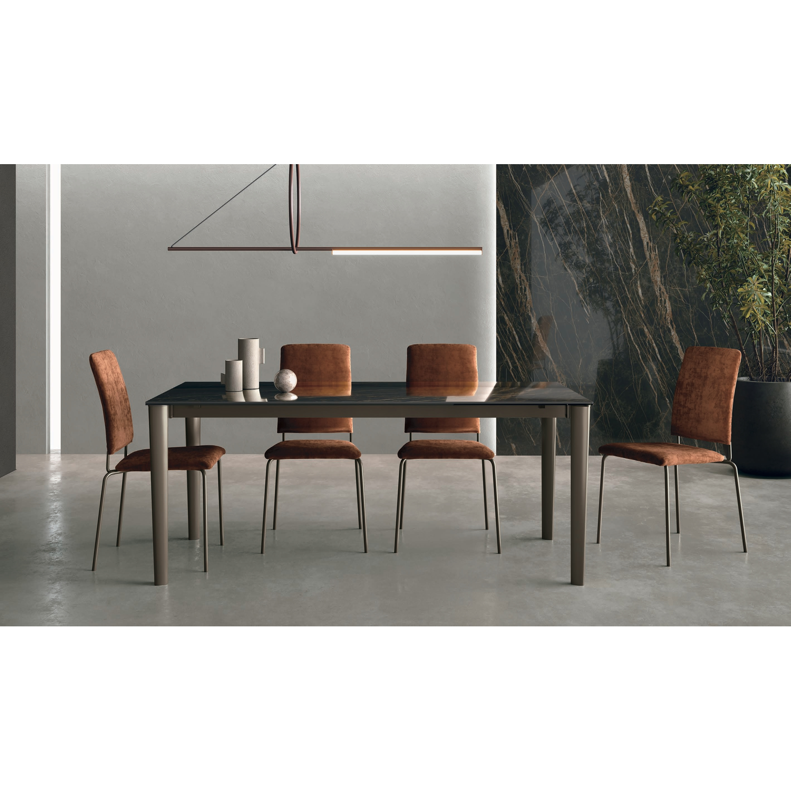 The Yago dining table combines the classic four-leg structure with modern details. Its character is defined by the metallic finish surfaces that harmoniously pair with the available tabletops. The dining table is made with a painted metal base, with the rectangular tabletop available in textured matte, ceramic or printed glass finishes.