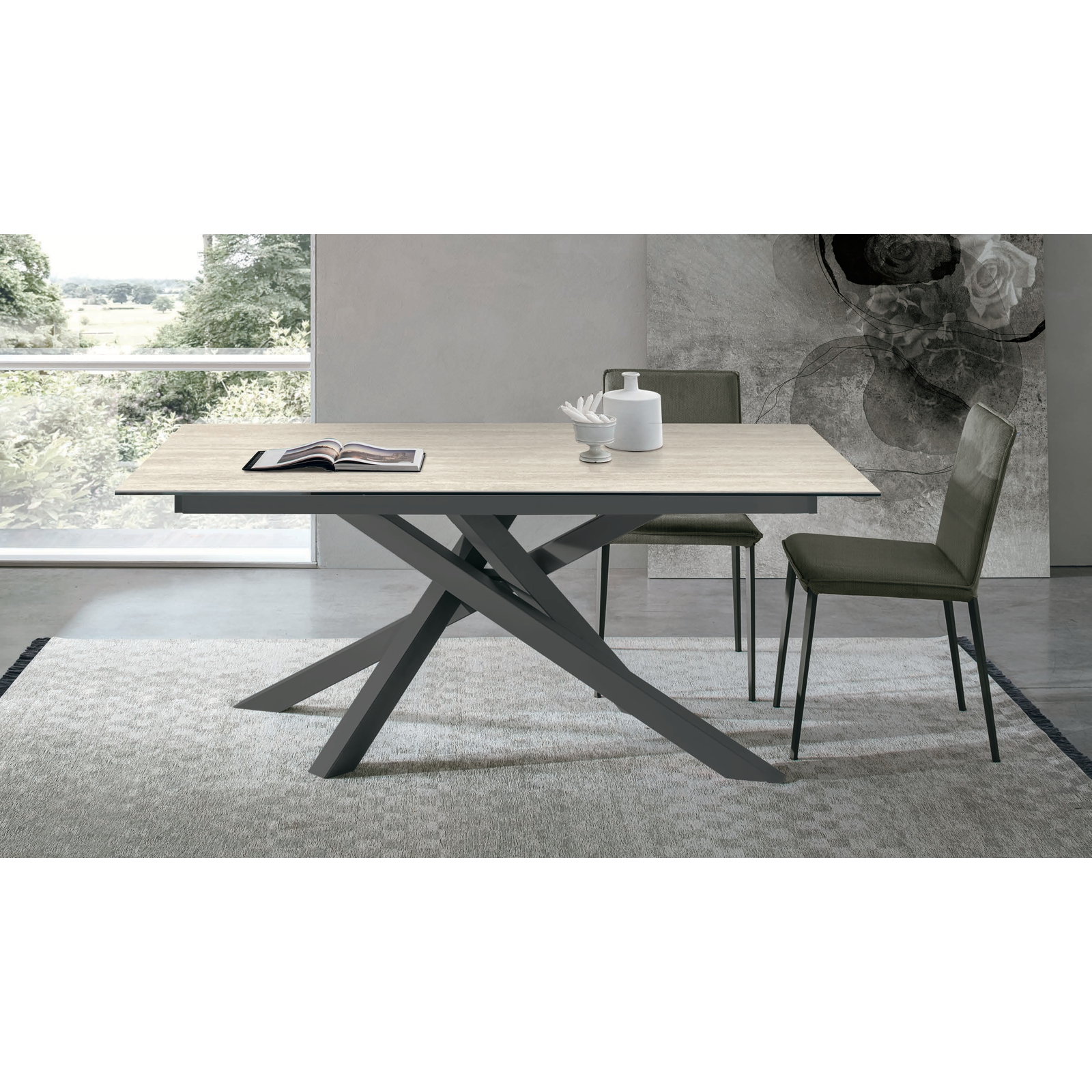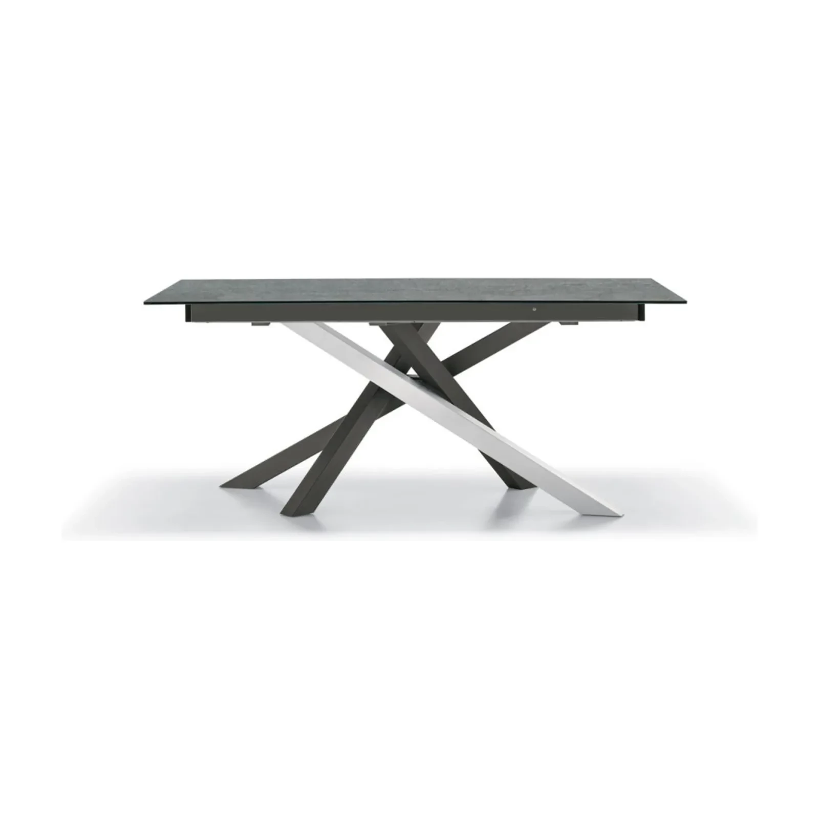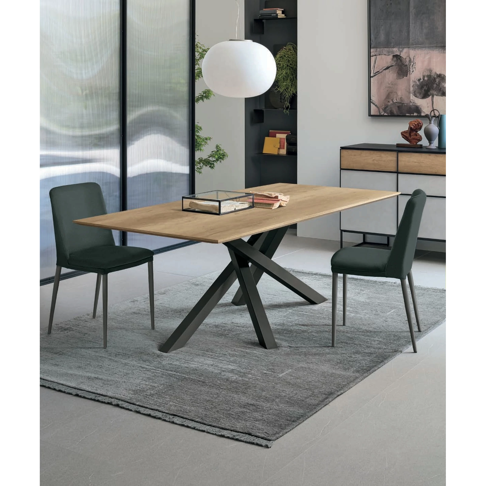 The Origami dining table draws attention with its playful and modern design. The metal base legs cross each other like the sticks of the famous Mikado game – the seemingly random pattern, however, provides precise stability for the tabletop. The table is made with a painted metal base, and its legs can even shine in multiple colors if desired. Its rectangular or curved tabletop is available in textured matte, ceramic or ash wood finishes.