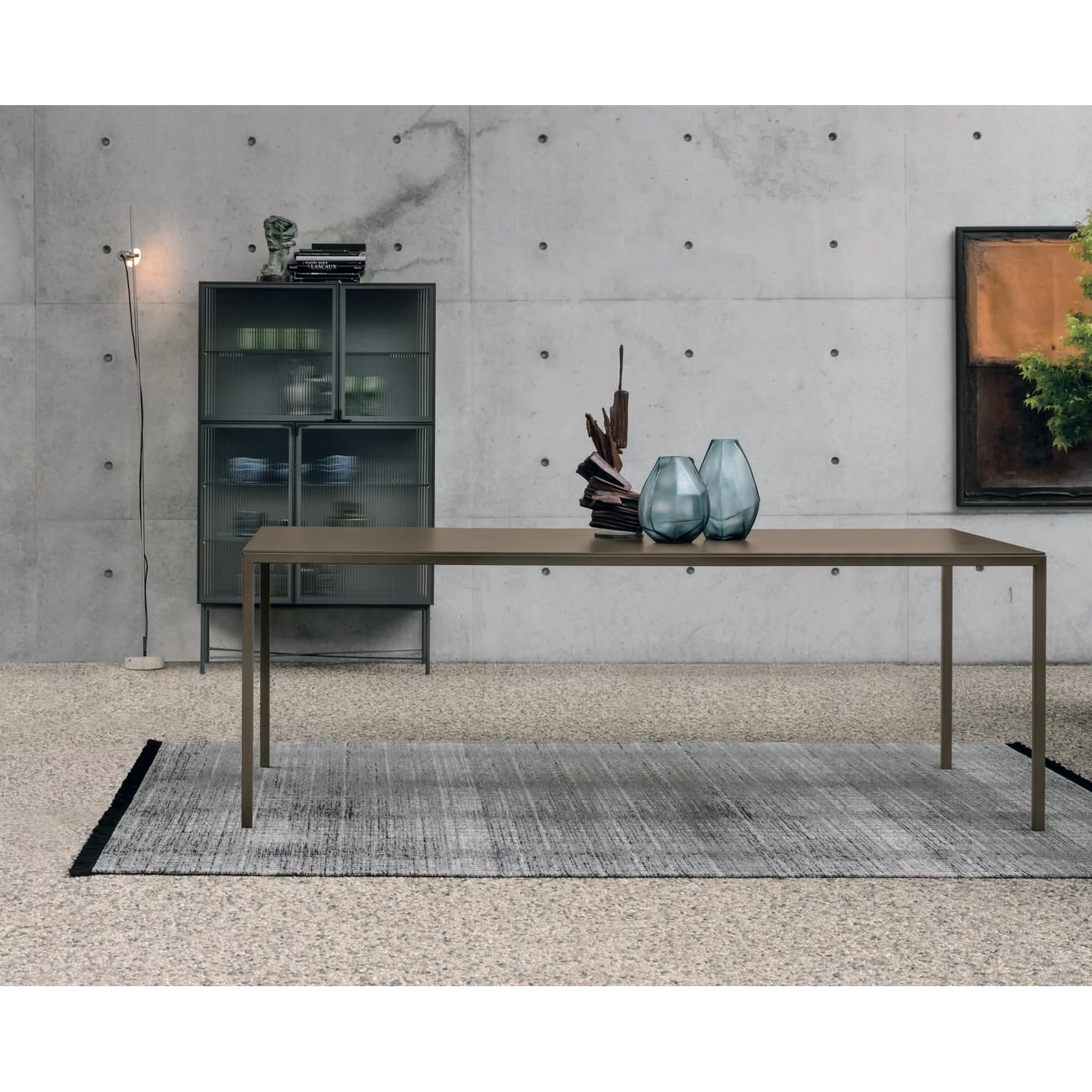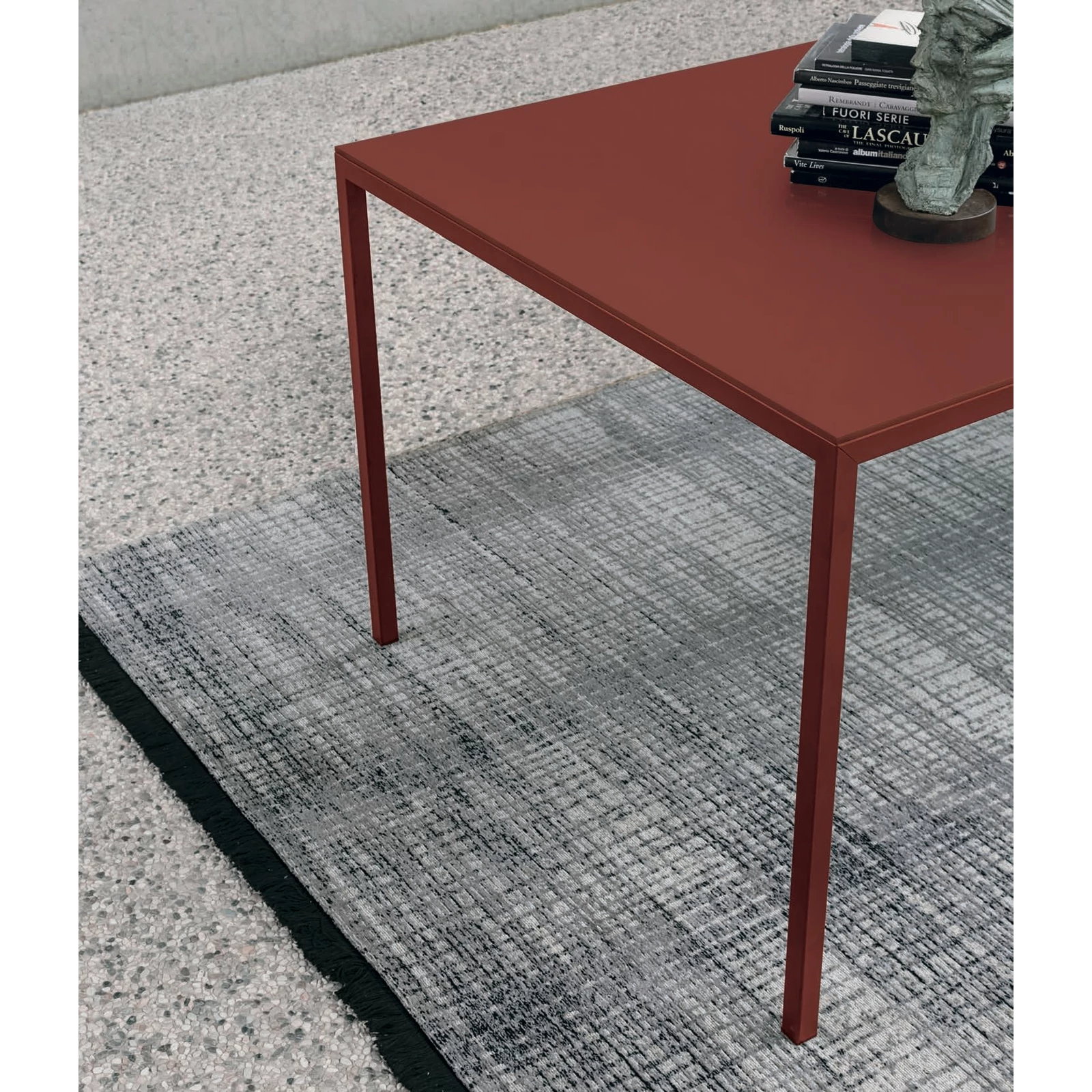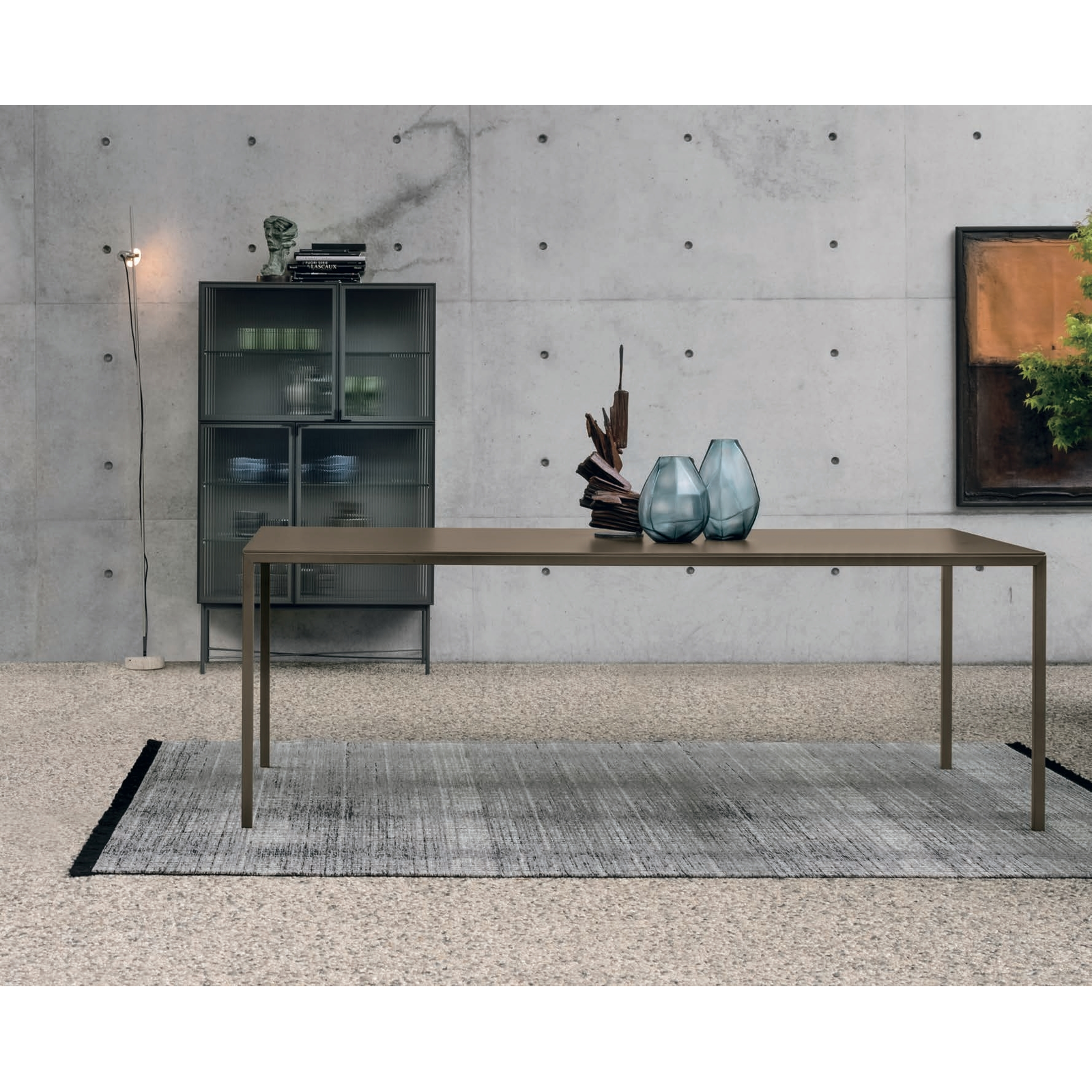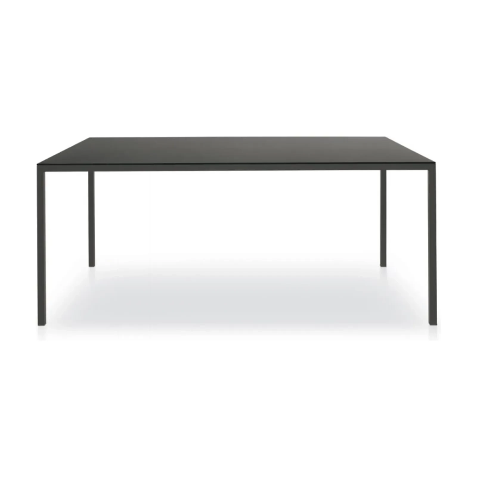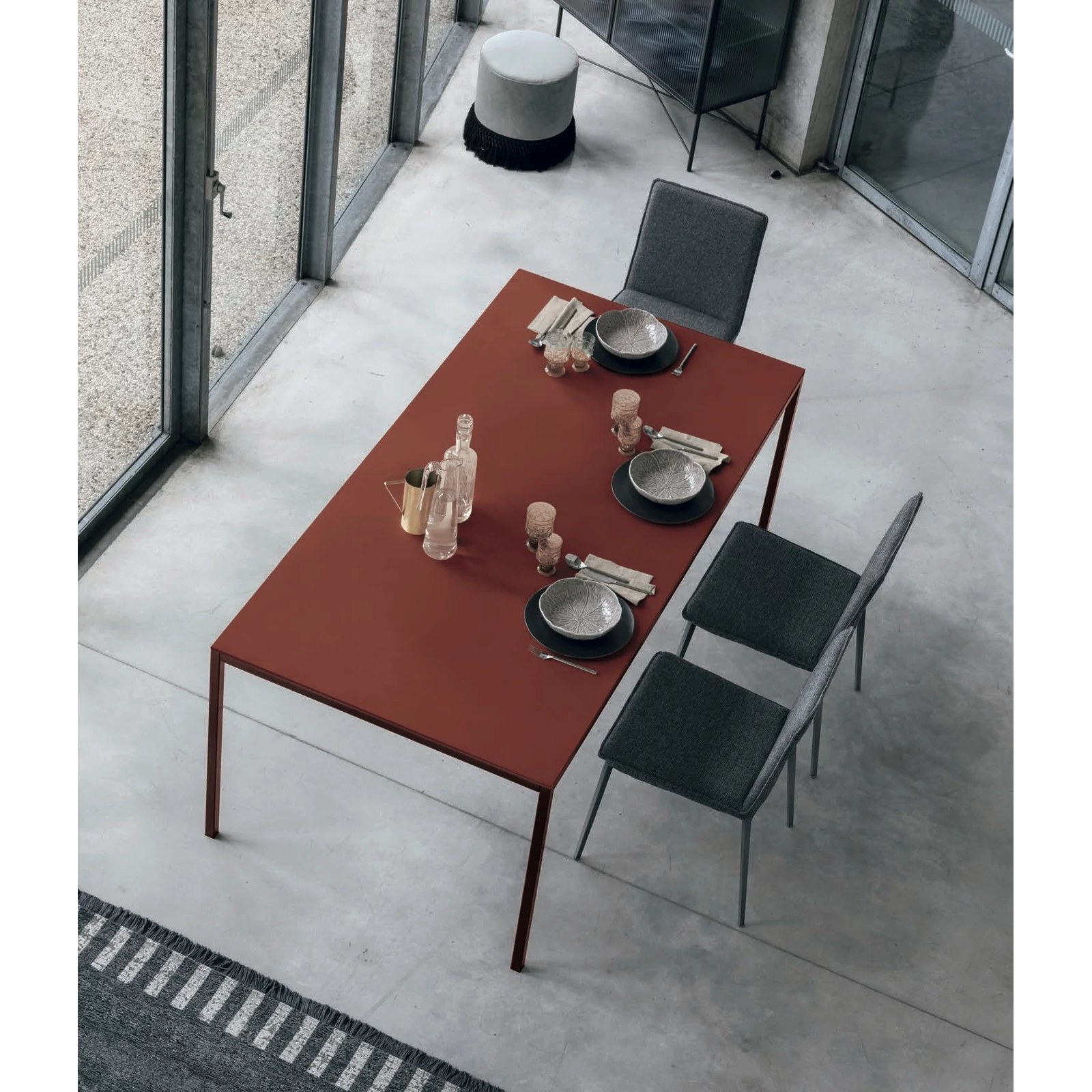 The Strong dining table, with its slender and elegant shape, goes beyond minimalism to create a calm and balanced atmosphere, whether in the home or even the workplace. It is made with painted metal legs, and its tabletop is available in scratch-resistant lacquered finish (matching the frame color), or in a textured matte version.