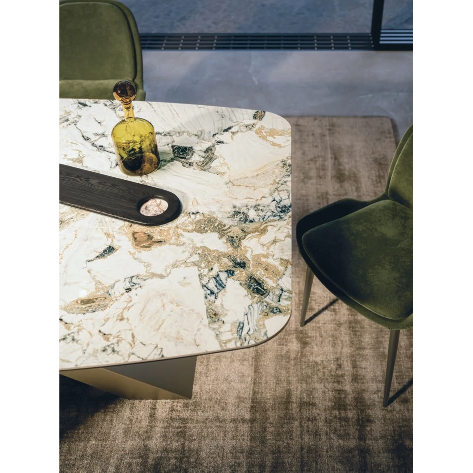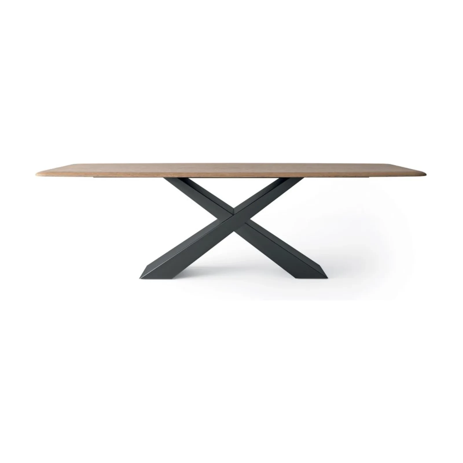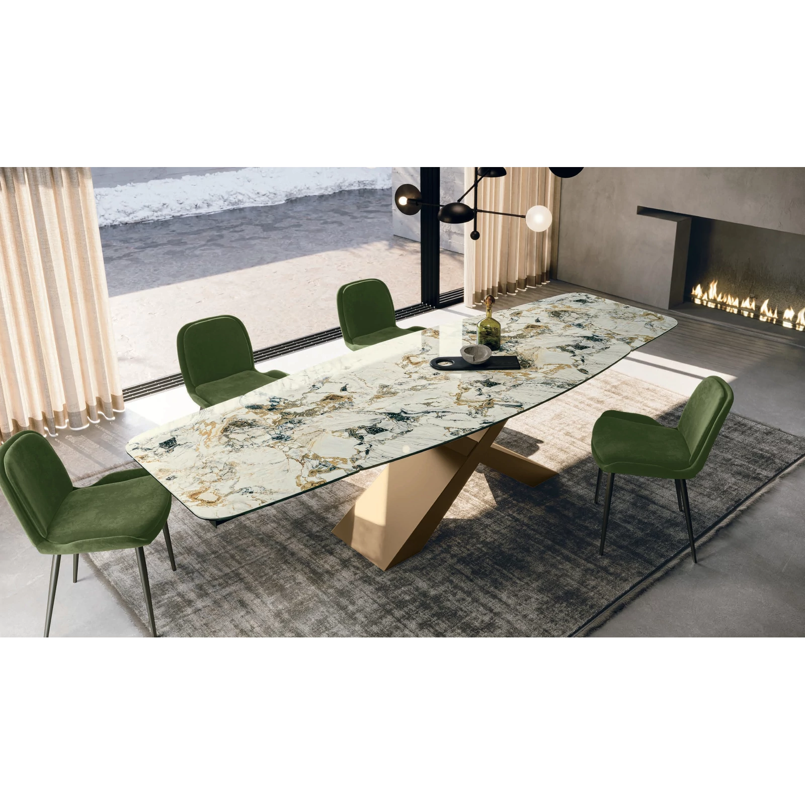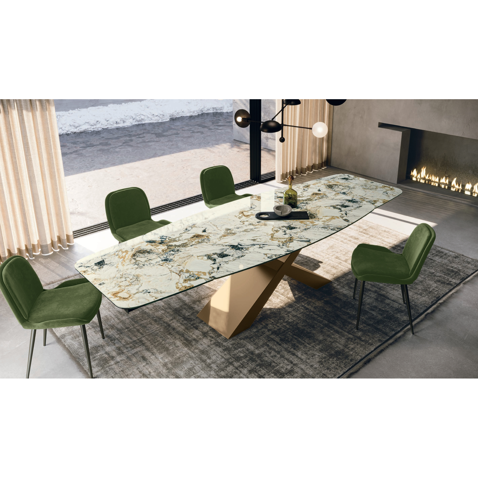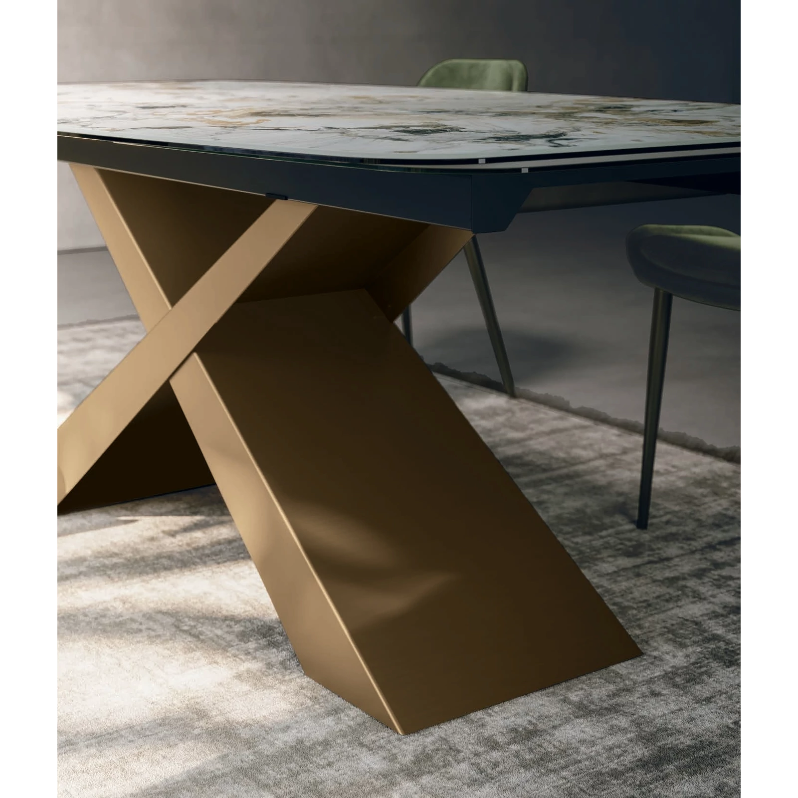 The Gold dining table plays with geometry and proportion, attracting attention with “X”-shaped pairs of legs that form a linear yet striking structure, topped with a contrasting tabletop that appears to float almost weightlessly. With a painted metal base, the rectangular or curved top is available in textured matte, ceramic, printed glass, or transparent glass finishes; in the fixed version, ash wood veneer is also available.