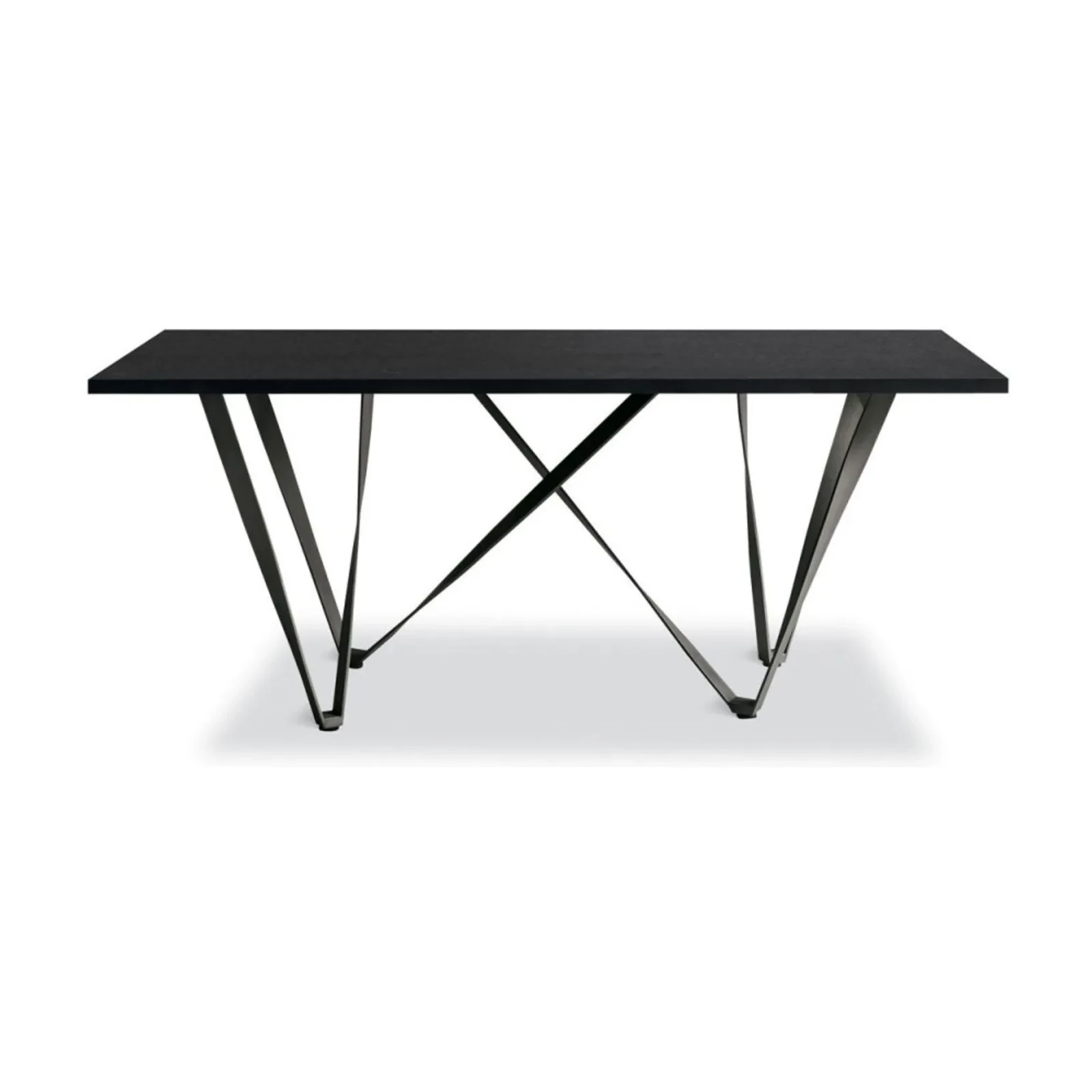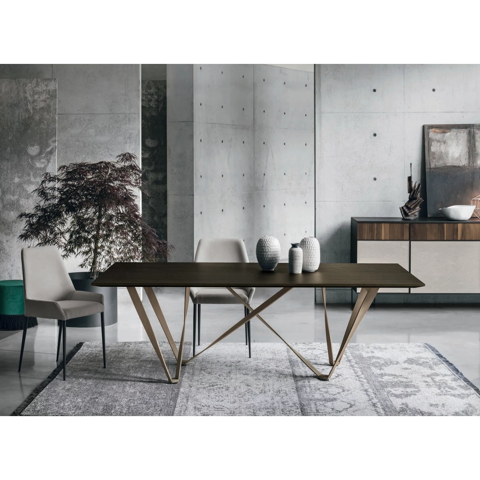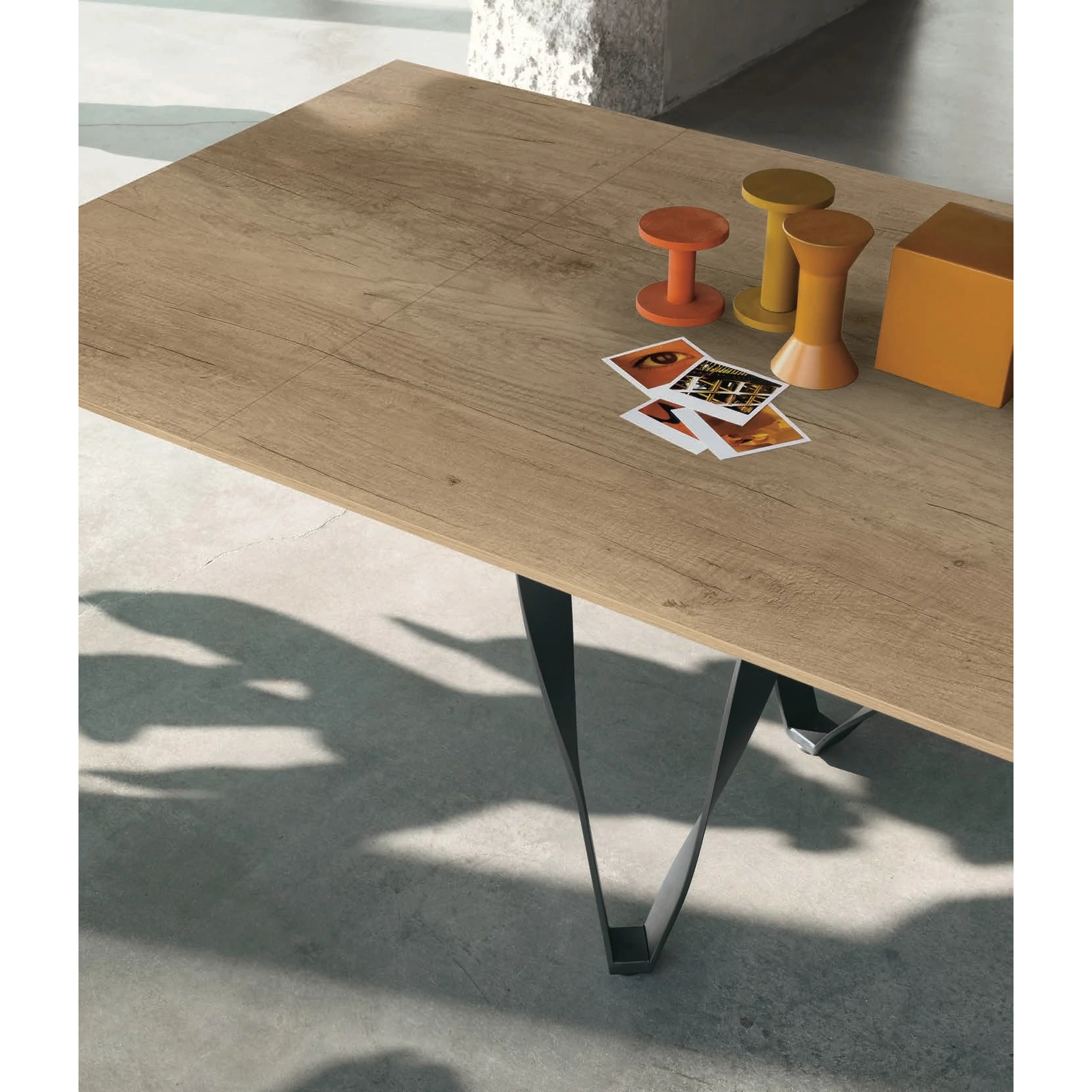 The Wave dining table owes its character to the unique, wave-like leg structure. The bent, intertwined metal elements create a different visual effect from every angle, giving the table a constantly changing presence. Built with a painted metal base, it can be paired with a rectangular or curved tabletop, and its extendable version is available with both the Up System and the One System mechanisms. The tabletop is offered in textured matte, ceramic, or ash wood (only for certain models).