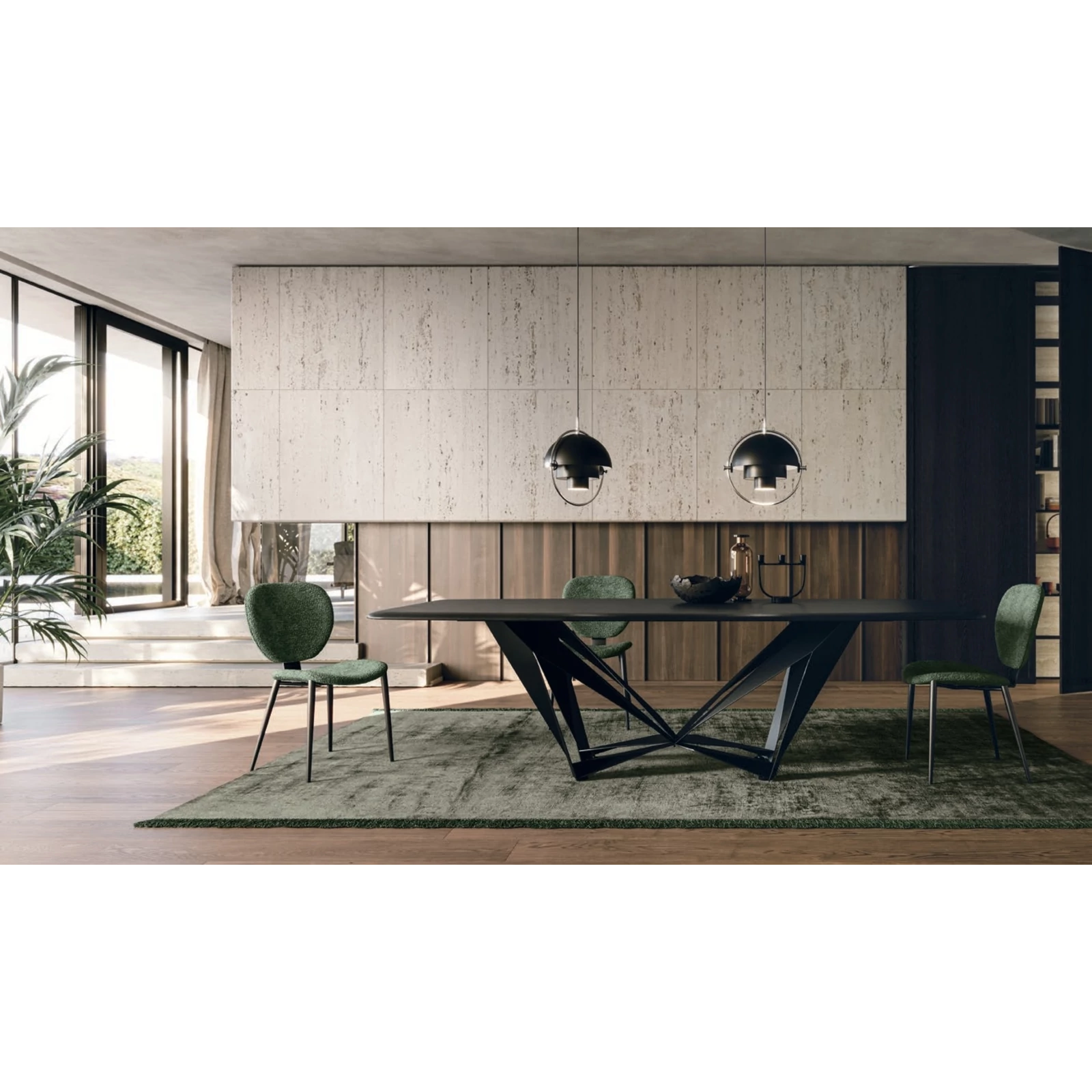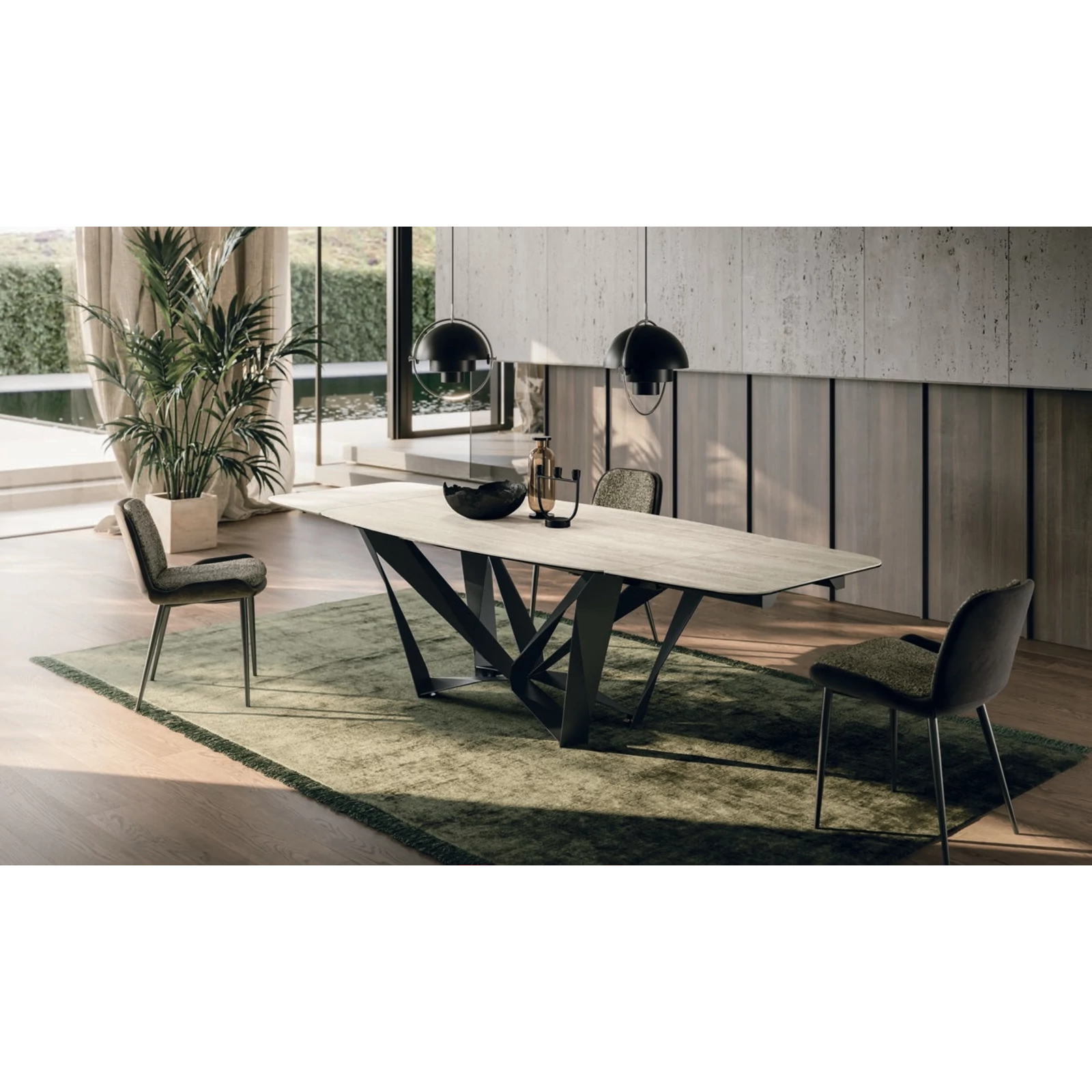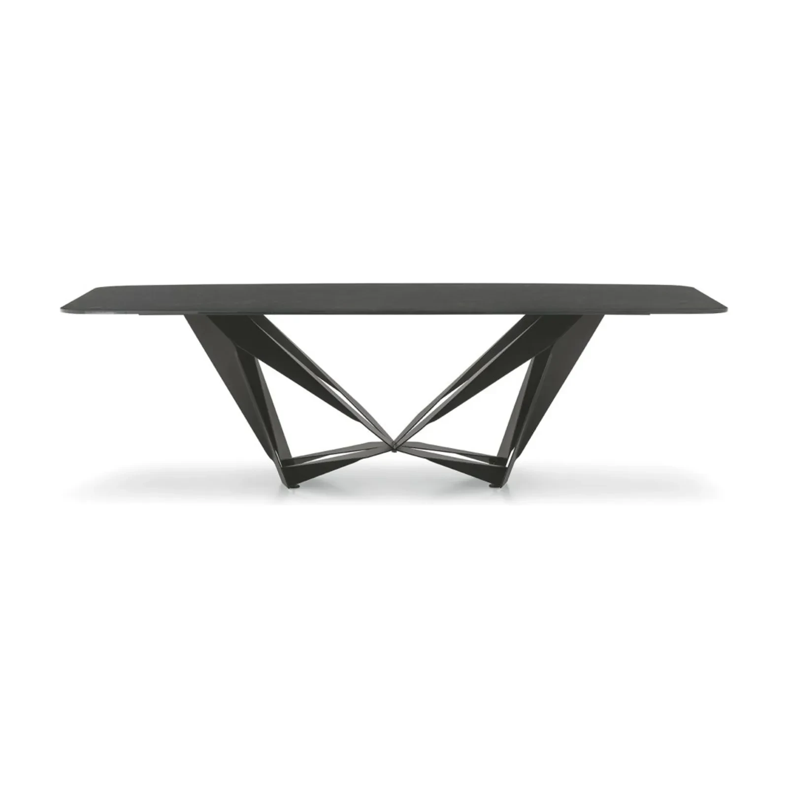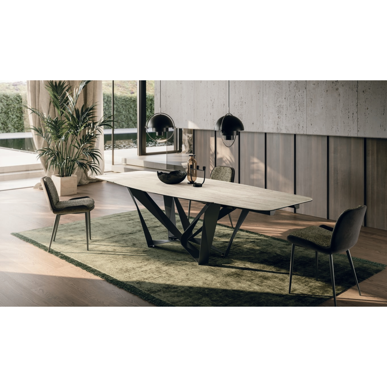 The Papillon dining table’s distinctive base creates a light, floating impression, as metal strips meet at a central joint, making the frame appear almost weightless. It comes with a painted metal base, and its rectangular or curved top is available in textured matte, ceramic, or transparent glass finishes; in the fixed version ash wood veneer is also an option.