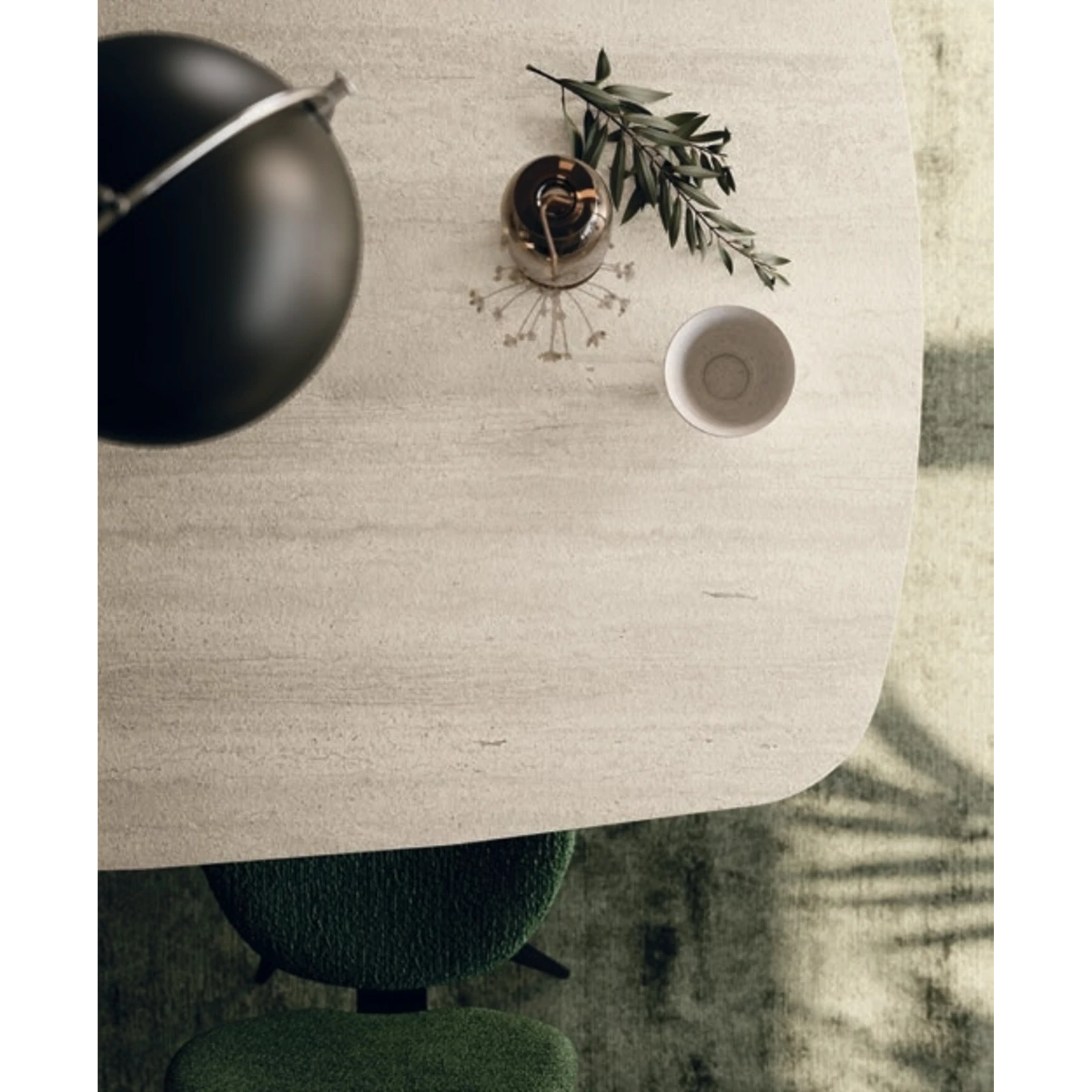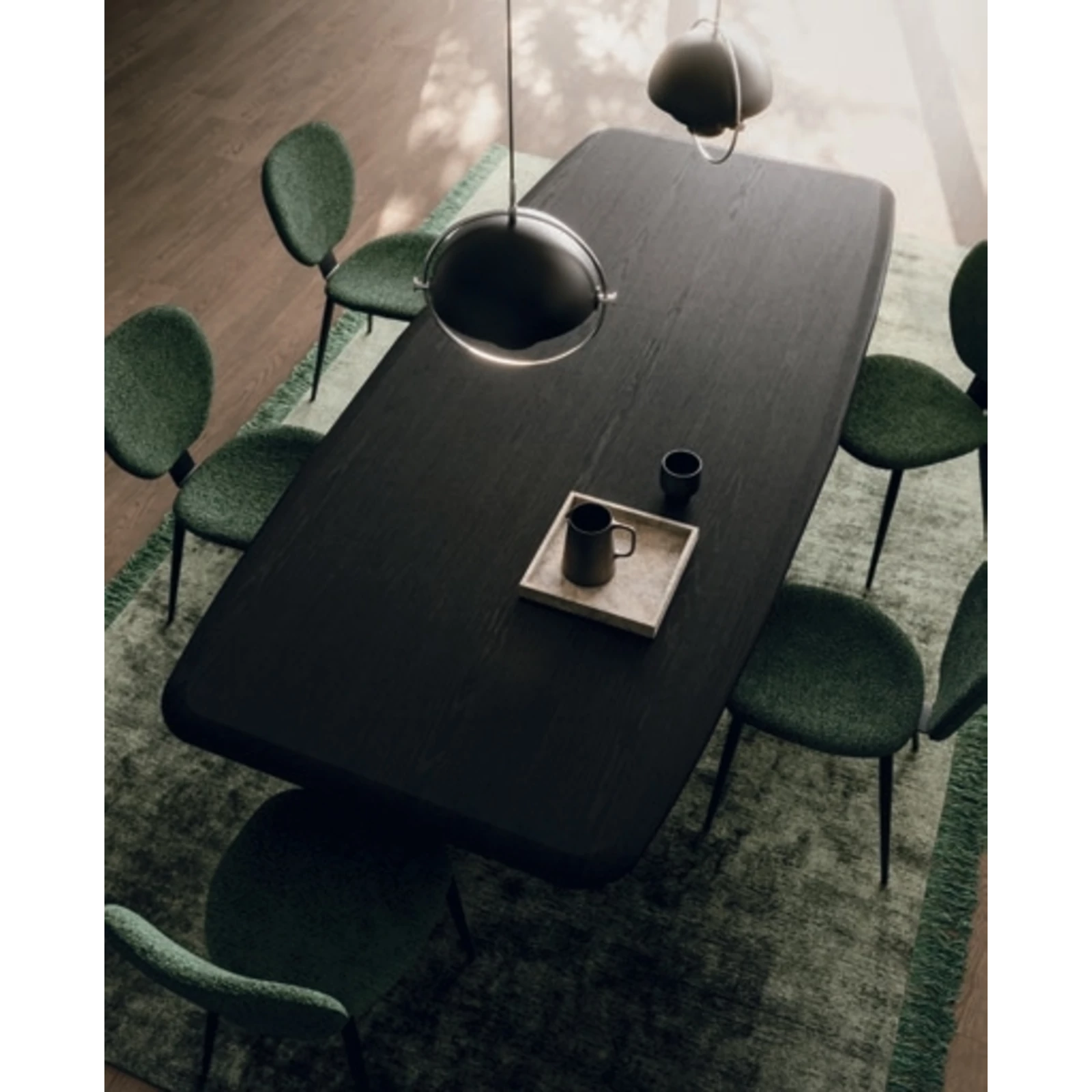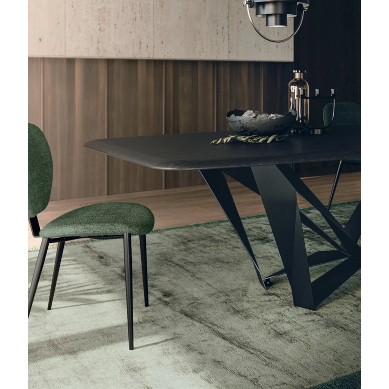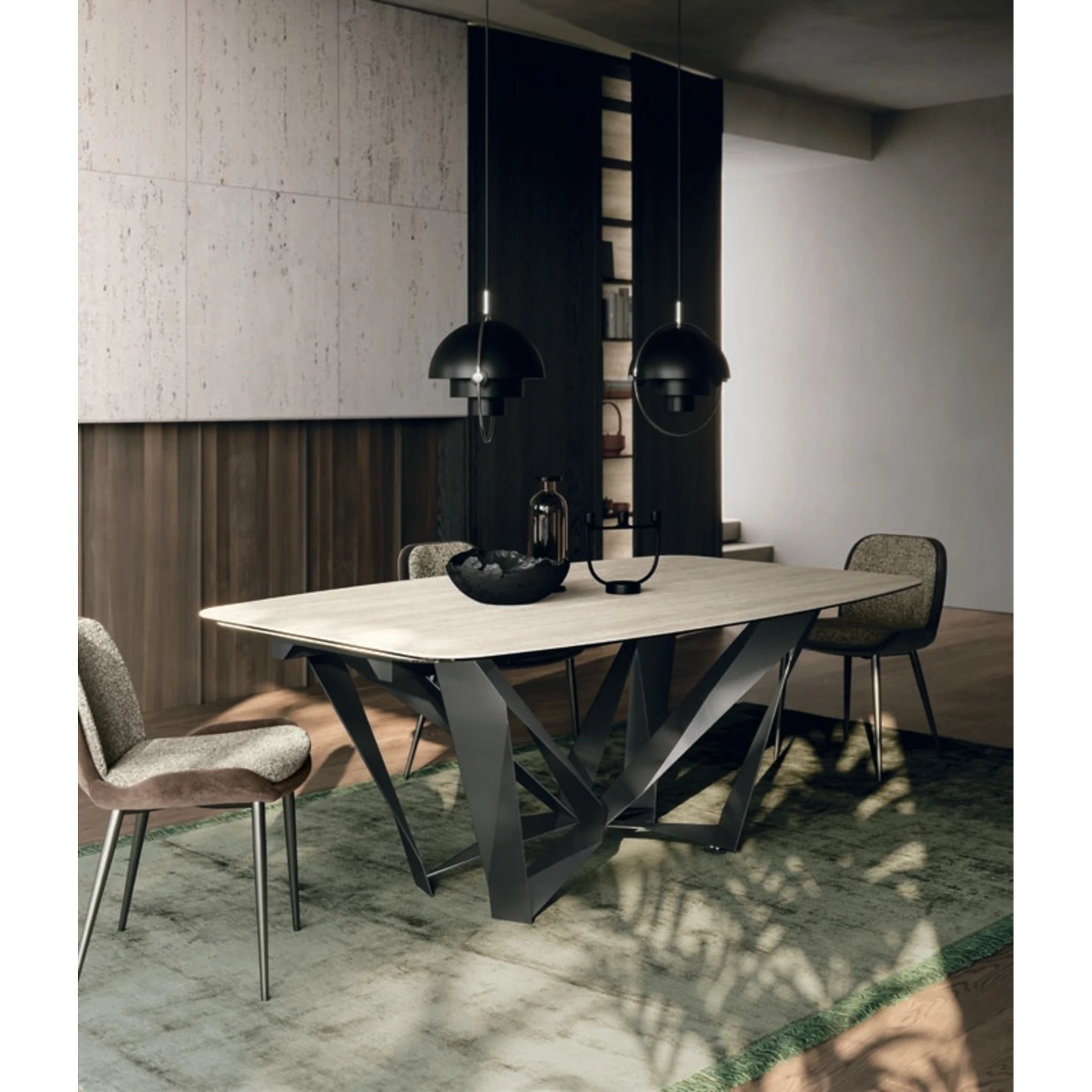 The Papillon dining table’s distinctive base creates a light, floating impression, as metal strips meet at a central joint, making the frame appear almost weightless. It comes with a painted metal base, and its rectangular or curved top is available in textured matte, ceramic, or transparent glass finishes; in the fixed version ash wood veneer is also an option.