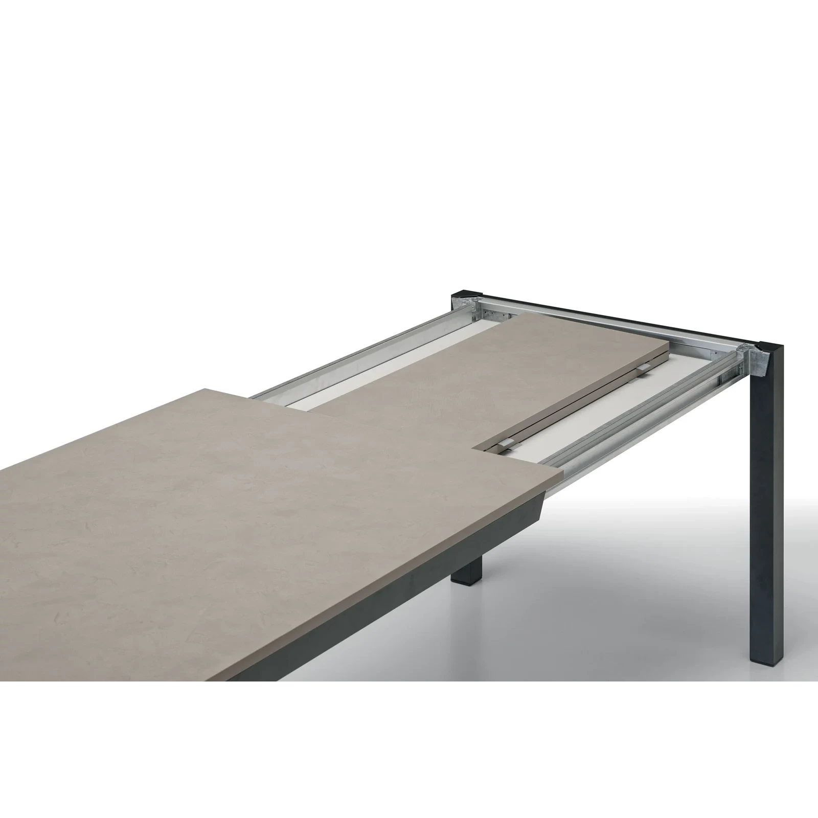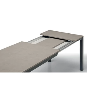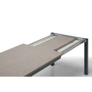 In the case of the Cross System telescopic opening mechanism, the entire frame opens sideways with a smooth sliding motion. The extension elements are stored inside the table and can be fitted to the main top by placing them onto the rails. The table can be extended to various sizes, offering an extremely flexible solution, as it allows the table to be expanded precisely to the size required at any given moment.