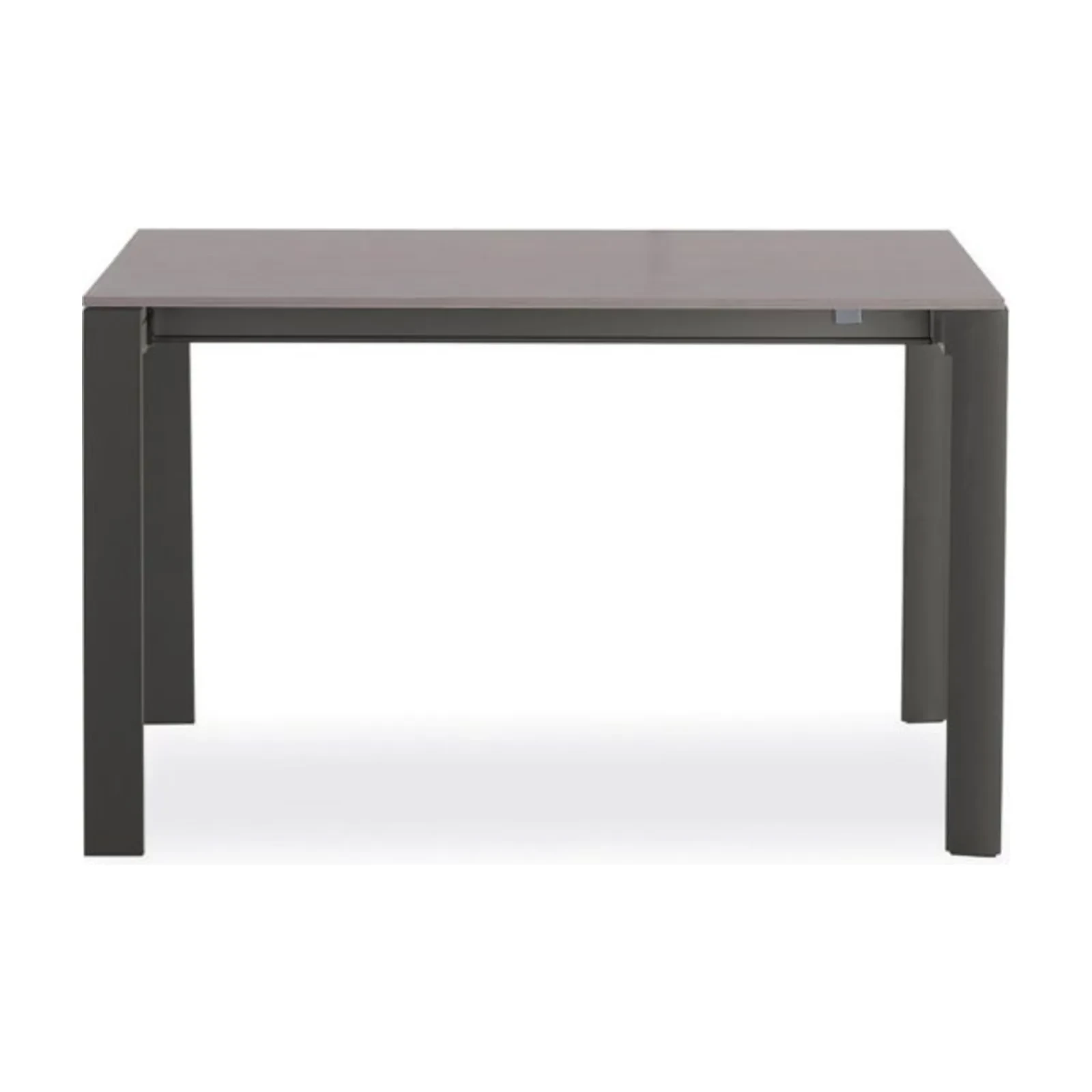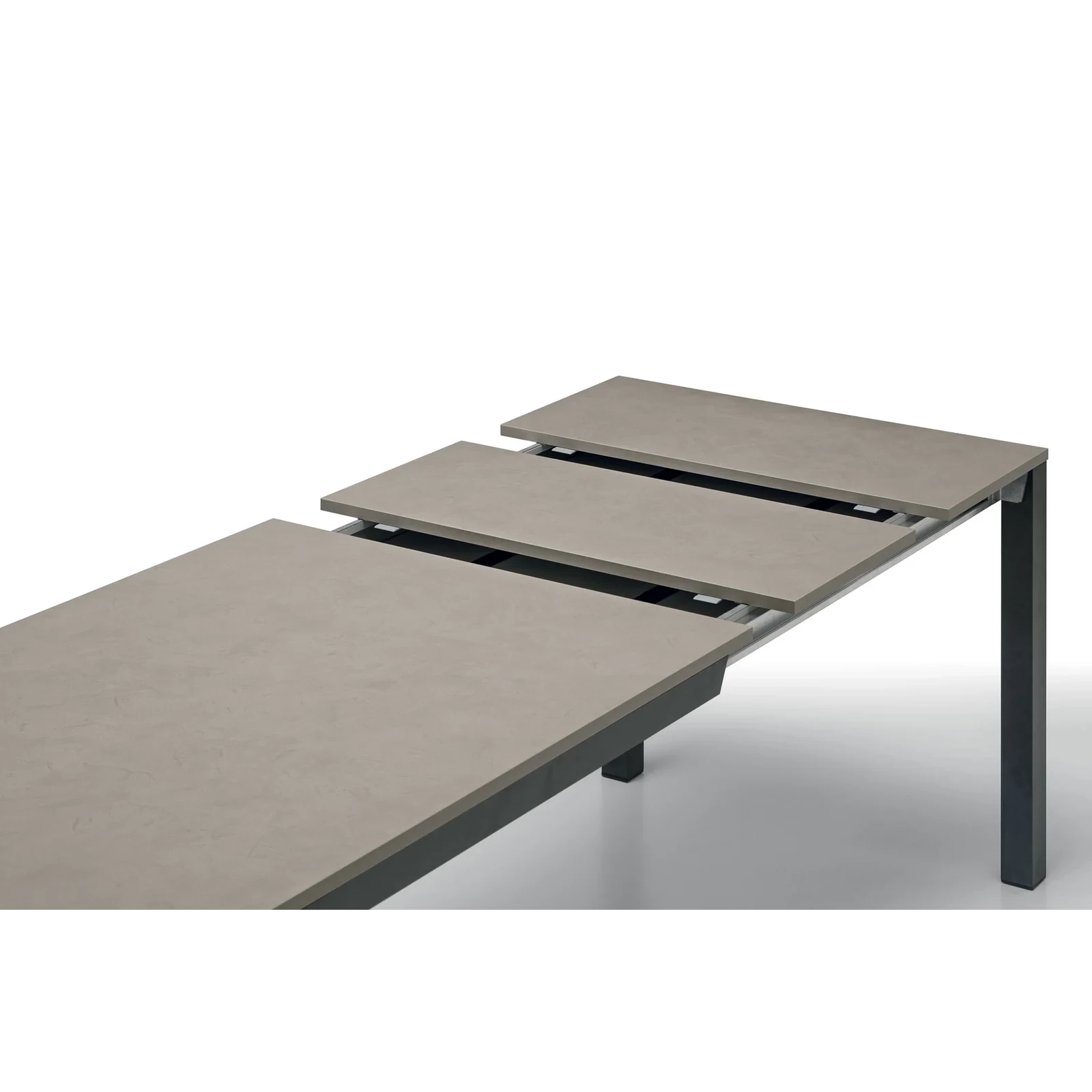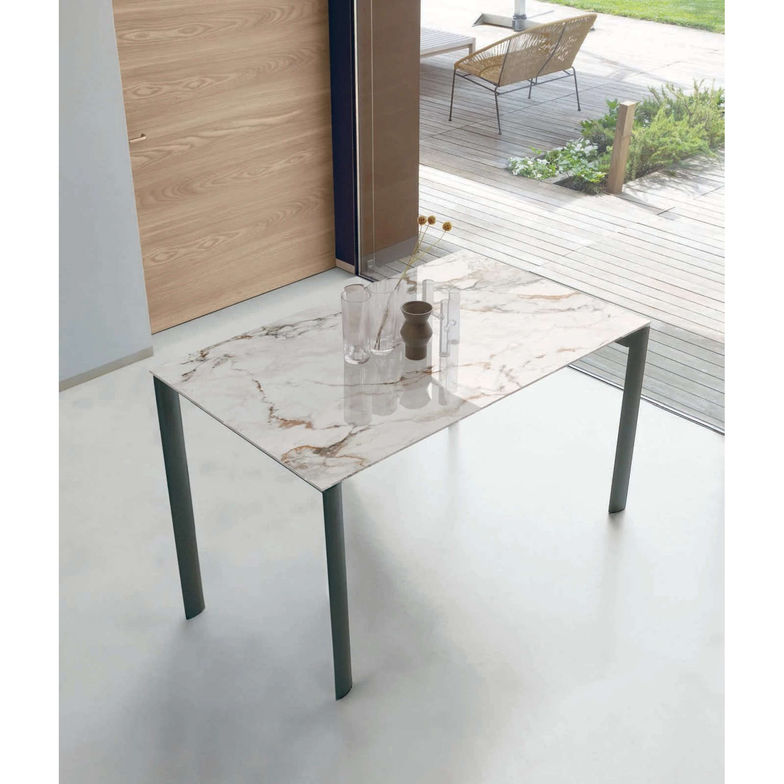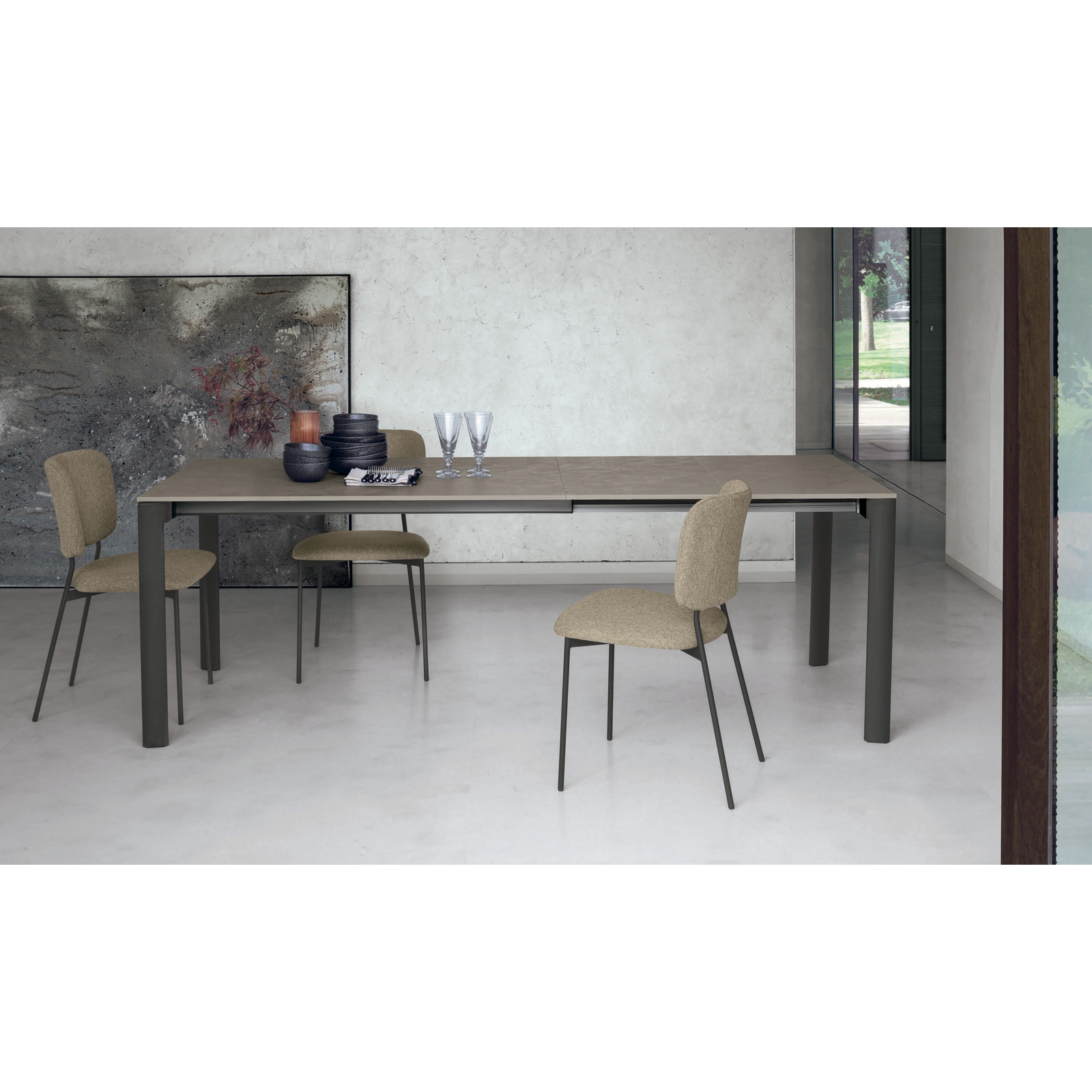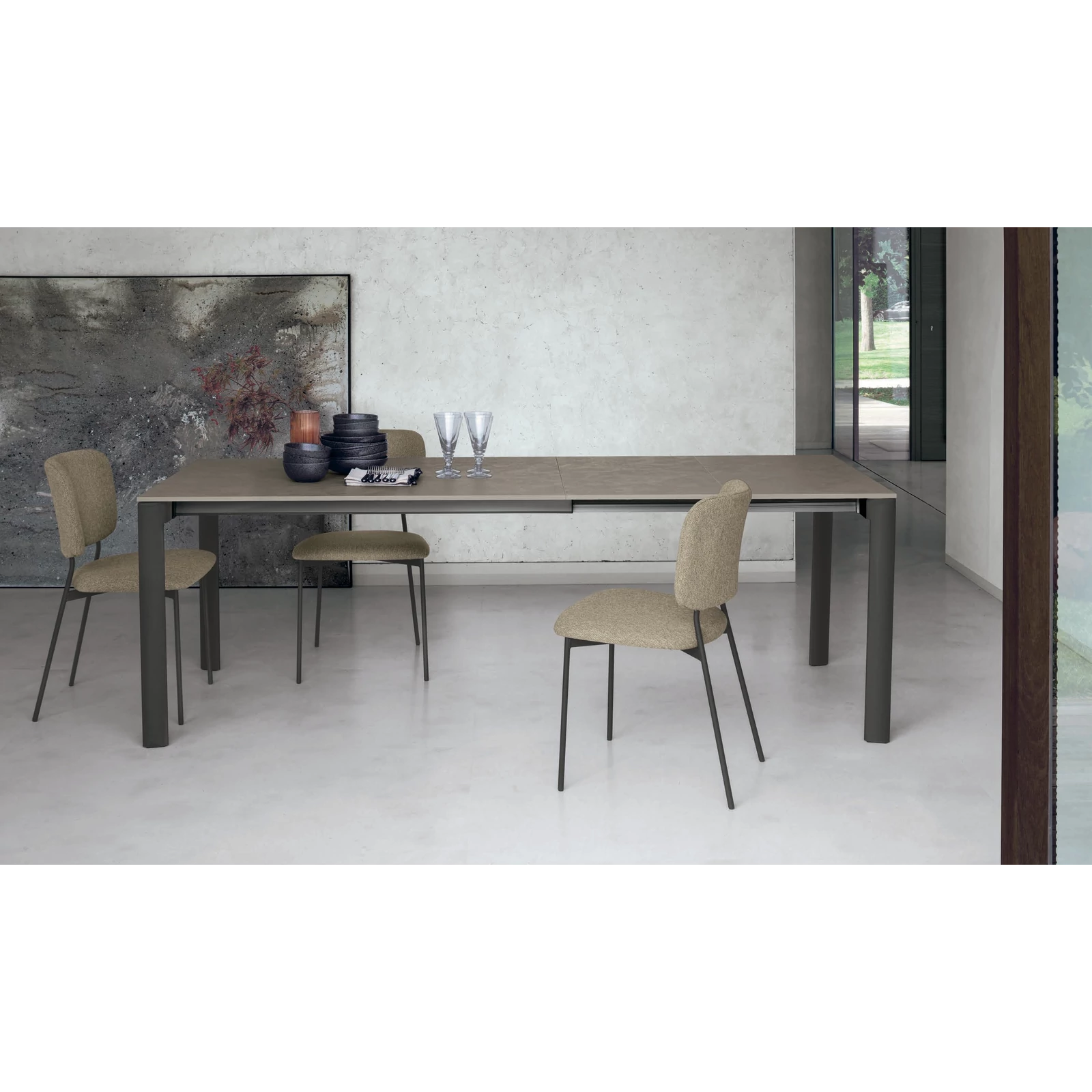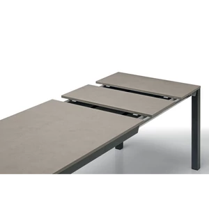 The Podio dining table is a unique combination of soft forms and functional design. This extendable table is available with a painted metal base and rectangular tabletop, while the quick and easy enlargement of the table surface is handled by the Cross System mechanism. The tabletop can be ordered in textured matte, ceramic or printed glass finishes.