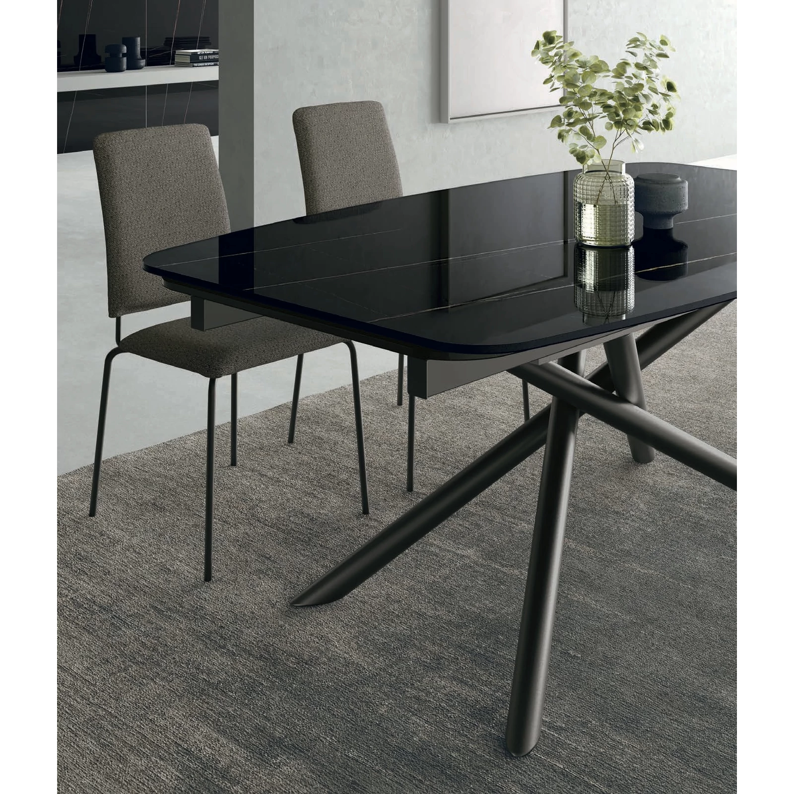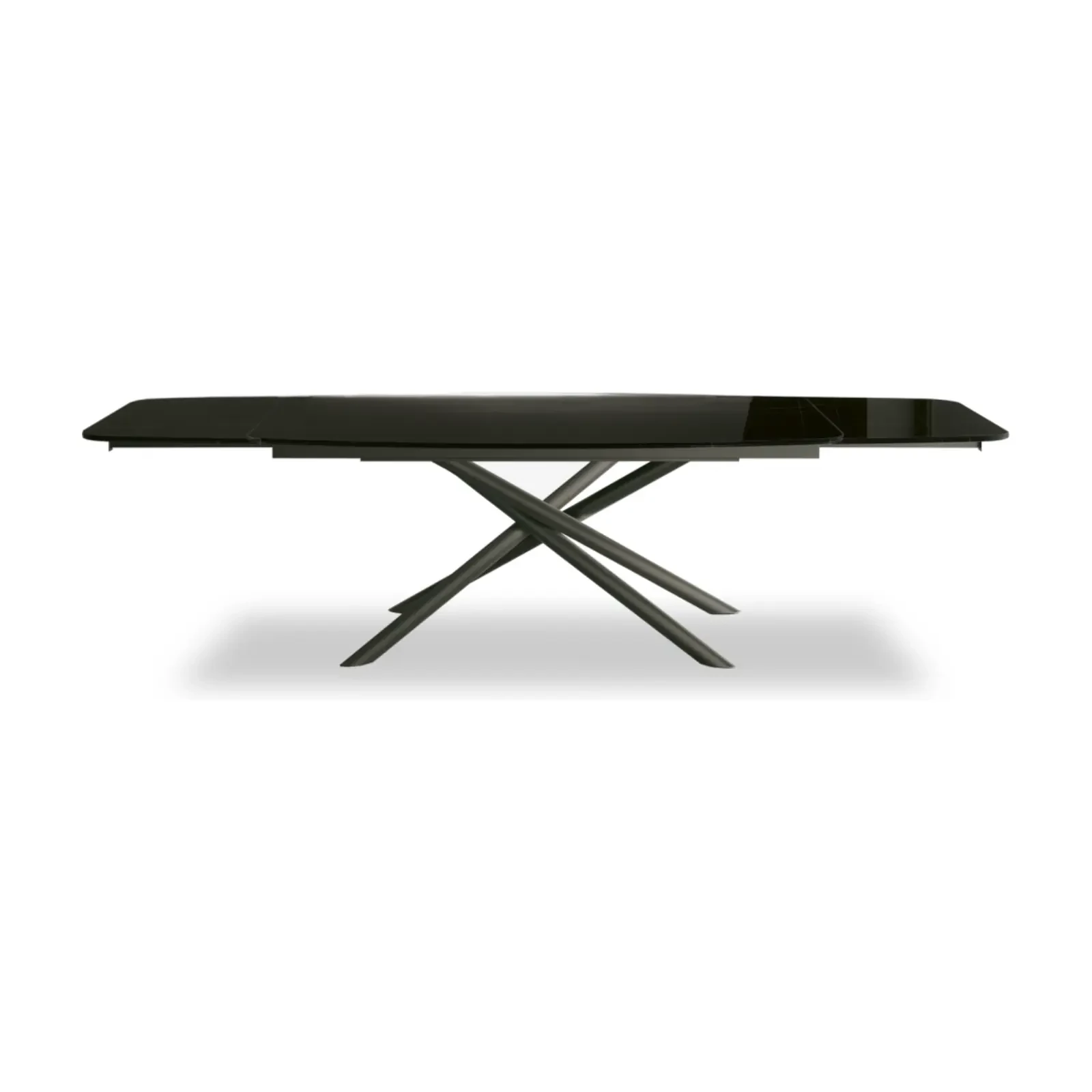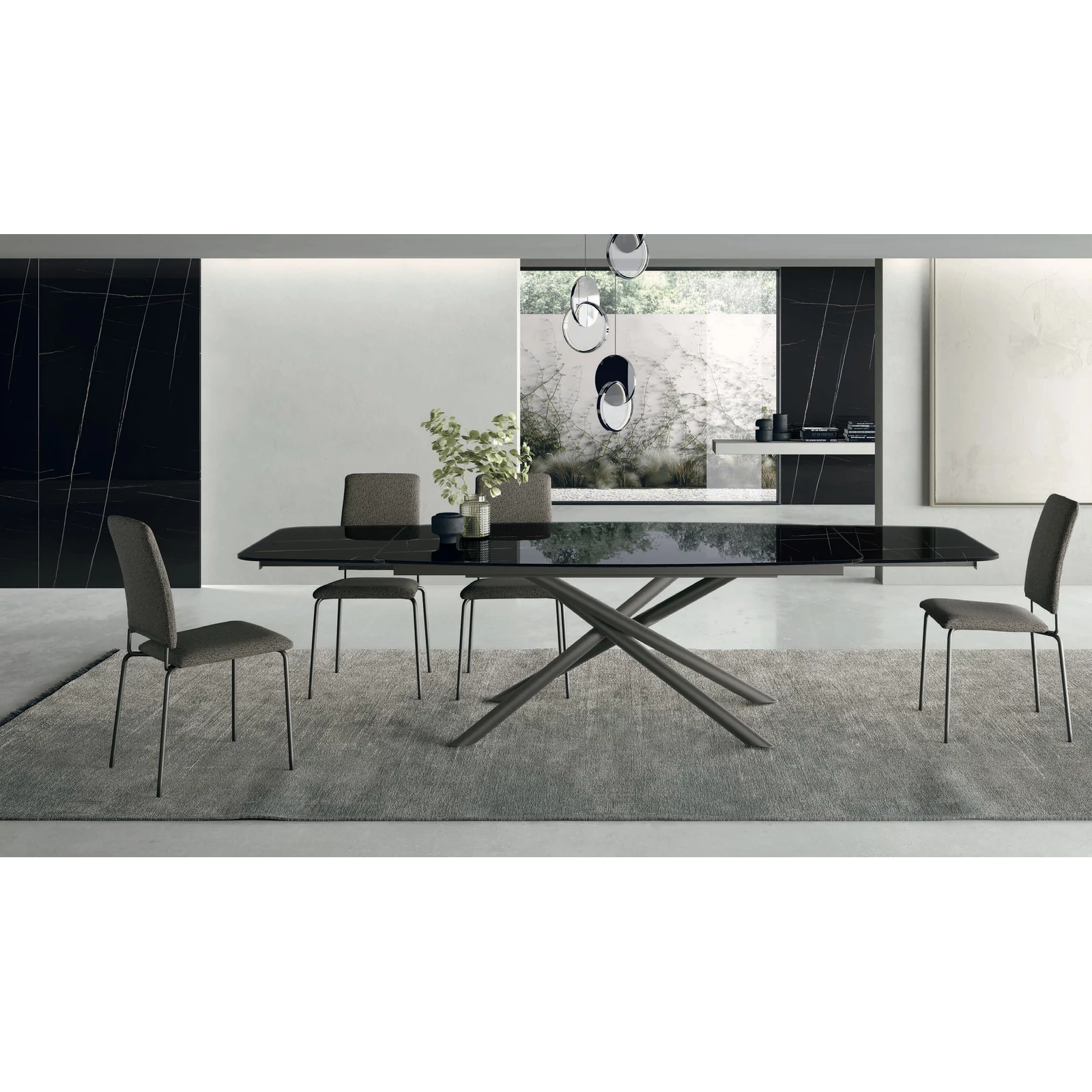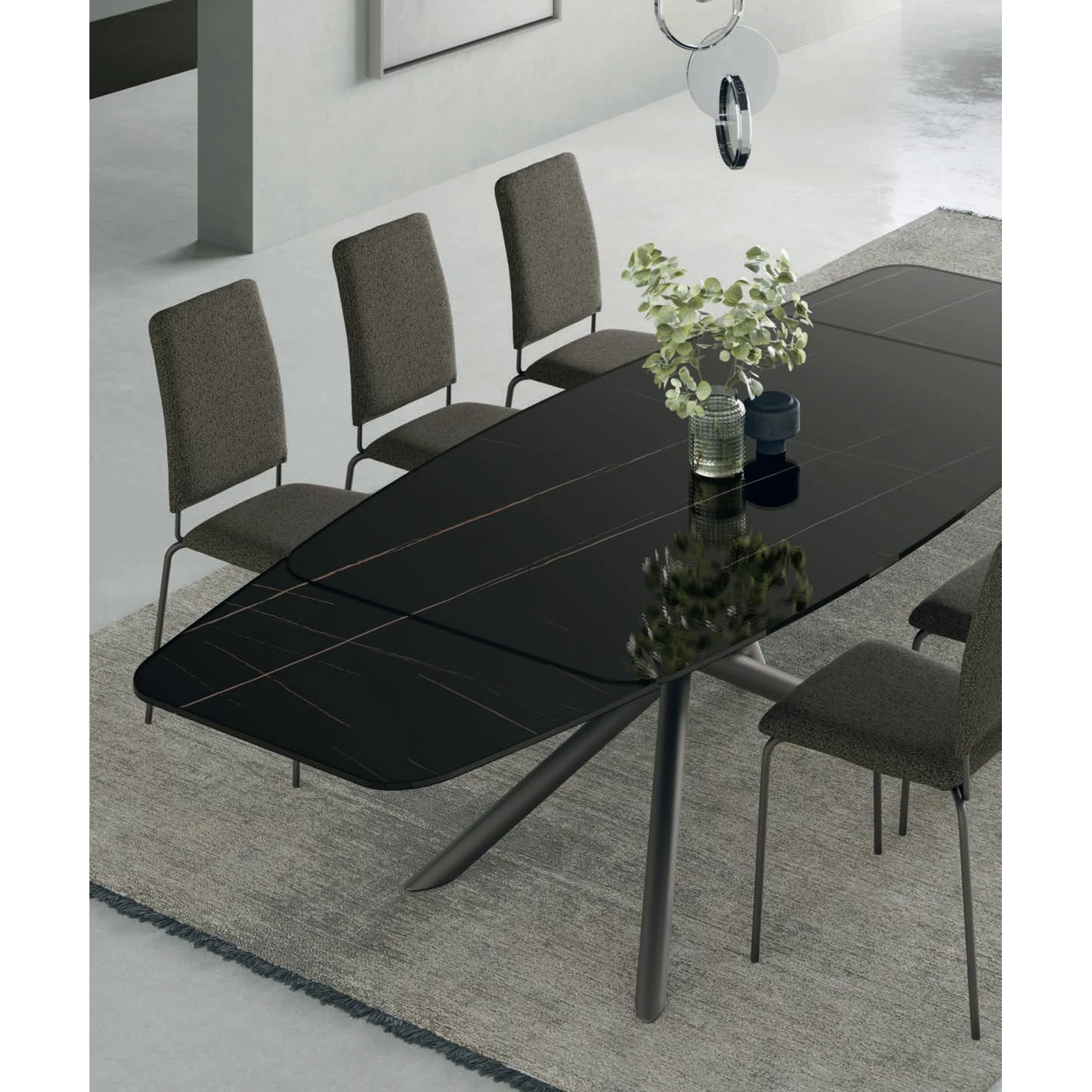 The Glamour dining table's elegance comes from its distinctive, painted metal base and refined surfaces. This extendable table contains the Crono System mechanism, and the tabletop is available in rectangular or curved designs, as well as textured matte, ceramic or printed glass variants.