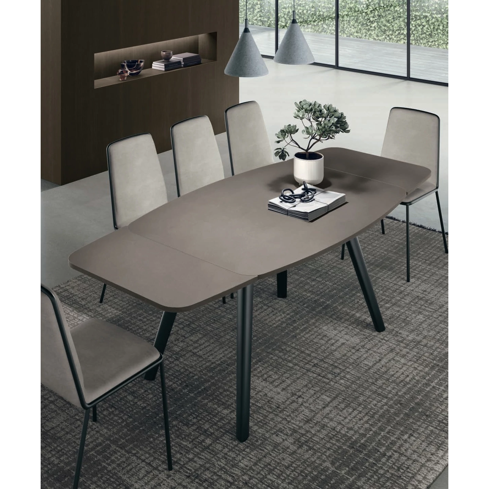 The Zen dining table is the embodiment of harmony and simplicity. This extendable table is made with a painted metal base and Crono System mechanism, with rectangular or curved tabletops. The tabletop can be ordered in textured matte, ceramic or printed glass finishes.